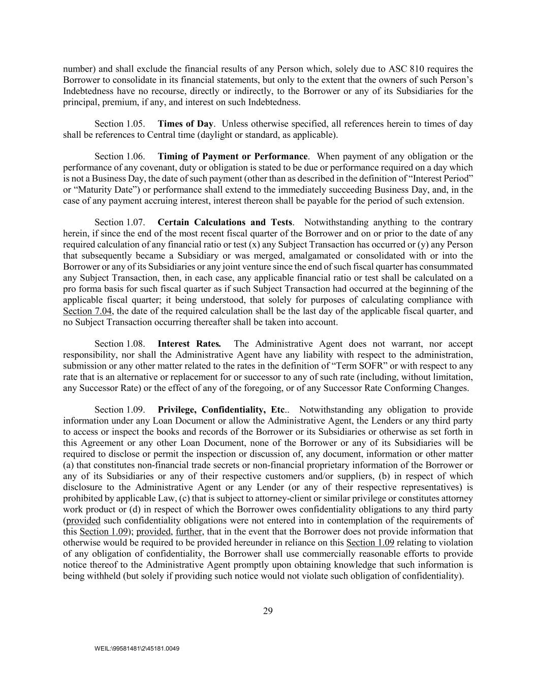 32 WEIL:\99581369\2\44393.0003 2015 to be capitalized, only those leases (assuming for purposes hereof that such leases were in existence on December 31, 2015) that would constitute Capital Leases in conformity with GAAP on December 31, 2015 shall be considered Capital Leases, and all calculations and deliverables under this Agreement or any other Loan Document shall be made or delivered, as applicable, in accordance therewith. (in each case, other than with respect to the financial statements required to be delivered hereunder). Section 1.04. Rounding. Any financial ratios required to be maintained by the Borrower pursuant to this Agreement shall be calculated by dividing the appropriate component by the other component, carrying the result to one place more than the number of places by which such ratio is expressed herein and rounding the result up or down to the nearest number (with a rounding-up if there is no nearest number) and shall exclude the financial results of any Person which, solely due to ASC 810 requires the Borrower to consolidate in its financial statements, but only to the extent that the owners of such Person’s Indebtedness have no recourse, directly or indirectly, to the Borrower or any of its Subsidiaries for the principal, premium, if any, and interest on such Indebtedness. Section 1.05. Times of Day. Unless otherwise specified, all references herein to times of day shall be references to Central time (daylight or standard, as applicable). Section 1.06. Timing of Payment or Performance. When payment of any obligation or the performance of any covenant, duty or obligation is stated to be due or performance required on a day which is not a Business Day, the date of such payment (other than as described in the definition of “Interest Period” or “Maturity Date”) or performance shall extend to the immediately succeeding Business Day, and, in the case of any payment accruing interest, interest thereon shall be payable for the period of such extension. Section 1.07. Certain Calculations and Tests. Notwithstanding anything to the contrary herein, if since the end of the most recent fiscal quarter of the Borrower and on or prior to the date of any required calculation of any financial ratio or test (x) any Subject Transaction has occurred or (y) any Person that subsequently became a Subsidiary or was merged, amalgamated or consolidated with or into the Borrower or any of its Subsidiaries or any joint venture since the end of such fiscal quarter has consummated any Subject Transaction, then, in each case, any applicable financial ratio or test shall be calculated on a pro forma basis for such fiscal quarter as if such Subject Transaction had occurred at the beginning of the applicable fiscal quarter; it being understood, that solely for purposes of calculating compliance with Section 7.09, the date of the required calculation shall be the last day of the applicable fiscal quarter, and no Subject Transaction occurring thereafter shall be taken into account. Section 1.08. Interest Rates. The Administrative Agent does not warrant, nor accept responsibility, nor shall the Administrative Agent have any liability with respect to the administration, submission or any other matter related to the rates in the definition of “Term SOFR” or with respect to any rate that is an alternative or replacement for or successor to any of such rate (including, without limitation, any Successor Rate) or the effect of any of the foregoing, or of any Successor Rate Conforming Changes. Section 1.09. Privilege, Confidentiality, Etc.. Notwithstanding any obligation to provide information under any Loan Document or allow the Administrative Agent, the Lenders or any third party to access or inspect the books and records of the Borrower or its Subsidiaries or otherwise as set forth in this Agreement or any other Loan Document, none of the Borrower or any of its Subsidiaries will be required to disclose or permit the inspection or discussion of, any document, information or other matter (a) that constitutes non-financial trade secrets or non-financial proprietary information of the Borrower or any of its Subsidiaries or any of their respective customers and/or suppliers, (b) in respect of which disclosure to the Administrative Agent or any Lender (or any of their respective representatives) is