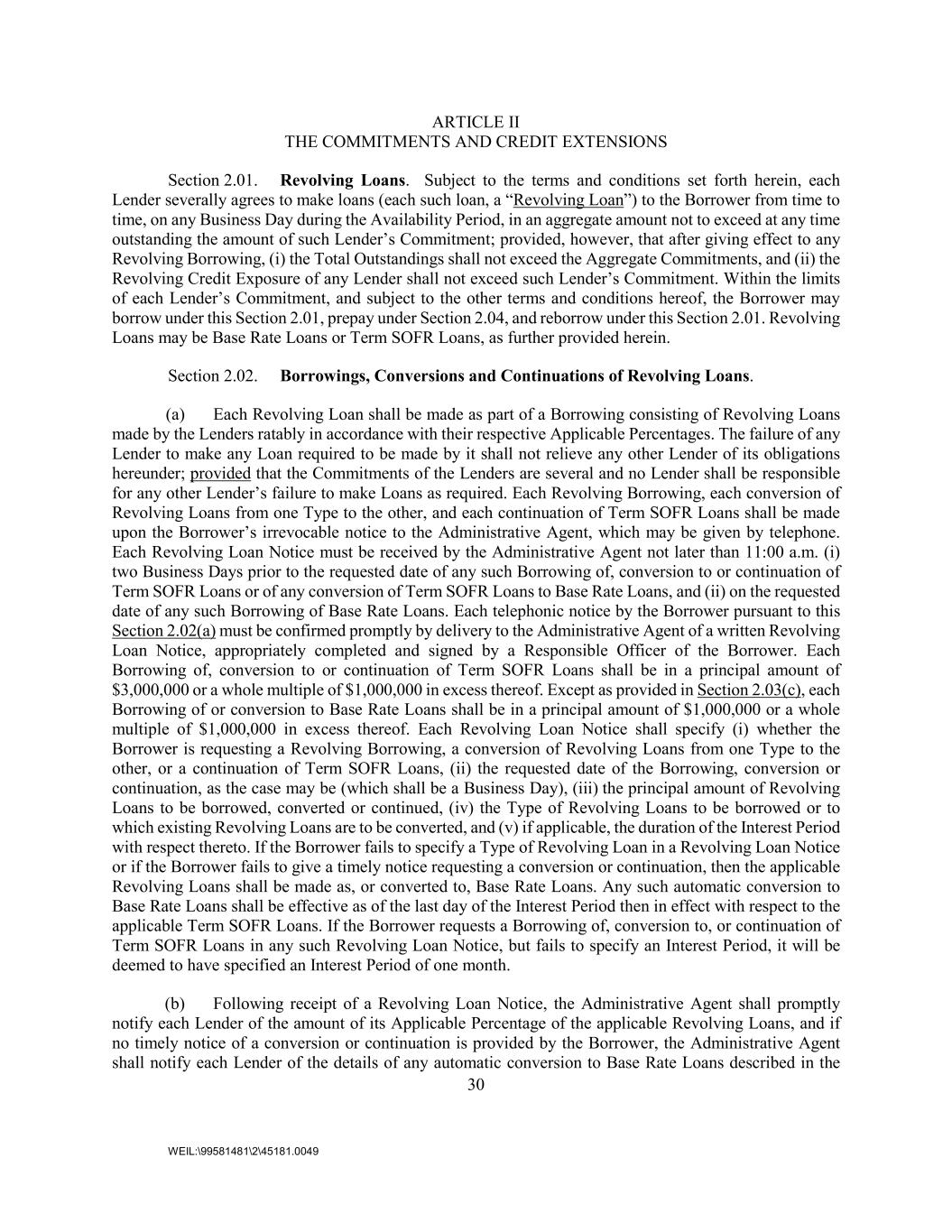 33 WEIL:\99581369\2\44393.0003 prohibited by applicable Law, (c) that is subject to attorney-client or similar privilege or constitutes attorney work product or (d) in respect of which the Borrower owes confidentiality obligations to any third party (provided such confidentiality obligations were not entered into in contemplation of the requirements of this Section 1.09); provided, further, that in the event that the Borrower does not provide information that otherwise would be required to be provided hereunder in reliance on this Section 1.09 relating to violation of any obligation of confidentiality, the Borrower shall use commercially reasonable efforts to provide notice thereof to the Administrative Agent promptly upon obtaining knowledge that such information is being withheld (but solely if providing such notice would not violate such obligation of confidentiality). ARTICLE II THE COMMITMENTS AND CREDIT EXTENSIONS Section 2.01. Revolving Loans. Subject to the terms and conditions set forth herein, each Lender severally agrees to make loans denominated in Dollars (each such loan, a “Revolving Loan”) to the Borrower from time to time, on any Business Day during the Availability Period, in an aggregate amount not to exceed at any time outstanding the amount of such Lender’s Commitment; provided, however, that after giving effect to any Revolving Borrowing, (i) the Total Outstandings shall not exceed the Aggregate Commitments, and (ii) the Revolving Credit Exposure of any Lender shall not exceed such Lender’s Commitment. Within the limits of each Lender’s Commitment, and subject to the other terms and conditions hereof, the Borrower may borrow under this Section 2.01, prepay under Section 2.04, and reborrow under this Section 2.01. Revolving Loans may be Base Rate Loans or Term SOFR Loans, as further provided herein. Section 2.02. Borrowings, Conversions and Continuations of Revolving Loans. (a) Each Revolving Loan shall be made as part of a Borrowing consisting of Revolving Loans made by the Lenders ratably in accordance with their respective Applicable Percentages. The failure of any Lender to make any Loan required to be made by it shall not relieve any other Lender of its obligations hereunder; provided that the Commitments of the Lenders are several and no Lender shall be responsible for any other Lender’s failure to make Loans as required. Each Revolving Borrowing, each conversion of Revolving Loans from one Type to the other, and each continuation of Term SOFR Loans shall be made upon the Borrower’s irrevocable notice to the Administrative Agent, which may be given by telephone. Each Revolving Loan Notice must be received by the Administrative Agent not later than 11:00 a.m. (i) two Business Days prior to the requested date of any such Borrowing of, conversion to or continuation of Term SOFR Loans or of any conversion of Term SOFR Loans to Base Rate Loans, and (ii) on the requested date of any such Borrowing of Base Rate Loans. Each telephonic notice by the Borrower pursuant to this Section 2.02(a) must be confirmed promptly by delivery to the Administrative Agent of a written Revolving Loan Notice, appropriately completed and signed by a Responsible Officer of the Borrower. Each Borrowing of, conversion to or continuation of Term SOFR Loans shall be in a principal amount of $3,000,000 or a whole multiple of $1,000,000 in excess thereof. Except as provided in Section 2.03(c), each Borrowing of or conversion to Base Rate Loans shall be in a principal amount of $1,000,000 or a whole multiple of $1,000,000 in excess thereof. Each Revolving Loan Notice shall specify (i) whether the Borrower is requesting a Revolving Borrowing, a conversion of Revolving Loans from one Type to the other, or a continuation of Term SOFR Loans, (ii) the requested date of the Borrowing, conversion or continuation, as the case may be (which shall be a Business Day), (iii) the principal amount of Revolving Loans to be borrowed, converted or continued, (iv) the Type of Revolving Loans to be borrowed or to which existing Revolving Loans are to be converted, and (v) if applicable, the duration of the Interest Period with respect thereto. If the Borrower fails to specify a Type of Revolving Loan in a Revolving Loan Notice or if the Borrower fails to give a timely notice requesting a conversion or continuation, then the applicable