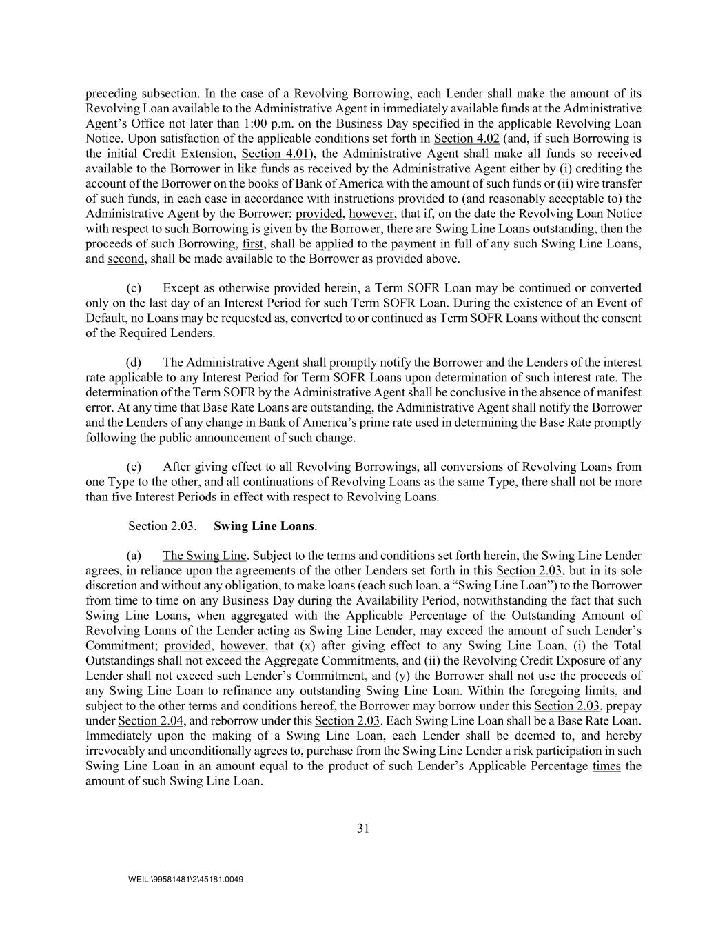 34 WEIL:\99581369\2\44393.0003 Revolving Loans shall be made as, or converted to, Base Rate Loans. Any such automatic conversion to Base Rate Loans shall be effective as of the last day of the Interest Period then in effect with respect to the applicable Term SOFR Loans. If the Borrower requests a Borrowing of, conversion to, or continuation of Term SOFR Loans in any such Revolving Loan Notice, but fails to specify an Interest Period, it will be deemed to have specified an Interest Period of one month. (b) Following receipt of a Revolving Loan Notice, the Administrative Agent shall promptly notify each Lender of the amount of its Applicable Percentage of the applicable Revolving Loans, and if no timely notice of a conversion or continuation is provided by the Borrower, the Administrative Agent shall notify each Lender of the details of any automatic conversion to Base Rate Loans described in the preceding subsection. In the case of a Revolving Borrowing, each Lender shall make the amount of its Revolving Loan available to the Administrative Agent in immediately available funds at the Administrative Agent’s Office not later than 1:00 p.m. on the Business Day specified in the applicable Revolving Loan Notice. Upon satisfaction of the applicable conditions set forth in Section 4.02 (and, if such Borrowing is the initial Credit Extension, Section 4.01), the Administrative Agent shall make all funds so received available to the Borrower in like funds as received by the Administrative Agent either by (i) crediting the account of the Borrower on the books of Bank of America with the amount of such funds or (ii) wire transfer of such funds, in each case in accordance with instructions provided to (and reasonably acceptable to) the Administrative Agent by the Borrower; provided, however, that if, on the date the Revolving Loan Notice with respect to such Borrowing is given by the Borrower, there are Swing Line Loans or L/C Reimbursement Loans outstanding, then the proceeds of such Borrowing, first, shall be applied to the payment in full of any such Swing Line Loans and L/C Reimbursement Loans, and second, shall be made available to the Borrower as provided above. (c) Except as otherwise provided herein, a Term SOFR Loan may be continued or converted only on the last day of an Interest Period for such Term SOFR Loan. During the existence of an Event of Default, no Loans may be requested as, converted to or continued as Term SOFR Loans without the consent of the Required Lenders. (d) The Administrative Agent shall promptly notify the Borrower and the Lenders of the interest rate applicable to any Interest Period for Term SOFR Loans upon determination of such interest rate. The determination of the Term SOFR by the Administrative Agent shall be conclusive in the absence of manifest error. At any time that Base Rate Loans are outstanding, the Administrative Agent shall notify the Borrower and the Lenders of any change in Bank of America’s prime rate used in determining the Base Rate promptly following the public announcement of such change. (e) After giving effect to all Revolving Borrowings, all conversions of Revolving Loans from one Type to the other, and all continuations of Revolving Loans as the same Type, there shall not be more than five Interest Periods in effect with respect to Revolving Loans. Section 2.03. Swing Line Loans. (a) The Swing Line. Subject to the terms and conditions set forth herein, the Swing Line Lender agrees, in reliance upon the agreements of the other Lenders set forth in this Section 2.03, but in its sole discretion and without any obligation, to make loans (each such loan, a “Swing Line Loan”) to the Borrower from time to time on any Business Day during the Availability Period, notwithstanding the fact that such Swing Line Loans, when aggregated with the Applicable Percentage of the Outstanding Amount of Revolving Loans of the Lender acting as Swing Line Lender, may exceed the amount of such Lender’s Commitment; provided, however, that (x) after giving effect to any Swing Line Loan, (i) the Total
