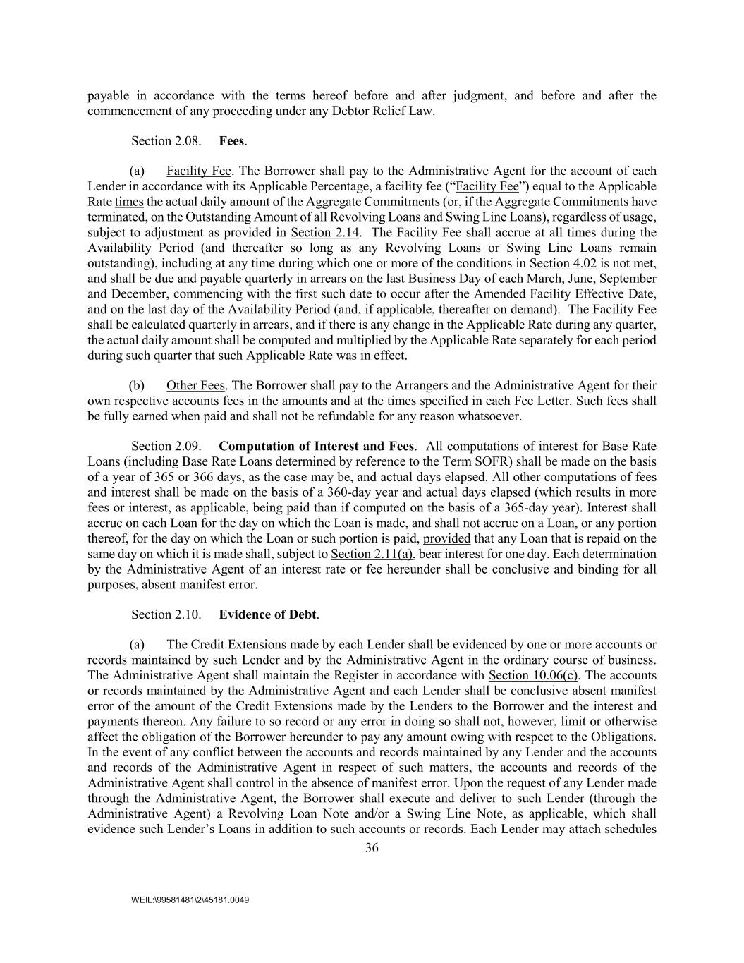 39 WEIL:\99581369\2\44393.0003 outstanding principal amount thereof from the applicable borrowing date at a rate per annum equal to the Base Rate plus the Applicable Rate. (b) (i) If any amount of principal of any Loan is not paid when due (without regard to any applicable grace periods), whether at stated maturity, by acceleration or otherwise, then upon the request of the Required Lenders, such amount shall thereafter bear interest at a fluctuating interest rate per annum at all times equal to the Default Rate to the fullest extent permitted by applicable Laws. (ii) If any amount (other than principal of any Loan) payable by the Borrower under any Loan Document is not paid when due (without regard to any applicable grace periods), whether at stated maturity, by acceleration or otherwise, then upon the request of the Required Lenders, such amount shall thereafter bear interest at a fluctuating interest rate per annum at all times equal to the Default Rate to the fullest extent permitted by applicable Laws. (iii) Upon the request of the Required Lenders, while any Event of Default exists (other than as set forth in clauses (b)(i) and (b)(ii) above), the Borrower shall pay interest on the principal amount of all outstanding Obligations hereunder at a fluctuating interest rate per annum at all times equal to the Default Rate to the fullest extent permitted by applicable Laws. (iv) Accrued and unpaid interest on past due amounts (including interest on past due interest) shall be due and payable upon demand. (c) Interest on each Loan shall be due and payable in arrears on each Interest Payment Date applicable thereto and at such other times as may be specified herein. Interest hereunder shall be due and payable in accordance with the terms hereof before and after judgment, and before and after the commencement of any proceeding under any Debtor Relief Law. Section 2.08. Fees. (a) Facility Fee. The Borrower shall pay to the Administrative Agent for the account of each Lender in accordance with its Applicable Percentage, a facility fee (“Facility Fee”) equal to the Applicable Rate times the actual daily amount of the Aggregate Commitments (or, if the Aggregate Commitments have terminated, on the Outstanding Amount of all Revolving Loans and Swing Line Loans), regardless of usage, subject to adjustment as provided in Section 2.14. The Facility Fee shall accrue at all times during the Availability Period (and thereafter so long as any Revolving Loans or Swing Line Loans remain outstanding), including at any time during which one or more of the conditions in Section 4.02 is not met, and shall be due and payable quarterly in arrears on the last Business Day of each March, June, September and December, commencing with the first such date to occur after the Effective Date, and on the last day of the Availability Period (and, if applicable, thereafter on demand). The Facility Fee shall be calculated quarterly in arrears, and if there is any change in the Applicable Rate during any quarter, the actual daily amount shall be computed and multiplied by the Applicable Rate separately for each period during such quarter that such Applicable Rate was in effect. (b) Other Fees. The Borrower shall pay to the Arrangers and the Administrative Agent for their own respective accounts fees in the amounts and at the times specified in each Fee Letter. Such fees shall be fully earned when paid and shall not be refundable for any reason whatsoever. Section 2.09. Computation of Interest and Fees. All computations of interest for Base Rate Loans (including Base Rate Loans determined by reference to the Term SOFR) shall be made on the basis