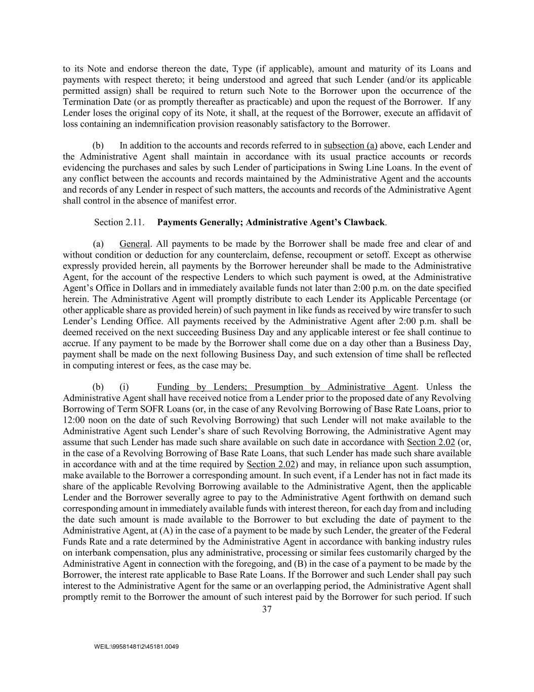 40 WEIL:\99581369\2\44393.0003 of a year of 365 or 366 days, as the case may be, and actual days elapsed. All other computations of fees and interest shall be made on the basis of a 360-day year and actual days elapsed (which results in more fees or interest, as applicable, being paid than if computed on the basis of a 365-day year). Interest shall accrue on each Loan for the day on which the Loan is made, and shall not accrue on a Loan, or any portion thereof, for the day on which the Loan or such portion is paid, provided that any Loan that is repaid on the same day on which it is made shall, subject to Section 2.11(a), bear interest for one day. Each determination by the Administrative Agent of an interest rate or fee hereunder shall be conclusive and binding for all purposes, absent manifest error. Section 2.10. Evidence of Debt. (a) The Credit Extensions made by each Lender shall be evidenced by one or more accounts or records maintained by such Lender and by the Administrative Agent in the ordinary course of business. The Administrative Agent shall maintain the Register in accordance with Section 10.06(c). The accounts or records maintained by the Administrative Agent and each Lender shall be conclusive absent manifest error of the amount of the Credit Extensions made by the Lenders to the Borrower and the interest and payments thereon. Any failure to so record or any error in doing so shall not, however, limit or otherwise affect the obligation of the Borrower hereunder to pay any amount owing with respect to the Obligations. In the event of any conflict between the accounts and records maintained by any Lender and the accounts and records of the Administrative Agent in respect of such matters, the accounts and records of the Administrative Agent shall control in the absence of manifest error. Upon the request of any Lender made through the Administrative Agent, the Borrower shall execute and deliver to such Lender (through the Administrative Agent) a Revolving Loan Note and/or a Swing Line Note, as applicable, which shall evidence such Lender’s Loans in addition to such accounts or records. Each Lender may attach schedules to its Note and endorse thereon the date, Type (if applicable), amount and maturity of its Loans and payments with respect thereto; it being understood and agreed that such Lender (and/or its applicable permitted assign) shall be required to return such Note to the Borrower upon the occurrence of the Termination Date (or as promptly thereafter as practicable) and upon the request of the Borrower. If any Lender loses the original copy of its Note, it shall, at the request of the Borrower, execute an affidavit of loss containing an indemnification provision reasonably satisfactory to the Borrower. (b) In addition to the accounts and records referred to in subsection (a) above, each Lender and the Administrative Agent shall maintain in accordance with its usual practice accounts or records evidencing the purchases and sales by such Lender of participations in Swing Line Loans. In the event of any conflict between the accounts and records maintained by the Administrative Agent and the accounts and records of any Lender in respect of such matters, the accounts and records of the Administrative Agent shall control in the absence of manifest error. Section 2.11. Payments Generally; Administrative Agent’s Clawback. (a) General. All payments to be made by the Borrower shall be made free and clear of and without condition or deduction for any counterclaim, defense, recoupment or setoff. Except as otherwise expressly provided herein, all payments by the Borrower hereunder shall be made to the Administrative Agent, for the account of the respective Lenders to which such payment is owed, at the Administrative Agent’s Office in Dollars and in immediately available funds not later than 2:00 p.m. on the date specified herein. The Administrative Agent will promptly distribute to each Lender its Applicable Percentage (or other applicable share as provided herein) of such payment in like funds as received by wire transfer to such Lender’s Lending Office. All payments received by the Administrative Agent after 2:00 p.m. shall be deemed received on the next succeeding Business Day and any applicable interest or fee shall continue to