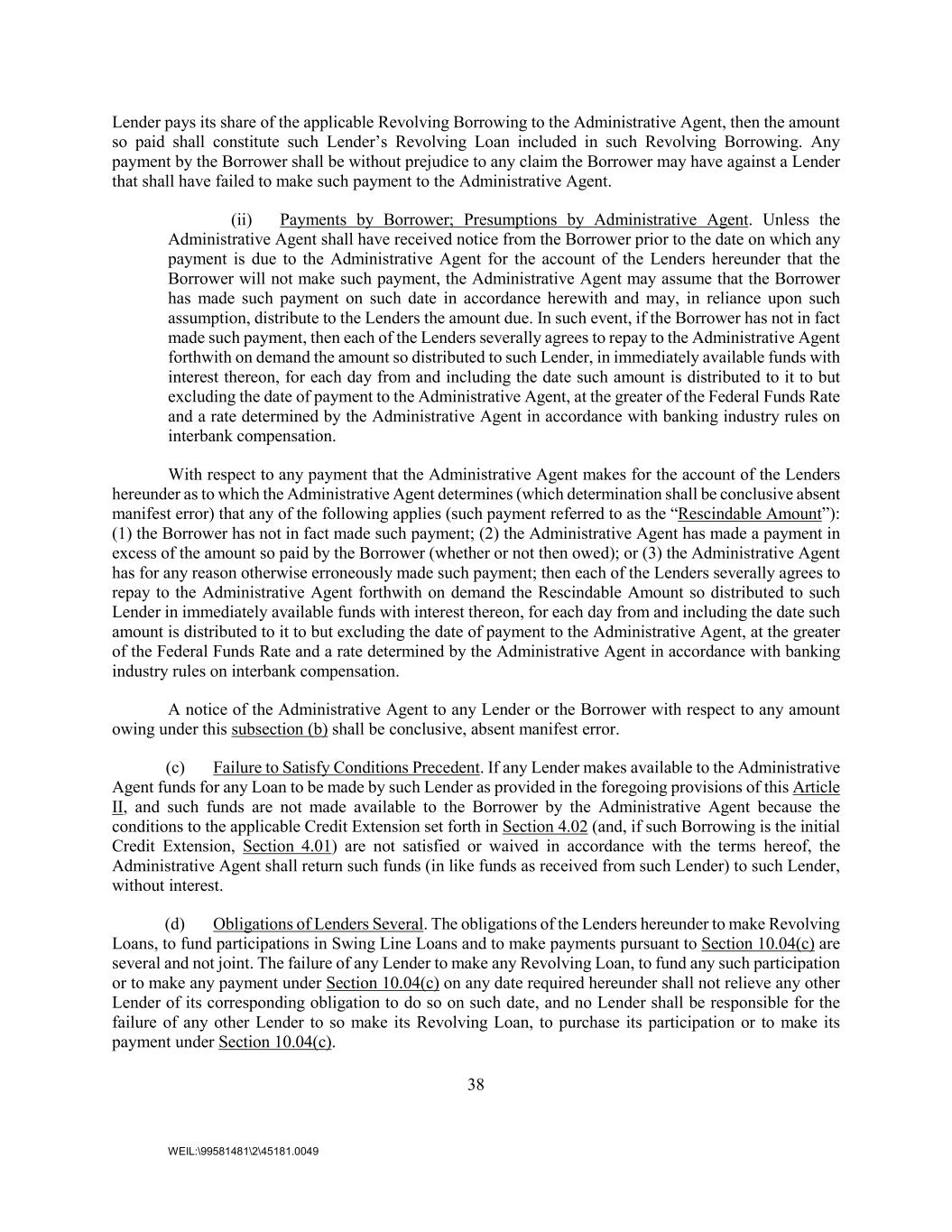 41 WEIL:\99581369\2\44393.0003 accrue. If any payment to be made by the Borrower shall come due on a day other than a Business Day, payment shall be made on the next following Business Day, and such extension of time shall be reflected in computing interest or fees, as the case may be. (b) (i) Funding by Lenders; Presumption by Administrative Agent. Unless the Administrative Agent shall have received notice from a Lender prior to the proposed date of any Revolving Borrowing of Term SOFR Loans (or, in the case of any Revolving Borrowing of Base Rate Loans, prior to 12:00 noon on the date of such Revolving Borrowing) that such Lender will not make available to the Administrative Agent such Lender’s share of such Revolving Borrowing, the Administrative Agent may assume that such Lender has made such share available on such date in accordance with Section 2.02 (or, in the case of a Revolving Borrowing of Base Rate Loans, that such Lender has made such share available in accordance with and at the time required by Section 2.02) and may, in reliance upon such assumption, make available to the Borrower a corresponding amount. In such event, if a Lender has not in fact made its share of the applicable Revolving Borrowing available to the Administrative Agent, then the applicable Lender and the Borrower severally agree to pay to the Administrative Agent forthwith on demand such corresponding amount in immediately available funds with interest thereon, for each day from and including the date such amount is made available to the Borrower to but excluding the date of payment to the Administrative Agent, at (A) in the case of a payment to be made by such Lender, the greater of the Federal Funds Rate and a rate determined by the Administrative Agent in accordance with banking industry rules on interbank compensation, plus any administrative, processing or similar fees customarily charged by the Administrative Agent in connection with the foregoing, and (B) in the case of a payment to be made by the Borrower, the interest rate applicable to Base Rate Loans. If the Borrower and such Lender shall pay such interest to the Administrative Agent for the same or an overlapping period, the Administrative Agent shall promptly remit to the Borrower the amount of such interest paid by the Borrower for such period. If such Lender pays its share of the applicable Revolving Borrowing to the Administrative Agent, then the amount so paid shall constitute such Lender’s Revolving Loan included in such Revolving Borrowing. Any payment by the Borrower shall be without prejudice to any claim the Borrower may have against a Lender that shall have failed to make such payment to the Administrative Agent. (ii) Payments by Borrower; Presumptions by Administrative Agent. Unless the Administrative Agent shall have received notice from the Borrower prior to the date on which any payment is due to the Administrative Agent for the account of the Lenders hereunder that the Borrower will not make such payment, the Administrative Agent may assume that the Borrower has made such payment on such date in accordance herewith and may, in reliance upon such assumption, distribute to the Lenders the amount due. In such event, if the Borrower has not in fact made such payment, then each of the Lenders severally agrees to repay to the Administrative Agent forthwith on demand the amount so distributed to such Lender, in immediately available funds with interest thereon, for each day from and including the date such amount is distributed to it to but excluding the date of payment to the Administrative Agent, at the greater of the Federal Funds Rate and a rate determined by the Administrative Agent in accordance with banking industry rules on interbank compensation. With respect to any payment that the Administrative Agent makes for the account of the Lenders or any L/C Issuer hereunder as to which the Administrative Agent determines (which determination shall be conclusive absent manifest error) that any of the following applies (such payment referred to as the “Rescindable Amount”): (1) the Borrower has not in fact made such payment; (2) the Administrative Agent has made a payment in excess of the amount so paid by the Borrower (whether or not then owed); or (3) the Administrative Agent has for any reason otherwise erroneously made such payment; then each of the
