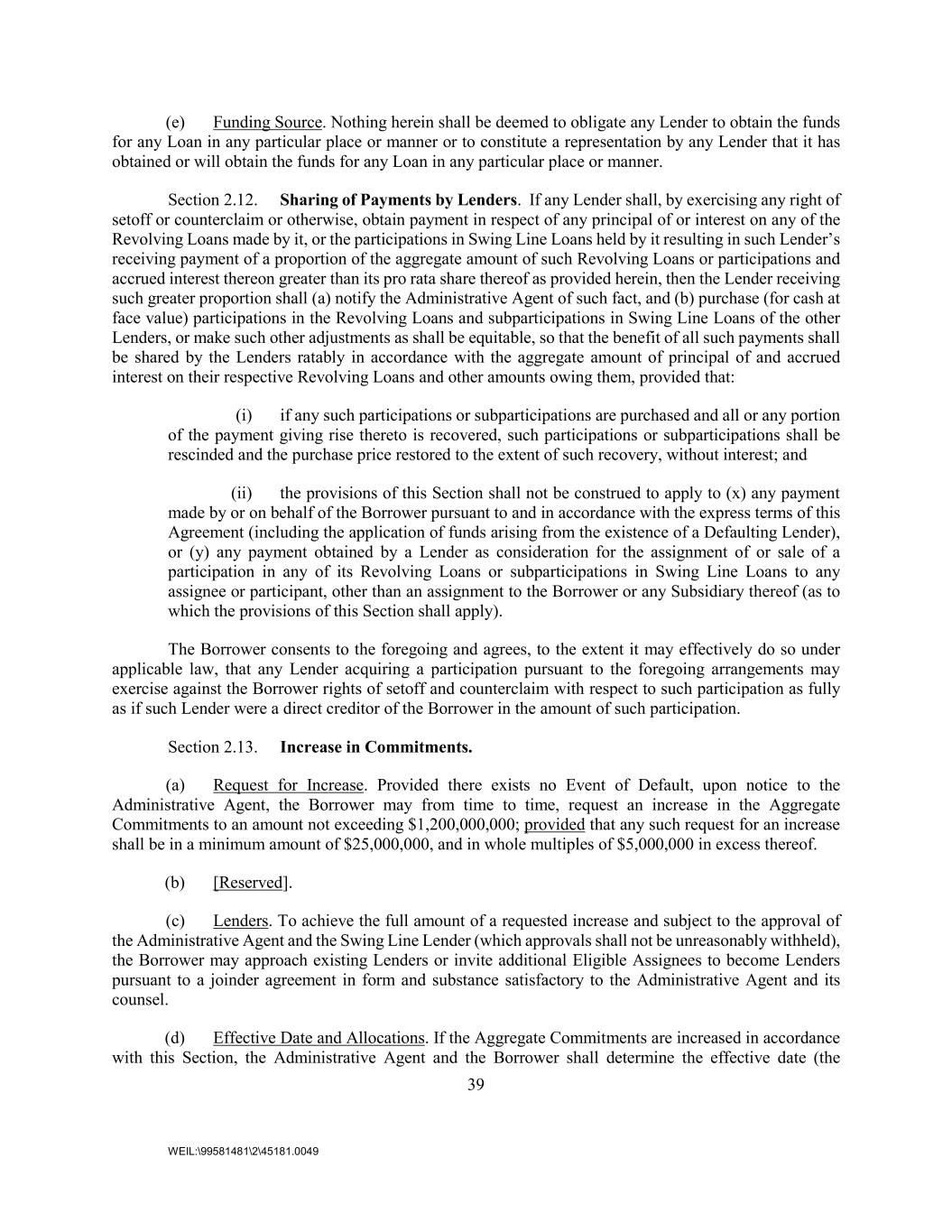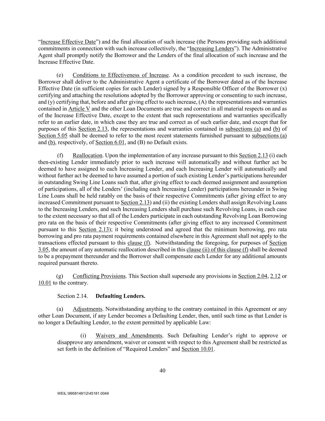 44 WEIL:\99581369\2\44393.0003 deemed to have assigned to each Increasing Lender, and each Increasing Lender will automatically and without further act be deemed to have assumed a portion of such existing Lender’s participations hereunder in outstanding Swing Line Loans and Letters of Credit such that, after giving effect to each deemed assignment and assumption of participations, all of the Lenders’ (including each Increasing Lender) participations hereunder in Swing Line Loans and Letters of Credit shall be held ratably on the basis of their respective Commitments (after giving effect to any increased Commitment pursuant to Section 2.13) and (ii) the existing Lenders shall assign Revolving Loans to the Increasing Lenders, and such Increasing Lenders shall purchase such Revolving Loans, in each case to the extent necessary so that all of the Lenders participate in each outstanding Revolving Loan Borrowing pro rata on the basis of their respective Commitments (after giving effect to any increased Commitment pursuant to this Section 2.13); it being understood and agreed that the minimum borrowing, pro rata borrowing and pro rata payment requirements contained elsewhere in this Agreement shall not apply to the transactions effected pursuant to this clause (f). Notwithstanding the foregoing, for purposes of Section 3.05, the amount of any automatic reallocation described in this clause (ii) of this clause (f) shall be deemed to be a prepayment thereunder and the Borrower shall compensate each Lender for any additional amounts required pursuant thereto. (g) Conflicting Provisions. This Section shall supersede any provisions in Section 2.04, 2.12 or 10.01 to the contrary. (h) L/C Sublimit. L/C Sublimit. On the Increase Effective Date, the Letter of Credit Sublimit permitted hereunder may be increased by an amount, if any, agreed upon by the Borrower, the Administrative Agent and the relevant L/C Issuer. Section 2.14. Defaulting Lenders. (a) Adjustments. Notwithstanding anything to the contrary contained in this Agreement or any other Loan Document, if any Lender becomes a Defaulting Lender, then, until such time as that Lender is no longer a Defaulting Lender, to the extent permitted by applicable Law: (i) Waivers and Amendments. Such Defaulting Lender’s right to approve or disapprove any amendment, waiver or consent with respect to this Agreement shall be restricted as set forth in the definition of “Required Lenders” and Section 10.01. (ii) Defaulting Lender Waterfall. Any payment of principal, interest, fees or other amounts received by the Administrative Agent for the account of such Defaulting Lender (whether voluntary or mandatory, at maturity, pursuant to Article VIII or otherwise) or received by the Administrative Agent from a Defaulting Lender pursuant to Section 10.08 shall be applied at such time or times as may be determined by the Administrative Agent (but in no event later than five Business Days after receipt) as follows: first, to the payment of any amounts owing by such Defaulting Lender to the Administrative Agent hereunder; second, to the payment on a pro rata basis of any amounts owing by such Defaulting Lender to the Swing Line Lender hereunder; third, as the Borrower may request (so long as no Default or Event of Default exists), to the funding of any Loan in respect of which such Defaulting Lender has failed to fund its portion thereof as required by this Agreement, as reasonably determined by the Administrative Agent; fourth, if so determined by the Administrative Agent and the Borrower, to be held in a deposit account and released in order to satisfy such Defaulting Lender’s potential future funding obligations with respect to Loans under this Agreement; fifth, to the payment of any amounts owing to the Lenders or Swing Line Lender as a result of any judgment of a court of competent jurisdiction obtained by any