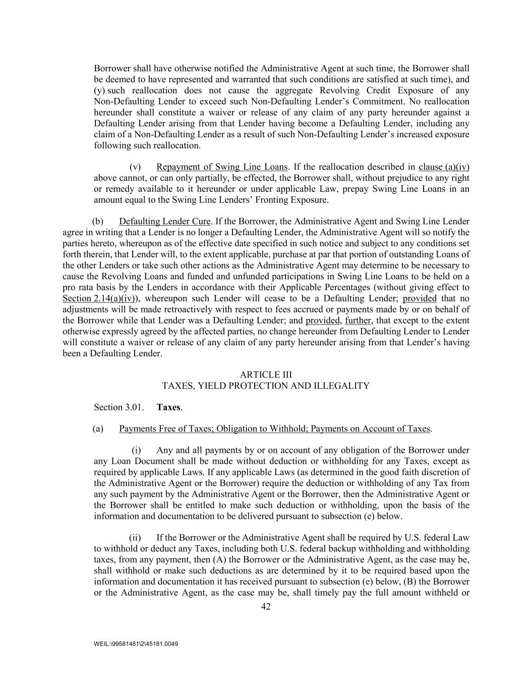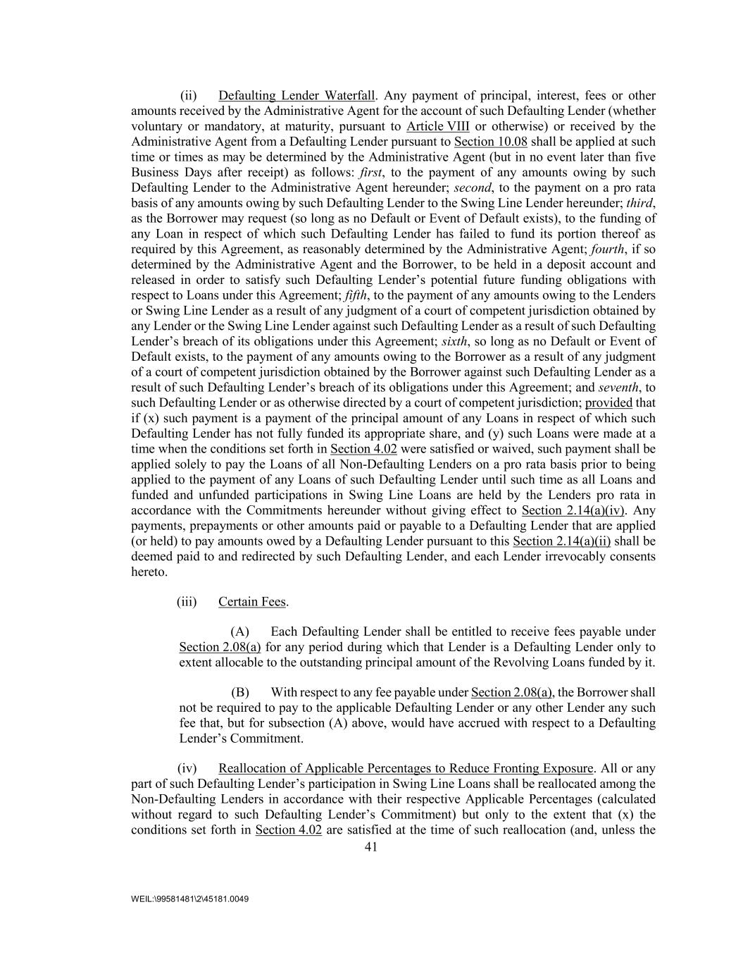 45 WEIL:\99581369\2\44393.0003 Lender or the Swing Line Lender against such Defaulting Lender as a result of such Defaulting Lender’s breach of its obligations under this Agreement; sixth, so long as no Default or Event of Default exists, to the payment of any amounts owing to the Borrower as a result of any judgment of a court of competent jurisdiction obtained by the Borrower against such Defaulting Lender as a result of such Defaulting Lender’s breach of its obligations under this Agreement; and seventh, to such Defaulting Lender or as otherwise directed by a court of competent jurisdiction; provided that if (x) such payment is a payment of the principal amount of any Loans in respect of which such Defaulting Lender has not fully funded its appropriate share, and (y) such Loans were made at a time when the conditions set forth in Section 4.02 were satisfied or waived, such payment shall be applied solely to pay the Loans of all Non-Defaulting Lenders on a pro rata basis prior to being applied to the payment of any Loans of such Defaulting Lender until such time as all Loans and funded and unfunded participations in Swing Line Loans are held by the Lenders pro rata in accordance with the Commitments hereunder without giving effect to Section 2.14(a)(iv). Any payments, prepayments or other amounts paid or payable to a Defaulting Lender that are applied (or held) to pay amounts owed by a Defaulting Lender pursuant to this Section 2.14(a)(ii) shall be deemed paid to and redirected by such Defaulting Lender, and each Lender irrevocably consents hereto. (iii) Certain Fees. (A) Each Defaulting Lender shall be entitled to receive fees payable under Section 2.08(a) for any period during which that Lender is a Defaulting Lender only to extent allocable to the outstanding principal amount of the Revolving Loans funded by it. (B) With respect to any fee payable under Section 2.08(a), the Borrower shall not be required to pay to the applicable Defaulting Lender or any other Lender any such fee that, but for subsection (A) above, would have accrued with respect to a Defaulting Lender’s Commitment. (iv) Reallocation of Applicable Percentages to Reduce Fronting Exposure. All or any part of such Defaulting Lender’s participation in Swing Line Loans or Letters of Credit shall be reallocated among the Non-Defaulting Lenders in accordance with their respective Applicable Percentages (calculated without regard to such Defaulting Lender’s Commitment) but only to the extent that (x) the conditions set forth in Section 4.02 are satisfied at the time of such reallocation (and, unless the Borrower shall have otherwise notified the Administrative Agent at such time, the Borrower shall be deemed to have represented and warranted that such conditions are satisfied at such time), and (y) such reallocation does not cause the aggregate Revolving Credit Exposure of any Non-Defaulting Lender to exceed such Non-Defaulting Lender’s Commitment. No reallocation hereunder shall constitute a waiver or release of any claim of any party hereunder against a Defaulting Lender arising from that Lender having become a Defaulting Lender, including any claim of a Non-Defaulting Lender as a result of such Non-Defaulting Lender’s increased exposure following such reallocation. So long as any Lender is a Defaulting Lender, the Swing Line Lender shall not be required to fund such portion of any Swing Line Loan that equals such Defaulting Lender’s Applicable Percentage of such Swing Line Loan, and the L/C Issuers shall not be required to issue, amend or increase any Letter of Credit, unless they are satisfied (in their reasonable judgment) that the related exposure and the Defaulting Lender’s then outstanding