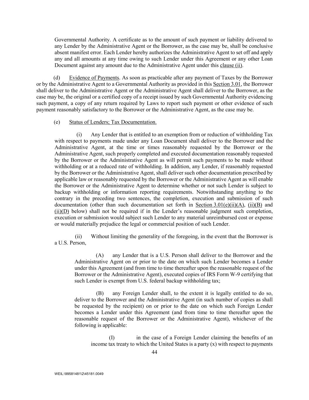 56 WEIL:\99581369\2\44393.0003 Governmental Authority. A certificate as to the amount of such payment or liability delivered to any Lender by the Administrative Agent or the Borrower, as the case may be, shall be conclusive absent manifest error. Each Lender hereby authorizes the Administrative Agent to set off and apply any and all amounts at any time owing to such Lender under this Agreement or any other Loan Document against any amount due to the Administrative Agent under this clause (ii). (d) Evidence of Payments. As soon as practicable after any payment of Taxes by the Borrower or by the Administrative Agent to a Governmental Authority as provided in this Section 3.01, the Borrower shall deliver to the Administrative Agent or the Administrative Agent shall deliver to the Borrower, as the case may be, the original or a certified copy of a receipt issued by such Governmental Authority evidencing such payment, a copy of any return required by Laws to report such payment or other evidence of such payment reasonably satisfactory to the Borrower or the Administrative Agent, as the case may be. (e) Status of Lenders; Tax Documentation. (i) Any Lender that is entitled to an exemption from or reduction of withholding Tax with respect to payments made under any Loan Document shall deliver to the Borrower and the Administrative Agent, at the time or times reasonably requested by the Borrower or the Administrative Agent, such properly completed and executed documentation reasonably requested by the Borrower or the Administrative Agent as will permit such payments to be made without withholding or at a reduced rate of withholding. In addition, any Lender, if reasonably requested by the Borrower or the Administrative Agent, shall deliver such other documentation prescribed by applicable law or reasonably requested by the Borrower or the Administrative Agent as will enable the Borrower or the Administrative Agent to determine whether or not such Lender is subject to backup withholding or information reporting requirements. Notwithstanding anything to the contrary in the preceding two sentences, the completion, execution and submission of such documentation (other than such documentation set forth in Section 3.01(e)(ii)(A), (ii)(B) and (ii)(D) below) shall not be required if in the Lender’s reasonable judgment such completion, execution or submission would subject such Lender to any material unreimbursed cost or expense or would materially prejudice the legal or commercial position of such Lender. (ii) Without limiting the generality of the foregoing, in the event that the Borrower is a U.S. Person, (A) any Lender that is a U.S. Person shall deliver to the Borrower and the Administrative Agent on or prior to the date on which such Lender becomes a Lender under this Agreement (and from time to time thereafter upon the reasonable request of the Borrower or the Administrative Agent), executed copies of IRS Form W-9 certifying that such Lender is exempt from U.S. federal backup withholding tax; (B) any Foreign Lender shall, to the extent it is legally entitled to do so, deliver to the Borrower and the Administrative Agent (in such number of copies as shall be requested by the recipient) on or prior to the date on which such Foreign Lender becomes a Lender under this Agreement (and from time to time thereafter upon the reasonable request of the Borrower or the Administrative Agent), whichever of the following is applicable: