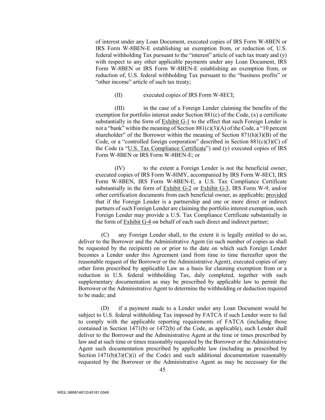 57 WEIL:\99581369\2\44393.0003 (I) in the case of a Foreign Lender claiming the benefits of an income tax treaty to which the United States is a party (x) with respect to payments of interest under any Loan Document, executed copies of IRS Form W-8BEN or IRS Form W-8BEN-E establishing an exemption from, or reduction of, U.S. federal withholding Tax pursuant to the “interest” article of such tax treaty and (y) with respect to any other applicable payments under any Loan Document, IRS Form W- 8BEN or IRS Form W-8BEN-E establishing an exemption from, or reduction of, U.S. federal withholding Tax pursuant to the “business profits” or “other income” article of such tax treaty; (II) executed copies of IRS Form W-8ECI; (III) in the case of a Foreign Lender claiming the benefits of the exemption for portfolio interest under Section 881(c) of the Code, (x) a certificate substantially in the form of Exhibit G-1 to the effect that such Foreign Lender is not a “bank” within the meaning of Section 881(c)(3)(A) of the Code, a “10 percent shareholder” of the Borrower within the meaning of Section 871(h)(3)(B) of the Code, or a “controlled foreign corporation” described in Section 881(c)(3)(C) of the Code (a “U.S. Tax Compliance Certificate”) and (y) executed copies of IRS Form W-8BEN or IRS Form W-8BEN-E; or (IV) to the extent a Foreign Lender is not the beneficial owner, executed copies of IRS Form W-8IMY, accompanied by IRS Form W-8ECI, IRS Form W-8BEN, IRS Form W-8BEN-E, a U.S. Tax Compliance Certificate substantially in the form of Exhibit G-2 or Exhibit G-3, IRS Form W-9, and/or other certification documents from each beneficial owner, as applicable; provided that if the Foreign Lender is a partnership and one or more direct or indirect partners of such Foreign Lender are claiming the portfolio interest exemption, such Foreign Lender may provide a U.S. Tax Compliance Certificate substantially in the form of Exhibit G-4 on behalf of each such direct and indirect partner; (C) any Foreign Lender shall, to the extent it is legally entitled to do so, deliver to the Borrower and the Administrative Agent (in such number of copies as shall be requested by the recipient) on or prior to the date on which such Foreign Lender becomes a Lender under this Agreement (and from time to time thereafter upon the reasonable request of the Borrower or the Administrative Agent), executed copies of any other form prescribed by applicable Law as a basis for claiming exemption from or a reduction in U.S. federal withholding Tax, duly completed, together with such supplementary documentation as may be prescribed by applicable law to permit the Borrower or the Administrative Agent to determine the withholding or deduction required to be made; and (D) if a payment made to a Lender under any Loan Document would be subject to U.S. federal withholding Tax imposed by FATCA if such Lender were to fail to comply with the applicable reporting requirements of FATCA (including those contained in Section 1471(b) or 1472(b) of the Code, as applicable), such Lender shall deliver to the Borrower and the Administrative Agent at the time or times prescribed by law and at such time or times reasonably requested by the Borrower or the Administrative Agent such documentation prescribed by applicable law (including as prescribed by