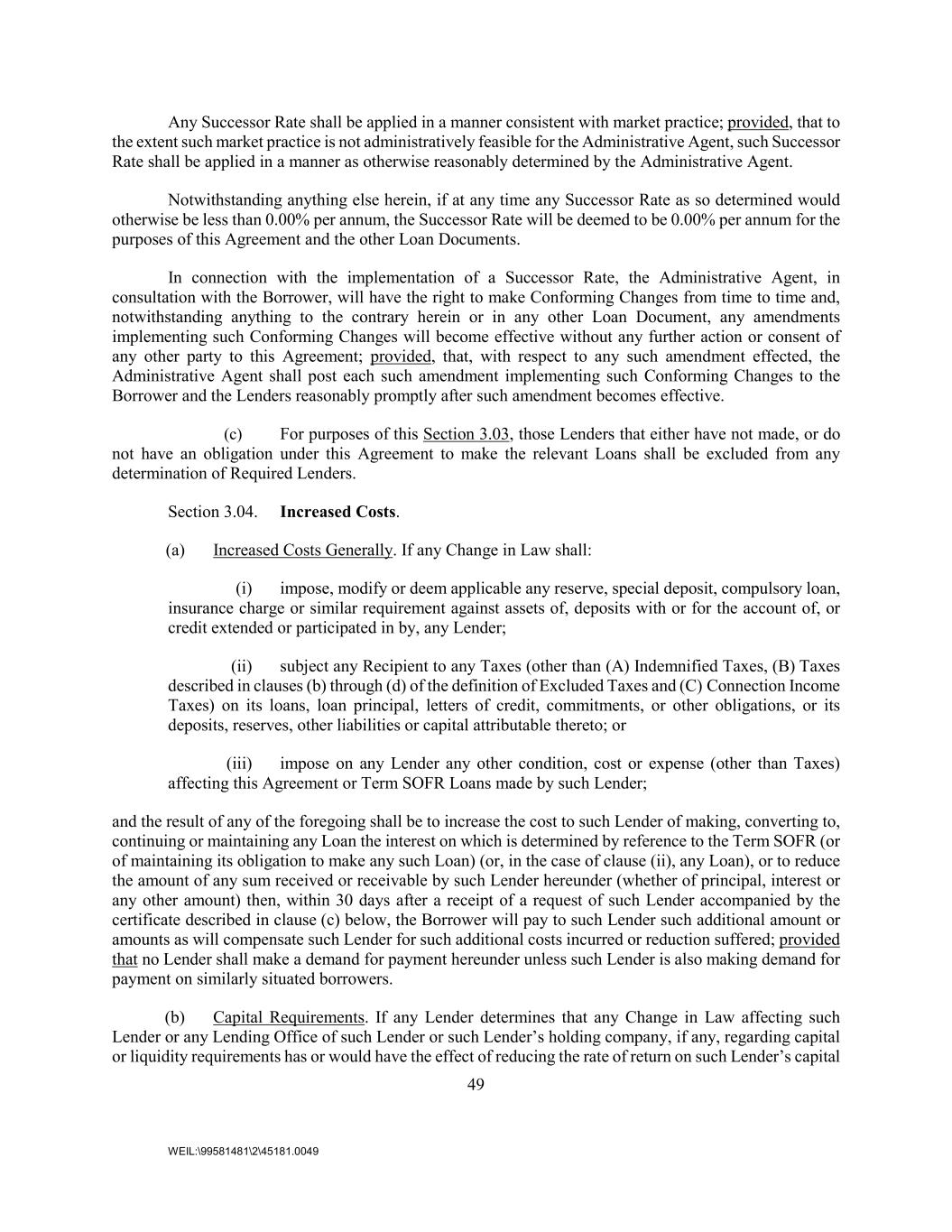 61 WEIL:\99581369\2\44393.0003 If the relevant Successor Rate is Daily Simple SOFR, all interest payments will be payable on a quarterly basis. The Administrative Agent will promptly (in one or more notices) notify the Borrower and each relevant Lender of the implementation of any Successor Rate. Any Successor Rate shall be applied in a manner consistent with market practice; provided, that to the extent such market practice is not administratively feasible for the Administrative Agent, such Successor Rate shall be applied in a manner as otherwise reasonably determined by the Administrative Agent. Notwithstanding anything else herein, if at any time any Successor Rate as so determined would otherwise be less than 0.00% per annum, the Successor Rate will be deemed to be 0.00% per annum for the purposes of this Agreement and the other Loan Documents. In connection with the implementation of a Successor Rate, the Administrative Agent, in consultation with the Borrower, will have the right to make Conforming Changes from time to time and, notwithstanding anything to the contrary herein or in any other Loan Document, any amendments implementing such Conforming Changes will become effective without any further action or consent of any other party to this Agreement; provided, that, with respect to any such amendment effected, the Administrative Agent shall post each such amendment implementing such Conforming Changes to the Borrower and the Lenders reasonably promptly after such amendment becomes effective. (c) For purposes of this Section 3.03, those Lenders that either have not made, or do not have an obligation under this Agreement to make the relevant Loans shall be excluded from any determination of Required Lenders. Section 3.04. Increased Costs. (a) Increased Costs Generally. If any Change in Law shall: (i) impose, modify or deem applicable any reserve, special deposit, compulsory loan, insurance charge or similar requirement against assets of, deposits with or for the account of, or credit extended or participated in by, any Lender; (ii) subject any Recipient to any Taxes (other than (A) Indemnified Taxes, (B) Taxes described in clauses (b) through (d) of the definition of Excluded Taxes and (C) Connection Income Taxes) on its loans, loan principal, letters of credit, commitments, or other obligations, or its deposits, reserves, other liabilities or capital attributable thereto; or (iii) impose on any Lender any other condition, cost or expense (other than Taxes) affecting this Agreement or Term SOFR Loans made by such Lender; and the result of any of the foregoing shall be to increase the cost to such Lender of making, converting to, continuing or maintaining any Loan the interest on which is determined by reference to the Term SOFR (or of maintaining its obligation to make any such Loan) (or, in the case of clause (ii), any Loan), or such L/C Issuer of participating in, issuing or maintaining any Letter of Credit (or of maintaining its obligation to participate in or to issue any Letter of Credit),or to reduce the amount of any sum received or receivable by such Lender or such L/C Issuer, as the case may be, hereunder (whether of principal, interest or any other amount) then, within 30 days after a receipt of a request of such Lender accompanied by the certificate