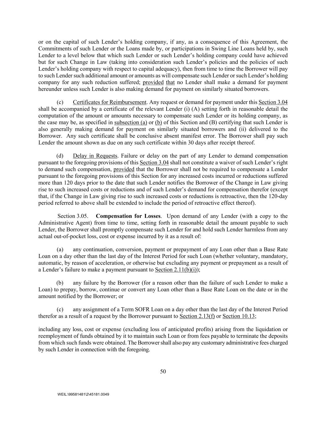 62 WEIL:\99581369\2\44393.0003 described in clause (c) below, the Borrower will pay to such Lender or L/C Issuer, as the case may be, such additional amount or amounts as will compensate such Lender or such L/C Issuer, as the case may be, for such additional costs incurred or reduction suffered; provided that no Lender or L/C Issuer shall make a demand for payment hereunder unless such Lender is also making demand for payment on similarly situated borrowers. (b) Capital Requirements. If any Lender determines that any Change in Law affecting such Lender or any Lending Office of such Lender or such Lender’s holding company, if any, regarding capital or liquidity requirements has or would have the effect of reducing the rate of return on such Lender’s capital or on the capital of such Lender’s holding company, if any, as a consequence of this Agreement, the Commitments of such Lender or the Loans made by, or participations in Swing Line Loans held by, such Lender to a level below that which such Lender or such Lender’s holding company could have achieved but for such Change in Law (taking into consideration such Lender’s policies and the policies of such Lender’s holding company with respect to capital adequacy), then from time to time the Borrower will pay to such Lender such additional amount or amounts as will compensate such Lender or such Lender’s holding company for any such reduction suffered; provided that no Lender shall make a demand for payment hereunder unless such Lender is also making demand for payment on similarly situated borrowers. (c) Certificates for Reimbursement. Any request or demand for payment under this Section 3.04 shall be accompanied by a certificate of the relevant Lender (i) (A) setting forth in reasonable detail the computation of the amount or amounts necessary to compensate such Lender or its holding company, as the case may be, as specified in subsection (a) or (b) of this Section and (B) certifying that such Lender is also generally making demand for payment on similarly situated borrowers and (ii) delivered to the Borrower. Any such certificate shall be conclusive absent manifest error. The Borrower shall pay such Lender the amount shown as due on any such certificate within 30 days after receipt thereof. (d) Delay in Requests. Failure or delay on the part of any Lender to demand compensation pursuant to the foregoing provisions of this Section 3.04 shall not constitute a waiver of such Lender’s right to demand such compensation, provided that the Borrower shall not be required to compensate a Lender pursuant to the foregoing provisions of this Section for any increased costs incurred or reductions suffered more than 120 days prior to the date that such Lender notifies the Borrower of the Change in Law giving rise to such increased costs or reductions and of such Lender’s demand for compensation therefor (except that, if the Change in Law giving rise to such increased costs or reductions is retroactive, then the 120-day period referred to above shall be extended to include the period of retroactive effect thereof). Section 3.05. Compensation for Losses. Upon demand of any Lender (with a copy to the Administrative Agent) from time to time, setting forth in reasonable detail the amount payable to such Lender, the Borrower shall promptly compensate such Lender for and hold such Lender harmless from any actual out-of-pocket loss, cost or expense incurred by it as a result of: (a) any continuation, conversion, payment or prepayment of any Loan other than a Base Rate Loan on a day other than the last day of the Interest Period for such Loan (whether voluntary, mandatory, automatic, by reason of acceleration, or otherwise but excluding any payment or prepayment as a result of a Lender’s failure to make a payment pursuant to Section 2.11(b)(i)); (b) any failure by the Borrower (for a reason other than the failure of such Lender to make a Loan) to prepay, borrow, continue or convert any Loan other than a Base Rate Loan on the date or in the amount notified by the Borrower; or
