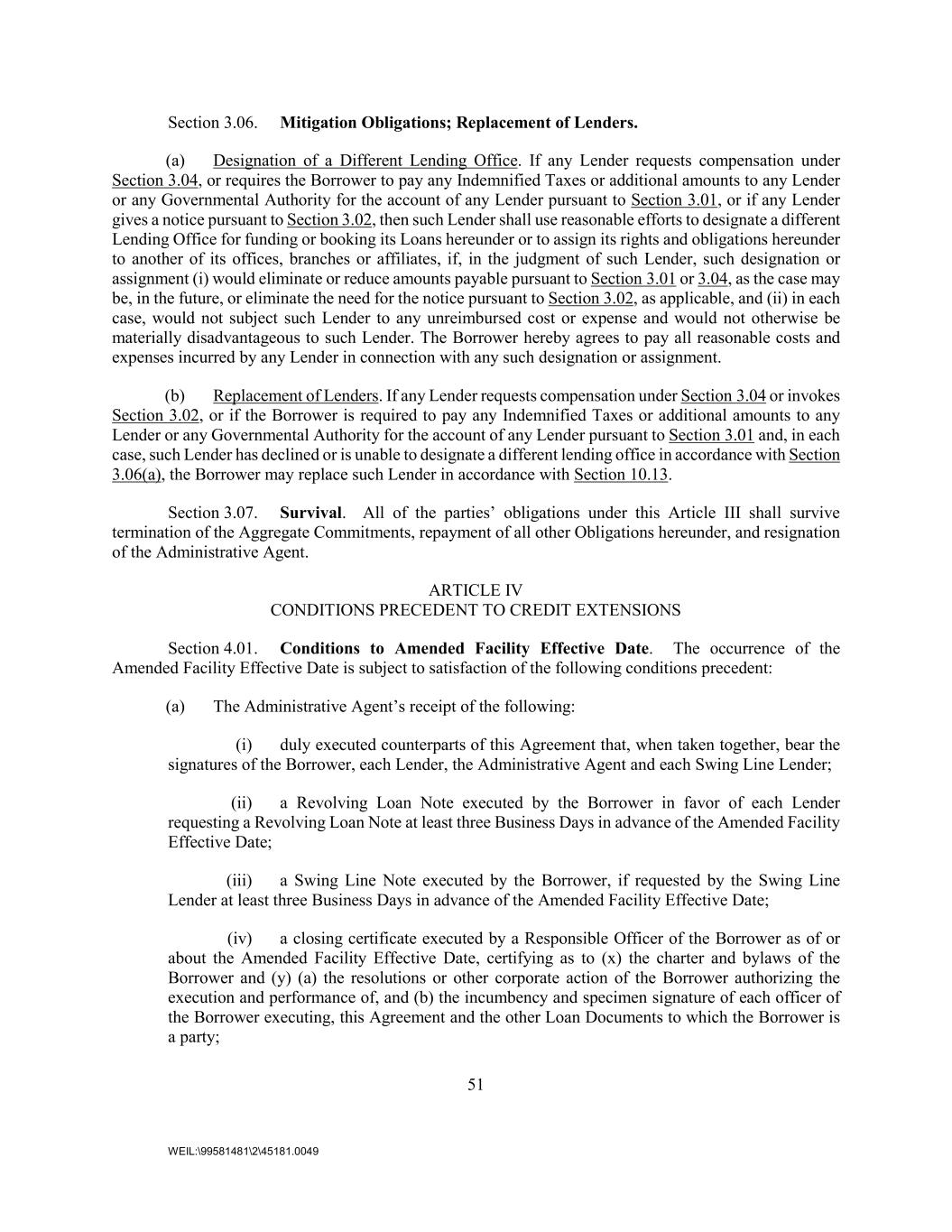 63 WEIL:\99581369\2\44393.0003 (c) any assignment of a Term SOFR Loan on a day other than the last day of the Interest Period therefor as a result of a request by the Borrower pursuant to Section 2.13(f) or Section 10.13; including any loss, cost or expense (excluding loss of anticipated profits) arising from the liquidation or reemployment of funds obtained by it to maintain such Loan or from fees payable to terminate the deposits from which such funds were obtained. The Borrower shall also pay any customary administrative fees charged by such Lender in connection with the foregoing. Section 3.06. Mitigation Obligations; Replacement of Lenders. (a) Designation of a Different Lending Office. If any Lender requests compensation under Section 3.04, or requires the Borrower to pay any Indemnified Taxes or additional amounts to any Lender or any Governmental Authority for the account of any Lender pursuant to Section 3.01, or if any Lender gives a notice pursuant to Section 3.02, then such Lender shall use reasonable efforts to designate a different Lending Office for funding or booking its Loans or Letters of Credit hereunder or to assign its rights and obligations hereunder to another of its offices, branches or affiliates, if, in the judgment of such Lender, such designation or assignment (i) would eliminate or reduce amounts payable pursuant to Section 3.01 or 3.04, as the case may be, in the future, or eliminate the need for the notice pursuant to Section 3.02, as applicable, and (ii) in each case, would not subject such Lender to any unreimbursed cost or expense and would not otherwise be materially disadvantageous to such Lender. The Borrower hereby agrees to pay all reasonable costs and expenses incurred by any Lender in connection with any such designation or assignment. (b) Replacement of Lenders. If any Lender requests compensation under Section 3.04 or invokes Section 3.02, or if the Borrower is required to pay any Indemnified Taxes or additional amounts to any Lender or any Governmental Authority for the account of any Lender pursuant to Section 3.01 and, in each case, such Lender has declined or is unable to designate a different lending office in accordance with Section 3.06(a), the Borrower may replace such Lender in accordance with Section 10.13. Notwithstanding anything to the contrary, any Lender that acts as L/C Issuer may not be replaced by operation of this Section 3.06 at any time that it has any Letter of Credit outstanding unless arrangements reasonably satisfactory to such L/C Issuer (including the furnishing of a back-up standby Letter of Credit in form and substance, and issued by an issuer reasonably satisfactory to such L/C Issuer or the depositing of cash collateral into a Cash Collateral Account in amounts and pursuant to arrangements reasonably satisfactory to such L/C Issuer) have been made with respect to such outstanding Letter of Credit. Section 3.07. Survival. All of the parties’ obligations under this Article III shall survive termination of the Aggregate Commitments, repayment of all other Obligations hereunder, and resignation of the Administrative Agent. ARTICLE IV CONDITIONS PRECEDENT TO CREDIT EXTENSIONS Section 4.01. Conditions to Effective Date. The occurrence of the Effective Date is subject to satisfaction of the following conditions precedent: