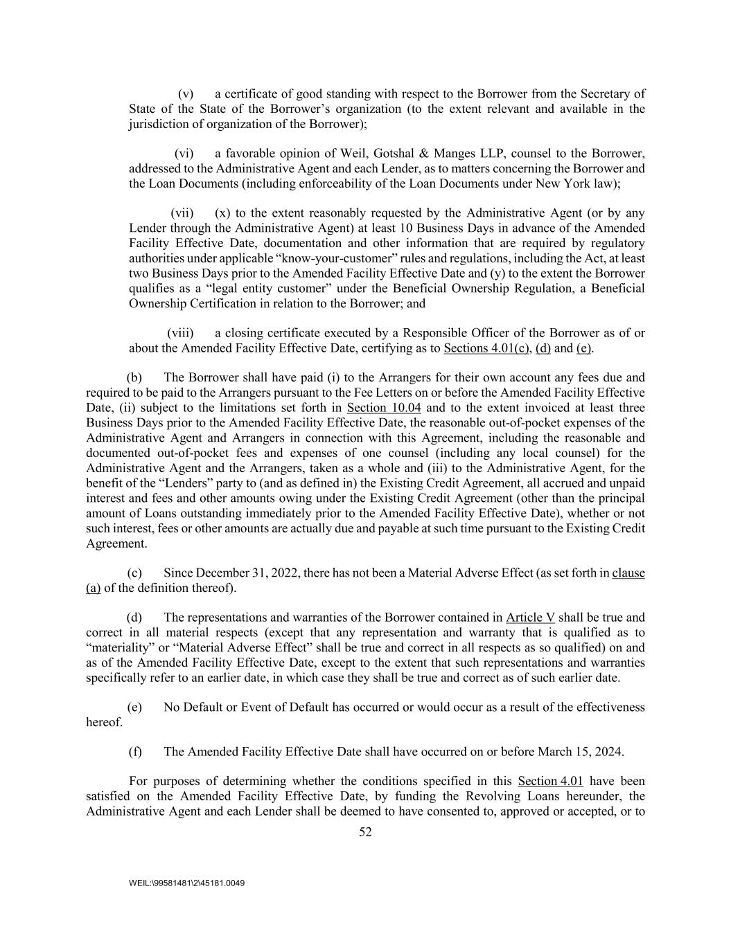 65 WEIL:\99581369\2\44393.0003 the Existing Credit Agreement, all accrued and unpaid interest and fees and other amounts owing under the Existing Credit Agreement (other than the principal amount of Loans outstanding immediately prior to the Effective Date), whether or not such interest, fees or other amounts are actually due and payable at such time pursuant to the Existing Credit Agreement. (c) Since December 31, 2022, there has not been a Material Adverse Effect (as set forth in clause (a) of the definition thereof). (d) The representations and warranties of the Borrower contained in Article V shall be true and correct in all material respects (except that any representation and warranty that is qualified as to “materiality” or “Material Adverse Effect” shall be true and correct in all respects as so qualified) on and as of the Effective Date, except to the extent that such representations and warranties specifically refer to an earlier date, in which case they shall be true and correct as of such earlier date. (e) No Default or Event of Default has occurred or would occur as a result of the effectiveness hereof. (f) The Effective Date shall have occurred on or before March 15, 2024. For purposes of determining whether the conditions specified in this Section 4.01 have been satisfied on the Effective Date, by funding the Revolving Loans hereunder, the Administrative Agent and each Lender shall be deemed to have consented to, approved or accepted, or to be satisfied with, each document or other matter required hereunder to be consented to or approved by or acceptable or satisfactory to the Administrative Agent or such Lender, as the case may be. Section 4.02. Conditions to all Credit Extensions. The obligation of each Lender and each L/C Issuer to honor any Request for Credit Extension (other than a Revolving Loan Notice requesting only a conversion of Revolving Loans to the other Type, or a continuation of Term SOFR Loans) is subject to the following conditions precedent: (a) The representations and warranties of the Borrower contained in Article V (excluding Sections 5.05(d) and 5.06) or any other Loan Document, or which are contained in any document furnished at any time under or in connection herewith or therewith, shall be true and correct in all material respects (except that any representation and warranty that is qualified as to “materiality” or “Material Adverse Effect” shall be true and correct in all respects as so qualified) on and as of the date of such Credit Extension, except to the extent that such representations and warranties specifically refer to an earlier date, in which case they shall be true and correct as of such earlier date, and except that for purposes of this Section 4.02, the representations and warranties contained in subsections (a), the first sentence of (b) and (c) of Section 5.05 shall be deemed to refer to the most recent statements furnished pursuant to clauses (a) through (f), respectively, of Section 6.01. (b) At the time of such Credit Extension, no Default shall exist and be continuing, or would result from such proposed Credit Extension. (c) The Administrative Agent and, if applicable, the relevant L/C Issuer or the Swing Line Lender shall have received a Request for Credit Extension in accordance with the requirements hereof. Each Request for Credit Extension (other than a Revolving Loan Notice requesting only a conversion of Revolving Loans to the other Type or a continuation of Term SOFR Loans) submitted by the