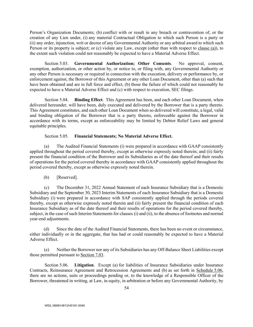 67 WEIL:\99581369\2\44393.0003 of operations for the period covered thereby in accordance with GAAP consistently applied throughout the period covered thereby, except as otherwise expressly noted therein. (b) The unaudited consolidated balance sheet of the Borrower and its Subsidiaries dated September 30, 2023, and the related unaudited consolidated statements of income or operations, shareholders’ equity and cash flows for the fiscal quarter ended on that date (i) were prepared in accordance with GAAP consistently applied throughout the period covered thereby, except as otherwise expressly noted therein, and (ii) fairly present the financial condition of the Borrower and its Subsidiaries as of the date thereof and their results of operations for the period covered thereby, subject, in the case of clauses (i) and (ii), to the absence of footnotes and to normal year-end audit adjustments. (c) The December 31, 2022 Annual Statement of each Insurance Subsidiary that is a Domestic Subsidiary and the September 30, 2023 Interim Statements of each Insurance Subsidiary that is a Domestic Subsidiary (i) were prepared in accordance with SAP consistently applied through the periods covered thereby, except as otherwise expressly noted therein; and (ii) fairly present the financial condition of each Insurance Subsidiary as of the date thereof and their results of operations for the period covered thereby, subject, in the case of such Interim Statements for clauses (i) and (ii), to the absence of footnotes and normal year-end adjustments. (d) Since the date of the Audited Financial Statements, there has been no event or circumstance, either individually or in the aggregate, that has had or could reasonably be expected to have a Material Adverse Effect. (e) Neither the Borrower nor any of its Subsidiaries has any Off-Balance Sheet Liabilities except those permitted pursuant to Section 7.04. Section 5.06. Litigation. Except (a) for liabilities of Insurance Subsidiaries under Insurance Contracts, Reinsurance Agreement and Retrocession Agreements and (b) as set forth in Schedule 5.06, there are no actions, suits or proceedings pending or, to the knowledge of a Responsible Officer of the Borrower, threatened in writing, at Law, in equity, in arbitration or before any Governmental Authority, by or against the Borrower or any of its Subsidiaries or against any of their respective properties or revenues that (i) purport to affect or pertain to this Agreement or any other Loan Document, or any of the transactions contemplated hereby, or (ii) either individually or in the aggregate could reasonably be expected to have a Material Adverse Effect. Section 5.07. No Default. Neither the Borrower nor any Subsidiary is in default under or with respect to any Contractual Obligation that could, either individually or in the aggregate, reasonably be expected to have a Material Adverse Effect. No Default has occurred and is continuing or would result from the consummation of the transactions contemplated by this Agreement or any other Loan Document. Section 5.08. Ownership of Property; Liens. Each of the Borrower and each Subsidiary has good record and indefeasible title to, or valid leasehold interests in, their respective real properties, except for such defects in title as could not, individually or in the aggregate, reasonably be expected to have a Material Adverse Effect. Section 5.09. Environmental Compliance. The Borrower and its Subsidiaries have complied with all Environmental Laws, except for any Environmental Laws the non-compliance therewith could not, individually or in the aggregate, reasonably be expected to have a Material Adverse Effect.