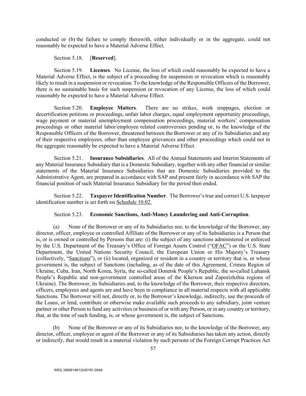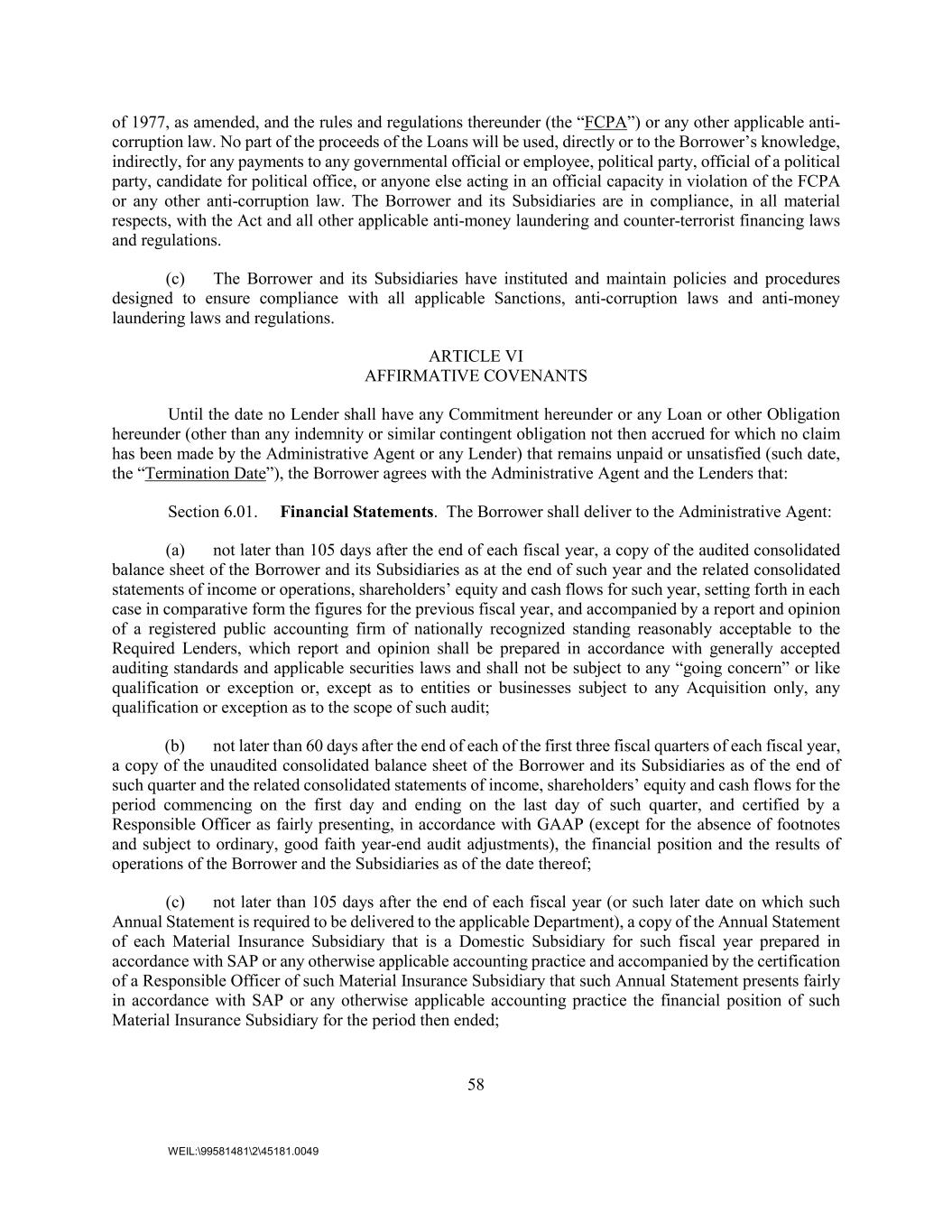 70 WEIL:\99581369\2\44393.0003 of their respective employees, other than employee grievances and other proceedings which could not in the aggregate reasonably be expected to have a Material Adverse Effect. Section 5.21. Insurance Subsidiaries. All of the Annual Statements and Interim Statements of any Material Insurance Subsidiary that is a Domestic Subsidiary, together with any other financial or similar statements of the Material Insurance Subsidiaries that are Domestic Subsidiaries provided to the Administrative Agent, are prepared in accordance with SAP and present fairly in accordance with SAP the financial position of such Material Insurance Subsidiary for the period then ended. Section 5.22. Taxpayer Identification Number. The Borrower’s true and correct U.S. taxpayer identification number is set forth on Schedule 10.02. Section 5.23. Economic Sanctions, Anti-Money Laundering and Anti-Corruption. (a) None of the Borrower or any of its Subsidiaries nor, to the knowledge of the Borrower, any director, officer, employee or controlled Affiliate of the Borrower is a Person that is, or is owned or controlled by Persons that are: (i) the subject of any sanctions administered or enforced by the U.S. Department of the Treasury’s Office of Foreign Assets Control (“OFAC”) or the U.S. State Department, the United Nations Security Council, the European Union or His Majesty’s Treasury (collectively, “Sanctions”), or (ii) located, organized or resident in a country or territory that is, or whose government is, the subject of Sanctions (including, as of the date of this Agreement, Crimea Region of Ukraine, Cuba, Iran, North Korea, Syria, the so-called Donetsk People’s Republic, the so-called Luhansk People’s Republic and non-government controlled areas of the Kherson and Zaporizhzhia regions of Ukraine). The Borrower, its Subsidiaries and, to the knowledge of the Borrower, their respective directors, officers, employees and agents are and have been in compliance in all material respects with all applicable Sanctions. The Borrower will not, directly or, to the Borrower’s knowledge, indirectly, use the proceeds of the Loans, or lend, contribute or otherwise make available such proceeds to any subsidiary, joint venture partner or other Person to fund any activities or business of or with any Person, or in any country or territory, that, at the time of such funding, is, or whose government is, the subject of Sanctions. (b) None of the Borrower or any of its Subsidiaries nor, to the knowledge of the Borrower, any director, officer, employee or agent of the Borrower or any of its Subsidiaries has taken any action, directly or indirectly, that would result in a material violation by such persons of the Foreign Corrupt Practices Act of 1977, as amended, and the rules and regulations thereunder (the “FCPA”) or any other applicable anti- corruption law. No part of the proceeds of the Loans will be used, directly or to the Borrower’s knowledge, indirectly, for any payments to any governmental official or employee, political party, official of a political party, candidate for political office, or anyone else acting in an official capacity in violation of the FCPA or any other anti-corruption law. The Borrower and its Subsidiaries are in compliance, in all material respects, with the Act and all other applicable anti-money laundering and counter-terrorist financing laws and regulations. (c) The Borrower and its Subsidiaries have instituted and maintain policies and procedures designed to ensure compliance with all applicable Sanctions, anti-corruption laws and anti-money laundering laws and regulations.