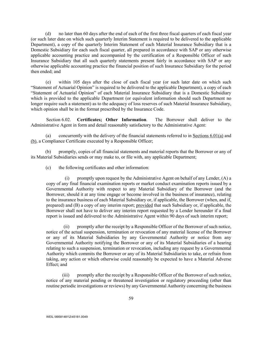 72 WEIL:\99581369\2\44393.0003 “Statement of Actuarial Opinion” of each Material Insurance Subsidiary that is a Domestic Subsidiary which is provided to the applicable Department (or equivalent information should such Department no longer require such a statement) as to the adequacy of loss reserves of such Material Insurance Subsidiary, which opinion shall be in the format prescribed by the Insurance Code. Section 6.02. Certificates; Other Information. The Borrower shall deliver to the Administrative Agent in form and detail reasonably satisfactory to the Administrative Agent: (a) concurrently with the delivery of the financial statements referred to in Sections 6.01(a) and (b), a Compliance Certificate executed by a Responsible Officer; (b) promptly, copies of all financial statements and material reports that the Borrower or any of its Material Subsidiaries sends or may make to, or file with, any applicable Department; (c) the following certificates and other information: (i) promptly upon request by the Administrative Agent on behalf of any Lender, (A) a copy of any final financial examination reports or market conduct examination reports issued by a Governmental Authority with respect to any Material Subsidiary of the Borrower (and the Borrower, should it at any time engage or become involved in the business of insurance), relating to the insurance business of each Material Subsidiary or, if applicable, the Borrower (when, and if, prepared) and (B) a copy of any interim report; provided that such Subsidiary or, if applicable, the Borrower shall not have to deliver any interim report requested by a Lender hereunder if a final report is issued and delivered to the Administrative Agent within 90 days of such interim report; (ii) promptly after the receipt by a Responsible Officer of the Borrower of such notice, notice of the actual suspension, termination or revocation of any material license of the Borrower or any of its Material Subsidiaries by any Governmental Authority or notice from any Governmental Authority notifying the Borrower or any of its Material Subsidiaries of a hearing relating to such a suspension, termination or revocation, including any request by a Governmental Authority which commits the Borrower or any of its Material Subsidiaries to take, or refrain from taking, any action or which otherwise could reasonably be expected to have a Material Adverse Effect; and (iii) promptly after the receipt by a Responsible Officer of the Borrower of such notice, notice of any material pending or threatened investigation or regulatory proceeding (other than routine periodic investigations or reviews) by any Governmental Authority concerning the business practices or operations of the Borrower or any of its Material Subsidiaries which is reasonably likely to have a Material Adverse Effect. (d) promptly upon (i) the acquisition by the Borrower or any of its Subsidiaries of any Person which engages in any material respect in an insurance business or (ii) any Subsidiary of the Borrower or any of its Subsidiaries becoming engaged in any material respect in an insurance business, a certificate of a Responsible Officer stating that such Person or Subsidiary shall be deemed to be an “Insurance Subsidiary” for all purposes of each Loan Document; (e) [reserved];