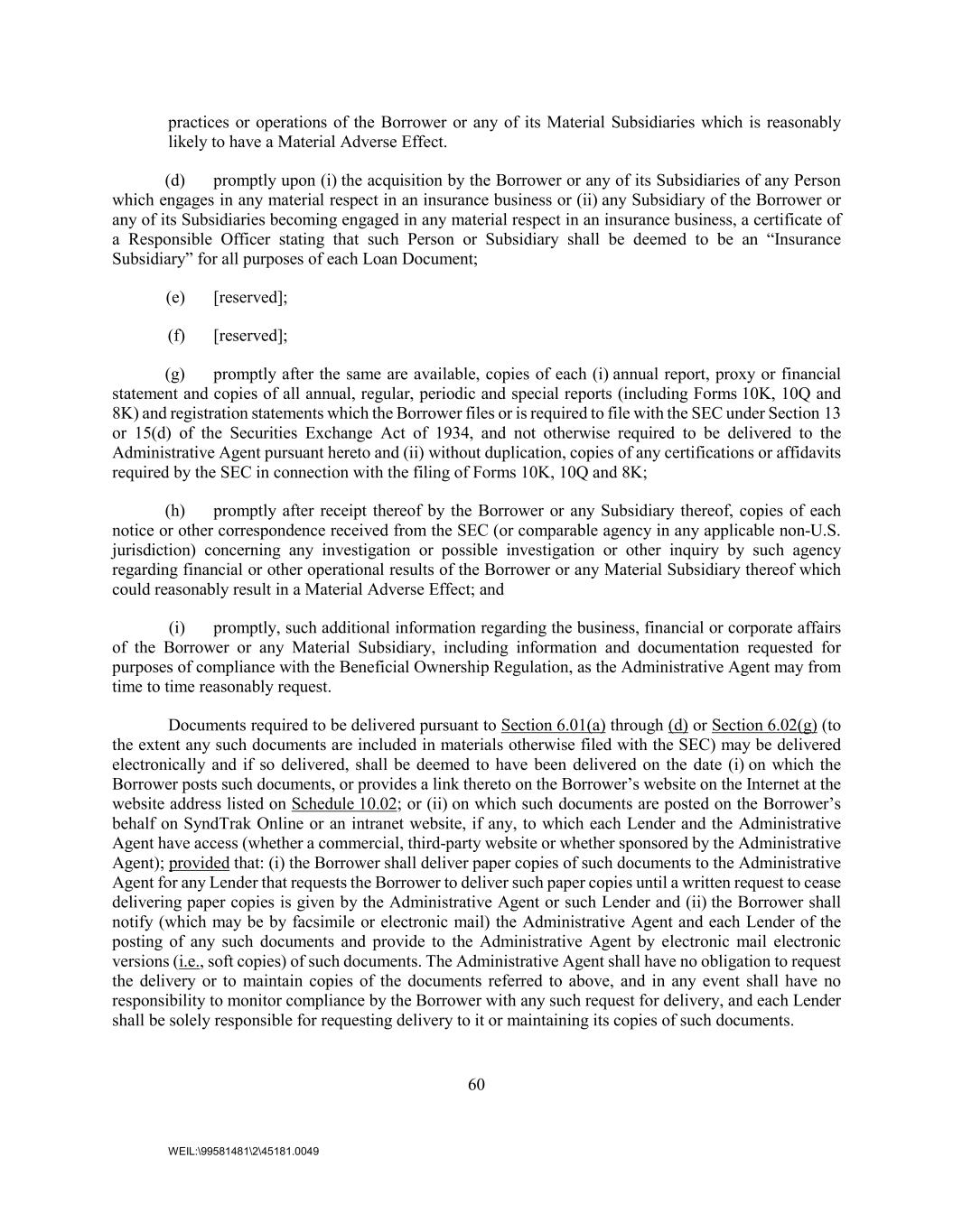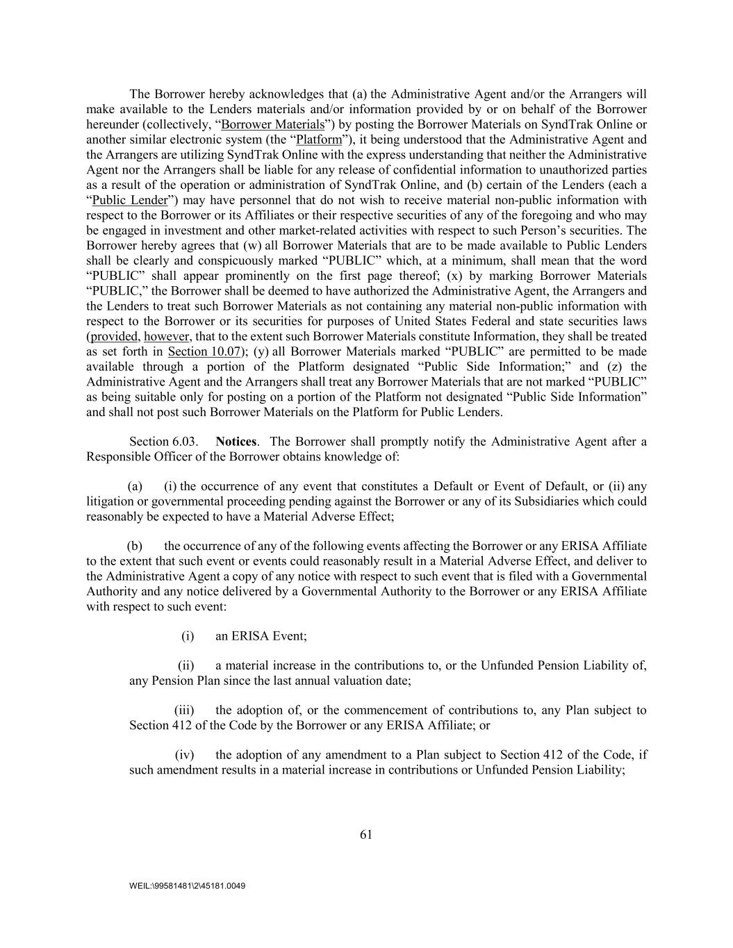 73 WEIL:\99581369\2\44393.0003 (f) [reserved]; (g) promptly after the same are available, copies of each (i) annual report, proxy or financial statement and copies of all annual, regular, periodic and special reports (including Forms 10K, 10Q and 8K) and registration statements which the Borrower files or is required to file with the SEC under Section 13 or 15(d) of the Securities Exchange Act of 1934, and not otherwise required to be delivered to the Administrative Agent pursuant hereto and (ii) without duplication, copies of any certifications or affidavits required by the SEC in connection with the filing of Forms 10K, 10Q and 8K; (h) promptly after receipt thereof by the Borrower or any Subsidiary thereof, copies of each notice or other correspondence received from the SEC (or comparable agency in any applicable non-U.S. jurisdiction) concerning any investigation or possible investigation or other inquiry by such agency regarding financial or other operational results of the Borrower or any Material Subsidiary thereof which could reasonably result in a Material Adverse Effect; and (i) promptly, such additional information regarding the business, financial or corporate affairs of the Borrower or any Material Subsidiary, including information and documentation requested for purposes of compliance with the Beneficial Ownership Regulation, as the Administrative Agent may from time to time reasonably request. Documents required to be delivered pursuant to Section 6.01(a) through (d) or Section 6.02(g) (to the extent any such documents are included in materials otherwise filed with the SEC) may be delivered electronically and if so delivered, shall be deemed to have been delivered on the date (i) on which the Borrower posts such documents, or provides a link thereto on the Borrower’s website on the Internet at the website address listed on Schedule 10.02; or (ii) on which such documents are posted on the Borrower’s behalf on SyndTrak Online or an intranet website, if any, to which each Lender and the Administrative Agent have access (whether a commercial, third-party website or whether sponsored by the Administrative Agent); provided that: (i) the Borrower shall deliver paper copies of such documents to the Administrative Agent for any Lender that requests the Borrower to deliver such paper copies until a written request to cease delivering paper copies is given by the Administrative Agent or such Lender and (ii) the Borrower shall notify (which may be by facsimile or electronic mail) the Administrative Agent and each Lender of the posting of any such documents and provide to the Administrative Agent by electronic mail electronic versions (i.e., soft copies) of such documents. The Administrative Agent shall have no obligation to request the delivery or to maintain copies of the documents referred to above, and in any event shall have no responsibility to monitor compliance by the Borrower with any such request for delivery, and each Lender shall be solely responsible for requesting delivery to it or maintaining its copies of such documents. The Borrower hereby acknowledges that (a) the Administrative Agent and/or the Arrangers will make available to the Lenders materials and/or information provided by or on behalf of the Borrower hereunder (collectively, “Borrower Materials”) by posting the Borrower Materials on SyndTrak Online or another similar electronic system (the “Platform”), it being understood that the Administrative Agent and the Arrangers are utilizing SyndTrak Online with the express understanding that neither the Administrative Agent nor the Arrangers shall be liable for any release of confidential information to unauthorized parties as a result of the operation or administration of SyndTrak Online, and (b) certain of the Lenders (each a “Public Lender”) may have personnel that do not wish to receive material non-public information with respect to the Borrower or its Affiliates or their respective securities of any of the foregoing and who may be engaged in investment and other market-related activities with respect to such Person’s securities. The Borrower hereby agrees that (w) all Borrower Materials that are to be made available to Public Lenders shall be clearly and conspicuously marked “PUBLIC” which, at a minimum, shall mean that the word