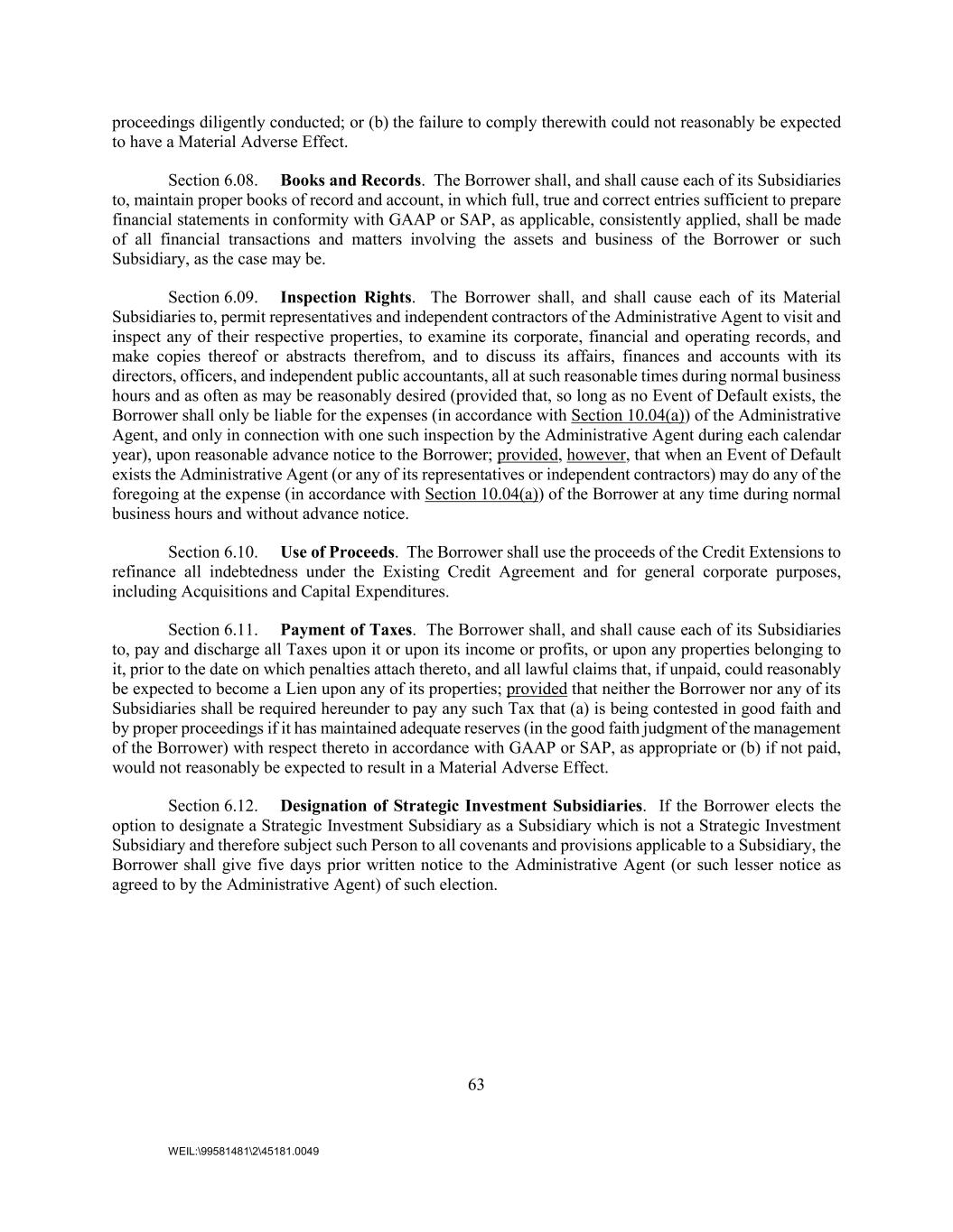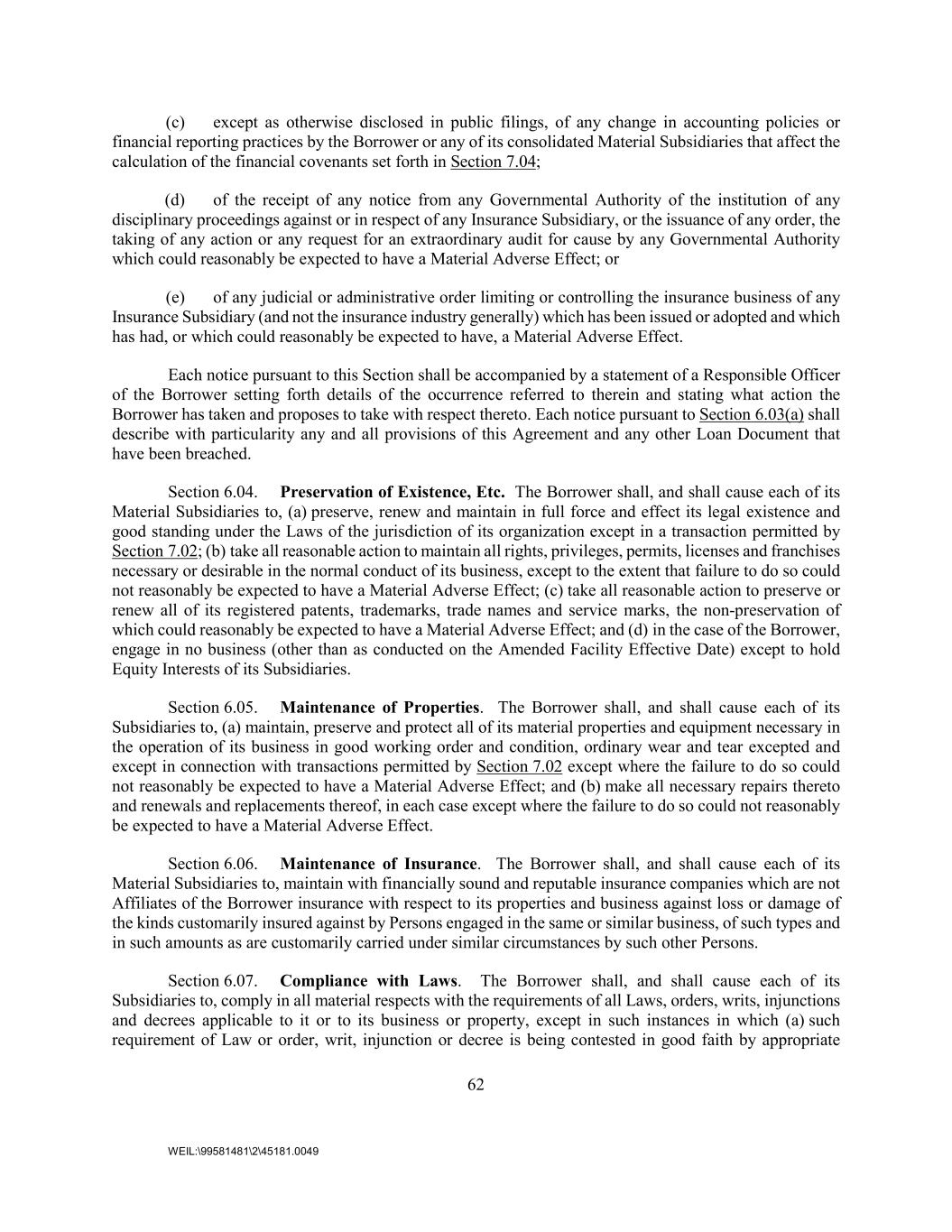 75 WEIL:\99581369\2\44393.0003 Each notice pursuant to this Section shall be accompanied by a statement of a Responsible Officer of the Borrower setting forth details of the occurrence referred to therein and stating what action the Borrower has taken and proposes to take with respect thereto. Each notice pursuant to Section 6.03(a) shall describe with particularity any and all provisions of this Agreement and any other Loan Document that have been breached. Section 6.04. Preservation of Existence, Etc. The Borrower shall, and shall cause each of its Material Subsidiaries to, (a) preserve, renew and maintain in full force and effect its legal existence and good standing under the Laws of the jurisdiction of its organization except in a transaction permitted by Section 7.02; (b) take all reasonable action to maintain all rights, privileges, permits, licenses and franchises necessary or desirable in the normal conduct of its business, except to the extent that failure to do so could not reasonably be expected to have a Material Adverse Effect; (c) take all reasonable action to preserve or renew all of its registered patents, trademarks, trade names and service marks, the non-preservation of which could reasonably be expected to have a Material Adverse Effect; and (d) in the case of the Borrower, engage in no business (other than as conducted on the Effective Date) except to hold Equity Interests of its Subsidiaries. Section 6.05. Maintenance of Properties. The Borrower shall, and shall cause each of its Subsidiaries to, (a) maintain, preserve and protect all of its material properties and equipment necessary in the operation of its business in good working order and condition, ordinary wear and tear excepted and except in connection with transactions permitted by Section 7.02 except where the failure to do so could not reasonably be expected to have a Material Adverse Effect; and (b) make all necessary repairs thereto and renewals and replacements thereof, in each case except where the failure to do so could not reasonably be expected to have a Material Adverse Effect. Section 6.06. Maintenance of Insurance. The Borrower shall, and shall cause each of its Material Subsidiaries to, maintain with financially sound and reputable insurance companies which are not Affiliates of the Borrower insurance with respect to its properties and business against loss or damage of the kinds customarily insured against by Persons engaged in the same or similar business, of such types and in such amounts as are customarily carried under similar circumstances by such other Persons. Section 6.07. Compliance with Laws. The Borrower shall, and shall cause each of its Subsidiaries to, comply in all material respects with the requirements of all Laws, orders, writs, injunctions and decrees applicable to it or to its business or property, except in such instances in which (a) such requirement of Law or order, writ, injunction or decree is being contested in good faith by appropriate proceedings diligently conducted; or (b) the failure to comply therewith could not reasonably be expected to have a Material Adverse Effect. Section 6.08. Books and Records. The Borrower shall, and shall cause each of its Subsidiaries to, maintain proper books of record and account, in which full, true and correct entries sufficient to prepare financial statements in conformity with GAAP or SAP, as applicable, consistently applied, shall be made of all financial transactions and matters involving the assets and business of the Borrower or such Subsidiary, as the case may be. Section 6.09. Inspection Rights. The Borrower shall, and shall cause each of its Material Subsidiaries to, permit representatives and independent contractors of the Administrative Agent to visit and inspect any of their respective properties, to examine its corporate, financial and operating records, and make copies thereof or abstracts therefrom, and to discuss its affairs, finances and accounts with its directors, officers, and independent public accountants, all at such reasonable times during normal business
