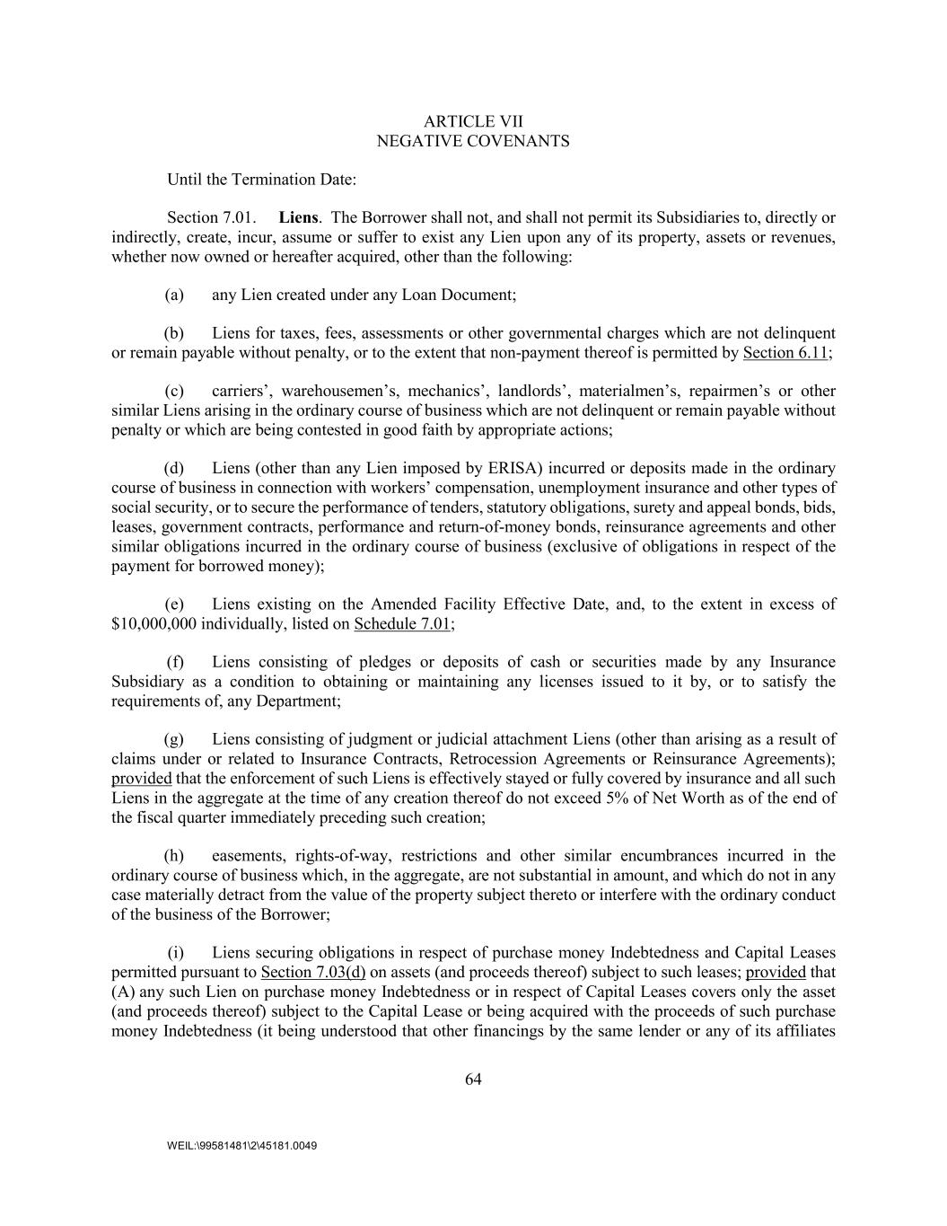 77 WEIL:\99581369\2\44393.0003 similar obligations incurred in the ordinary course of business (exclusive of obligations in respect of the payment for borrowed money); (e) Liens existing on the Effective Date, and, to the extent in excess of $5,000,000 individually, listed on Schedule 7.01; (f) Liens consisting of pledges or deposits of cash or securities made by any Insurance Subsidiary as a condition to obtaining or maintaining any licenses issued to it by, or to satisfy the requirements of, any Department; (g) Liens consisting of judgment or judicial attachment Liens (other than arising as a result of claims under or related to Insurance Contracts, Retrocession Agreements or Reinsurance Agreements); provided that the enforcement of such Liens is effectively stayed or fully covered by insurance and all such Liens in the aggregate at the time of any creation thereof do not exceed 5% of Net Worth as of the end of the fiscal quarter immediately preceding such creation; (h) easements, rights-of-way, restrictions and other similar encumbrances incurred in the ordinary course of business which, in the aggregate, are not substantial in amount, and which do not in any case materially detract from the value of the property subject thereto or interfere with the ordinary conduct of the business of the Borrower; (i) Liens securing obligations in respect of purchase money Indebtedness and Capital Leases permitted pursuant to Section 7.04(d) on assets (and proceeds thereof) subject to such leases; provided that (A) any such Lien on purchase money Indebtedness or in respect of Capital Leases covers only the asset (and proceeds thereof) subject to the Capital Lease or being acquired with the proceeds of such purchase money Indebtedness (it being understood that other financings by the same lender or any of its affiliates under Indebtedness also permitted under Section 7.04(d) may be cross collateralized) and (B) such purchase money Indebtedness and Capital Leases are otherwise permitted hereunder; (j) Liens securing obligations permitted under Sections 7.04(f) and/or (g), to the extent such Liens are identified and permitted under such Section; (k) Liens arising as a result of claims under or related to Insurance Contracts, Reinsurance Agreements or Retrocession Agreements in the ordinary course of business, or securing Indebtedness of Insurance Subsidiaries incurred or assumed in connection with the settlement of claim losses in the ordinary course of business of such Insurance Subsidiaries; (l) Liens securing obligations permitted under Section 7.04(h); (m) Liens on assets of a Subsidiary securing obligations owed to the Borrower or a Subsidiary and permitted under Section 7.04(m); (n) (i) Liens on assets of Insurance Subsidiaries and Subsidiaries thereof securing (x) Indebtedness permitted by Section 7.04(r), (y) obligations under Primary Policies or (z) obligations under transactions entered into in connection with Insurance Investments, (ii) statutory Liens on assets of Insurance Subsidiaries and Subsidiaries thereof and (iii) Liens arising in connection with Insurance Contracts, Reinsurance Agreements and Retrocession Agreements entered into in the ordinary course of business;
