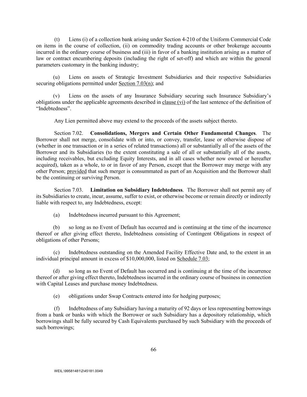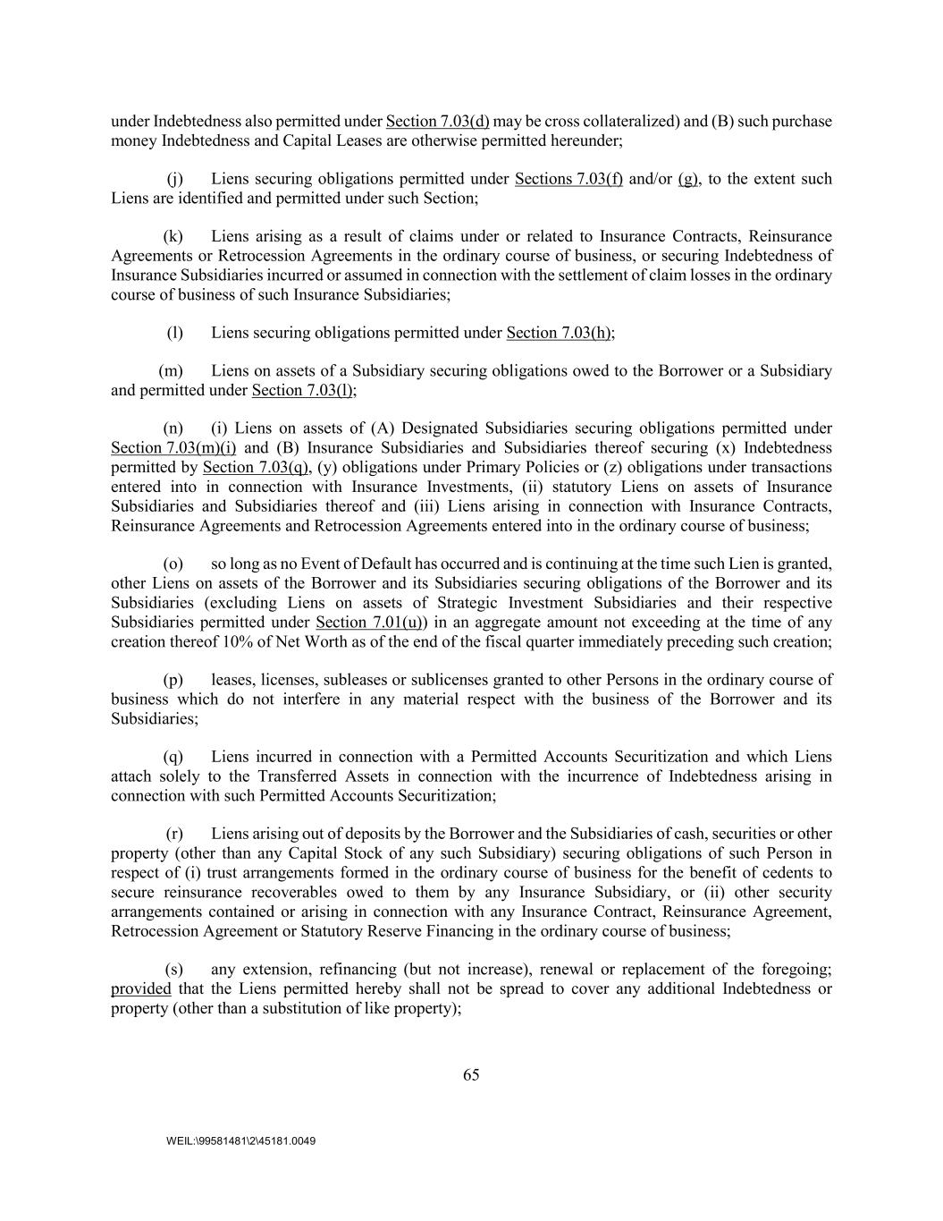 78 WEIL:\99581369\2\44393.0003 (o) so long as no Event of Default has occurred and is continuing at the time such Lien is granted, other Liens on assets of the Borrower and its Subsidiaries securing obligations of the Borrower and its Subsidiaries (excluding Liens on assets of Strategic Investment Subsidiaries and their respective Subsidiaries permitted under Section 7.01(u)) in an aggregate amount not exceeding at the time of any creation thereof 7.5% of Net Worth as of the end of the fiscal quarter immediately preceding such creation; (p) leases, licenses, subleases or sublicenses granted to other Persons in the ordinary course of business which do not interfere in any material respect with the business of the Borrower and its Subsidiaries; (q) Liens incurred in connection with a Permitted Accounts Securitization and which Liens attach solely to the Transferred Assets in connection with the incurrence of Indebtedness arising in connection with such Permitted Accounts Securitization; (r) Liens arising out of deposits by the Borrower and the Subsidiaries of cash, securities or other property (other than any Capital Stock of any such Subsidiary) securing obligations of such Person in respect of (i) trust arrangements formed in the ordinary course of business for the benefit of cedents to secure reinsurance recoverables owed to them by any Insurance Subsidiary, or (ii) other security arrangements contained or arising in connection with any Insurance Contract, Reinsurance Agreement, Retrocession Agreement or Statutory Reserve Financing in the ordinary course of business; (s) any extension, refinancing (but not increase), renewal or replacement of the foregoing; provided that the Liens permitted hereby shall not be spread to cover any additional Indebtedness or property (other than a substitution of like property); (t) Liens (i) of a collection bank arising under Section 4-210 of the Uniform Commercial Code on items in the course of collection, (ii) on commodity trading accounts or other brokerage accounts incurred in the ordinary course of business and (iii) in favor of a banking institution arising as a matter of law or contract encumbering deposits (including the right of set-off) and which are within the general parameters customary in the banking industry; (u) Liens on assets of Strategic Investment Subsidiaries and their respective Subsidiaries securing obligations permitted under Section 7.04(o); and (v) Liens on the assets of any Insurance Subsidiary securing such Insurance Subsidiary’s obligations under the applicable agreements described in clause (vi) of the last sentence of the definition of “Indebtedness”. Any Lien permitted above may extend to the proceeds of the assets subject thereto. Section 7.02. Consolidations, Mergers and Certain Other Fundamental Changes. (x) The Borrower shall not, and shall not permit any of its Subsidiaries to, merge, consolidate with or into any Person and (y) the Borrower shall not dispose of (whether in one transaction or in a series of related transactions) all or substantially all of the assets of the Borrower and its Subsidiaries, taken as a whole (to the extent constituting a sale of all or substantially all of the assets, including receivables, but excluding Equity Interests, and in all cases whether now owned or hereafter acquired), to or in favor of any Person, in each case except: