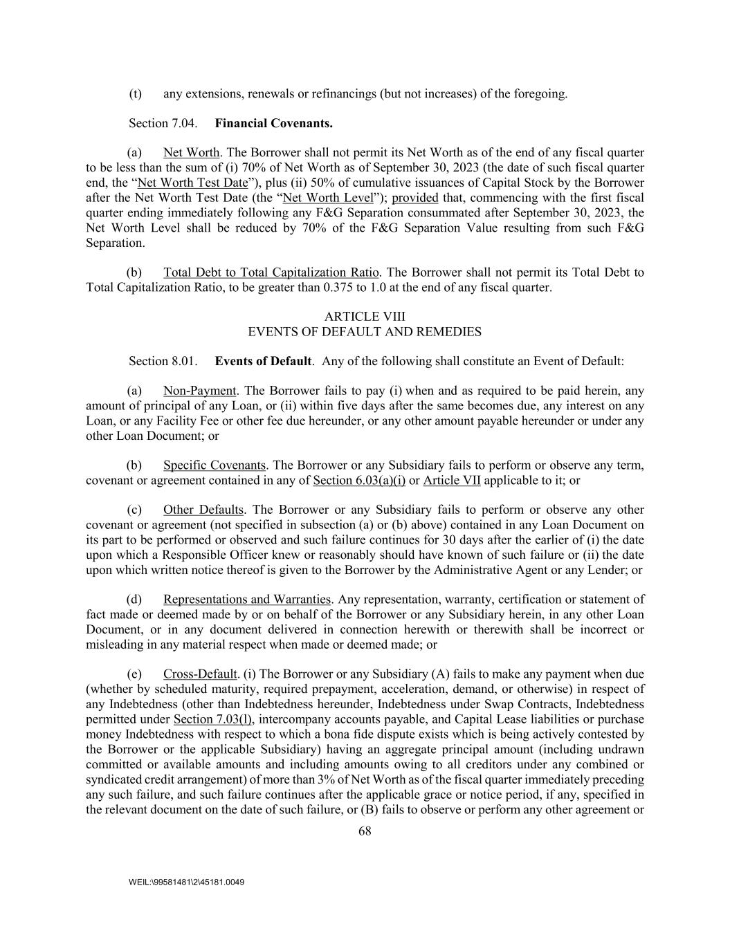 82 WEIL:\99581369\2\44393.0003 any other distribution of assets, properties, rights, obligations or securities, to its shareholders so long as, immediately preceding and after giving effect to such other distribution, the Borrower shall be in compliance with the financial covenants set forth in Sections 7.09(a), 7.09(b) and 7.09(c), in each case on a pro forma basis; provided that compliance with the financial covenant in Section 7.09(c) shall only be so tested at such time if, at such time, the RBC Ratio Test Condition would be satisfied; (d) [reserved]; (e) [reserved]; and (f) to the extent constituting a Restricted Payment, the Borrower and any Subsidiary may consummate any transaction permitted by Section 7.02 and/or Section 7.03 (other than Section 7.03(a)(iii)(D)). Section 7.07. Change in Business. Other than in connection with a Permitted Acquisition, the Borrower shall not, and shall not permit any of its Material Subsidiaries to, engage in any material line of business substantially different from those lines of business carried on by the Borrower and its Subsidiaries on the Effective Date and businesses directly related thereto and reasonable extensions thereof. Section 7.08. Accounting Changes. The Borrower shall not, and shall not permit any of its Material Subsidiaries to, make any change in accounting treatment or reporting practices that affect the calculation of the financial covenants set forth in Section 7.09, except as required or allowed by GAAP or SAP, or change the fiscal year of the Borrower or of any Subsidiary. Section 7.09. Financial Covenants. (a) Net Worth. Commencing with the fiscal quarter ending December 31, 2023, the Borrower shall not permit its Net Worth as of the end of any fiscal quarter to be less than the sum of (i) 70% of Net Worth as of September 30, 2023 (the date of such fiscal quarter end, the “Net Worth Test Date”), plus (ii) 50% of any positive quarterly Net Income after the Net Worth Test Date, plus (iii) 50% of cumulative issuances of Capital Stock by the Borrower after the Net Worth Test Date; provided that, there shall be no deduction in clause (ii) for any negative quarterly Net Income. (b) Total Debt to Total Capitalization Ratio. Commencing with the fiscal quarter ending December 31, 2022, the Borrower shall not permit its Total Debt to Total Capitalization Ratio to be greater than 0.35 to 1.0 at the end of any fiscal quarter. (c) Minimum RBC Ratio. Commencing with the fiscal quarter ending December 31, 2022, the Borrower shall not permit the RBC Ratio of FGLIC as at the end of any fiscal quarter to be less than 300%; provided that the RBC Ratio shall be tested at the end of any fiscal quarter only if, on such date, either (x) the Borrower has a Debt Rating from any of S&P, Moody’s or Fitch that is listed in Level 4 of the Applicable Rate grid (or that is lower than any such Debt Rating listed in Level 4) or (y) the Borrower does not have a Debt Rating from each of S&P, Moody’s or Fitch (the circumstances described in clauses (x) and (y), each an “RBC Ratio Test Condition”). Section 7.10. Restrictive Agreements, Etc. The Borrower shall not, and shall not permit any of its Material Insurance Subsidiaries to, enter into any agreement (other than pursuant to Legal Requirements and excluding any Loan Document) prohibiting any of its Subsidiaries from making any payments, directly or indirectly, to the Borrower by way of dividends, advances, repayments of loans or