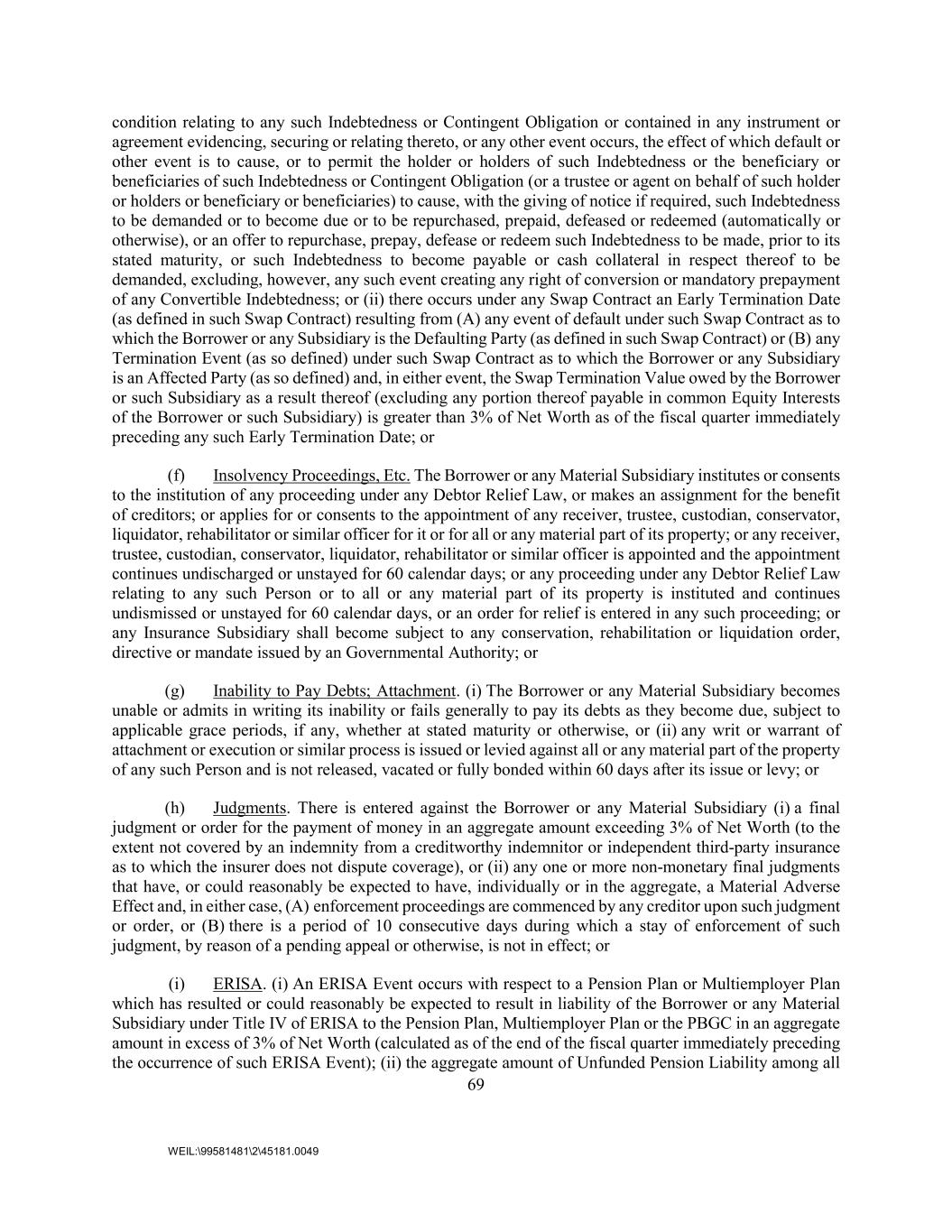 84 WEIL:\99581369\2\44393.0003 repurchase, prepay, defease or redeem such Indebtedness to be made, prior to its stated maturity, or such Indebtedness to become payable or cash collateral in respect thereof to be demanded, excluding, however, any such event creating any right of conversion or mandatory prepayment of any Convertible Indebtedness; or (ii) there occurs under any Swap Contract an Early Termination Date (as defined in such Swap Contract) resulting from (A) any event of default under such Swap Contract as to which the Borrower or any Subsidiary is the Defaulting Party (as defined in such Swap Contract) or (B) any Termination Event (as so defined) under such Swap Contract as to which the Borrower or any Subsidiary is an Affected Party (as so defined) and, in either event, the Swap Termination Value owed by the Borrower or such Subsidiary as a result thereof (excluding any portion thereof payable in common Equity Interests of the Borrower or such Subsidiary) is greater than 3% of Net Worth as of the fiscal quarter immediately preceding any such Early Termination Date; or (f) Insolvency Proceedings, Etc. The Borrower, any Guarantor or any Material Subsidiary institutes or consents to the institution of any proceeding under any Debtor Relief Law, or makes an assignment for the benefit of creditors; or applies for or consents to the appointment of any receiver, trustee, custodian, conservator, liquidator, rehabilitator or similar officer for it or for all or any material part of its property; or any receiver, trustee, custodian, conservator, liquidator, rehabilitator or similar officer is appointed and the appointment continues undischarged or unstayed for 60 calendar days; or any proceeding under any Debtor Relief Law relating to any such Person or to all or any material part of its property is instituted and continues undismissed or unstayed for 60 calendar days, or an order for relief is entered in any such proceeding; or any Insurance Subsidiary shall become subject to any conservation, rehabilitation or liquidation order, directive or mandate issued by an Governmental Authority; or (g) Inability to Pay Debts; Attachment. (i) The Borrower, any Guarantor or any Material Subsidiary becomes unable or admits in writing its inability or fails generally to pay its debts as they become due, subject to applicable grace periods, if any, whether at stated maturity or otherwise, or (ii) any writ or warrant of attachment or execution or similar process is issued or levied against all or any material part of the property of any such Person and is not released, vacated or fully bonded within 60 days after its issue or levy; or (h) Judgments. There is entered against the Borrower, any Guarantor or any Material Subsidiary (i) a final judgment or order for the payment of money in an aggregate amount exceeding 3% of Net Worth (to the extent not covered by an indemnity from a creditworthy indemnitor or independent third-party insurance as to which the insurer does not dispute coverage), or (ii) any one or more non-monetary final judgments that have, or could reasonably be expected to have, individually or in the aggregate, a Material Adverse Effect and, in either case, (A) enforcement proceedings are commenced by any creditor upon such judgment or order, or (B) there is a period of 10 consecutive days during which a stay of enforcement of such judgment, by reason of a pending appeal or otherwise, is not in effect; or (i) ERISA. (i) An ERISA Event occurs with respect to a Pension Plan or Multiemployer Plan which has resulted or could reasonably be expected to result in liability of the Borrower or any Material Subsidiary under Title IV of ERISA to the Pension Plan, Multiemployer Plan or the PBGC in an aggregate amount in excess of 3% of Net Worth (calculated as of the end of the fiscal quarter immediately preceding the occurrence of such ERISA Event); (ii) the aggregate amount of Unfunded Pension Liability among all Pension Plans at any time exceeds 3% of Net Worth (calculated as of the end of the fiscal quarter immediately preceding the most recent increase in Unfunded Pension Liability); or (iii) the Borrower or any ERISA Affiliate fails to pay when due, after the expiration of any applicable grace period, any installment payment with respect to its withdrawal liability under Section 4201 of ERISA under a