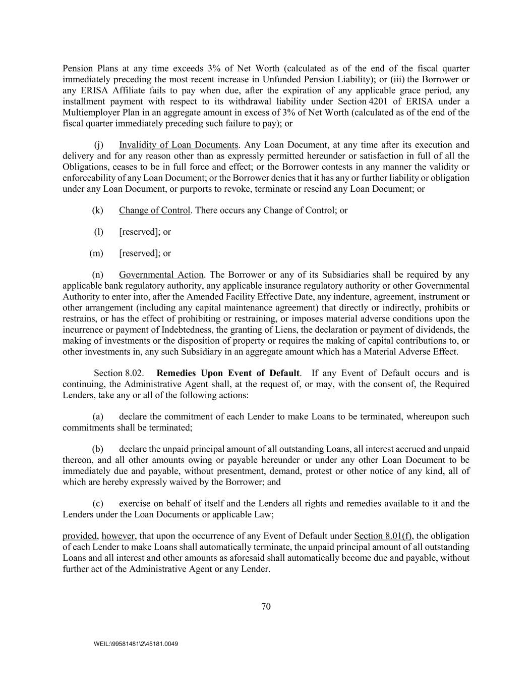 85 WEIL:\99581369\2\44393.0003 Multiemployer Plan in an aggregate amount in excess of 3% of Net Worth (calculated as of the end of the fiscal quarter immediately preceding such failure to pay); or (j) Invalidity of Loan Documents. Any Loan Document, at any time after its execution and delivery and for any reason other than as expressly permitted hereunder or satisfaction in full of all the Obligations, ceases to be in full force and effect; or any Loan Party contests in any manner the validity or enforceability of any Loan Document; or any Loan Party denies that it has any or further liability or obligation under any Loan Document, or purports to revoke, terminate or rescind any Loan Document; or (k) Change of Control. There occurs any Change of Control; or (l) [reserved]; or (m) [reserved]; or (n) Governmental Action. The Borrower or any of its Subsidiaries shall be required by any applicable bank regulatory authority, any applicable insurance regulatory authority or other Governmental Authority to enter into, after the Effective Date, any indenture, agreement, instrument or other arrangement (including any capital maintenance agreement) that directly or indirectly, prohibits or restrains, or has the effect of prohibiting or restraining, or imposes material adverse conditions upon the incurrence or payment of Indebtedness, the granting of Liens, the declaration or payment of dividends, the making of Investments or the disposition of property or requires the making of capital contributions to, or other Investments in, any such Subsidiary in an aggregate amount which has a Material Adverse Effect. Section 8.02. Remedies Upon Event of Default. If any Event of Default occurs and is continuing, the Administrative Agent shall, at the request of, or may, with the consent of, the Required Lenders, take any or all of the following actions: (a) declare the commitment of each Lender to make Loans and any obligation (if any) of the L/C Issuers to make L/C Credit Extensions to be terminated, whereupon such commitments shall be terminated; (b) declare the unpaid principal amount of all outstanding Loans, all interest accrued and unpaid thereon, and all other amounts owing or payable hereunder or under any other Loan Document to be immediately due and payable, without presentment, demand, protest or other notice of any kind, all of which are hereby expressly waived by the Borrower; (c) require that the Borrower Cash Collateralize the L/C Obligations (in an amount equal to 100% of the face amount of such Letter of Credit); and (d) exercise on behalf of itself, the Lenders and the L/C Issuers all rights and remedies available to it the Lenders and the L/C Issuers under the Loan Documents or applicable Law; provided, however, that upon the occurrence of any Event of Default under Section 8.01(f), the obligation of each Lender to make Loans and the obligation (if any) of any L/C Issuer to make L/C Credit Extensions shall automatically terminate, the unpaid principal amount of all outstanding Loans and all interest and other amounts as aforesaid shall automatically become due and payable, and the obligation of the Borrower to Cash Collateralize the L/C Obligations as aforesaid shall automatically become effective, in each case without further act of the Administrative Agent or any Lender.