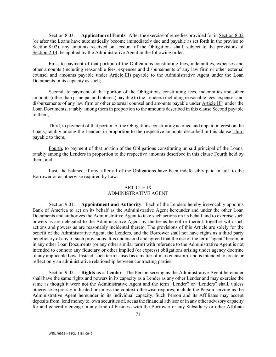 86 WEIL:\99581369\2\44393.0003 Section 8.03. Application of Funds. After the exercise of remedies provided for in Section 8.02 (or after the Loans have automatically become immediately due and payable and the L/C Obligations have automatically been required to be Cash Collateralized as set forth in the proviso to Section 8.02), any amounts received on account of the Obligations shall, subject to the provisions of Section 2.14, be applied by the Administrative Agent in the following order: First, to payment of that portion of the Obligations constituting fees, indemnities, expenses and other amounts (including reasonable fees, expenses and disbursements of any law firm or other external counsel and amounts payable under Article III) payable to the Administrative Agent under the Loan Documents in its capacity as such; Second, to payment of that portion of the Obligations constituting fees, indemnities and other amounts (other than principal and interest) payable to the Lenders and the L/C Issuers (including reasonable fees, expenses and disbursements of any law firm or other external counsel and amounts payable under Article III) under the Loan Documents, ratably among them in proportion to the amounts described in this clause Second payable to them; Third, to payment of that portion of the Obligations constituting accrued and unpaid L/C Fees interest on the Loans, L/C Reimbursement Loans and other Obligations arising under the Loan Documents ratably among the Lenders and the L/C Issuers in proportion to the respective amounts described in this clause Third payable to them; Fourth, ratably among the Lenders and L/C Issuers in proportion to the respective amounts described in this clause Fourth held by them (A) to payment of that portion of the Obligations constituting unpaid principal of the Loans and L/C Reimbursement Loans, and (B) to Cash Collateralize the L/C Obligations to the extent not otherwise Cash Collateralized by the Borrower pursuant to Section 2.14 or 2.15; provided that (x) any such amounts applied pursuant to subclause (B) above shall be paid to the Administrative Agent for the ratable account of the applicable L/C Issuer to Cash Collateralize L/C Obligations, (y) subject to Sections 2.14 and 2.15, amounts used to Cash Collateralize the aggregate amount of Letters of Credit pursuant to this clause Fourth shall be used to satisfy drawings under such Letters of Credit as they occur and (z) upon the expiration of any Letter of Credit (without any pending drawings), the pro rata share of Cash Collateral shall be distributed to the other Obligations, if any, in the order set forth in this Section 8.03; and Last, the balance, if any, after all of the Obligations have been indefeasibly paid in full, to the Borrower or as otherwise required by Law. ARTICLE IX ADMINISTRATIVE AGENT Section 9.01. Appointment and Authority. Each of the Lenders and L/C Issuers hereby irrevocably appoints Bank of America to act on its behalf as the Administrative Agent hereunder and under the other Loan Documents and authorizes the Administrative Agent to take such actions on its behalf and to exercise such powers as are delegated to the Administrative Agent by the terms hereof or thereof, together with such actions and powers as are reasonably incidental thereto. The provisions of this Article (other than Section 9.11) are solely for the benefit of the Administrative Agent and the Lenders, and the Borrower shall not have rights as a third party beneficiary of any of such provisions. It is understood and agreed that the use of the term “agent” herein or in any other Loan Documents (or any other similar term) with reference to the Administrative Agent is not intended to connote any fiduciary or other implied (or express)