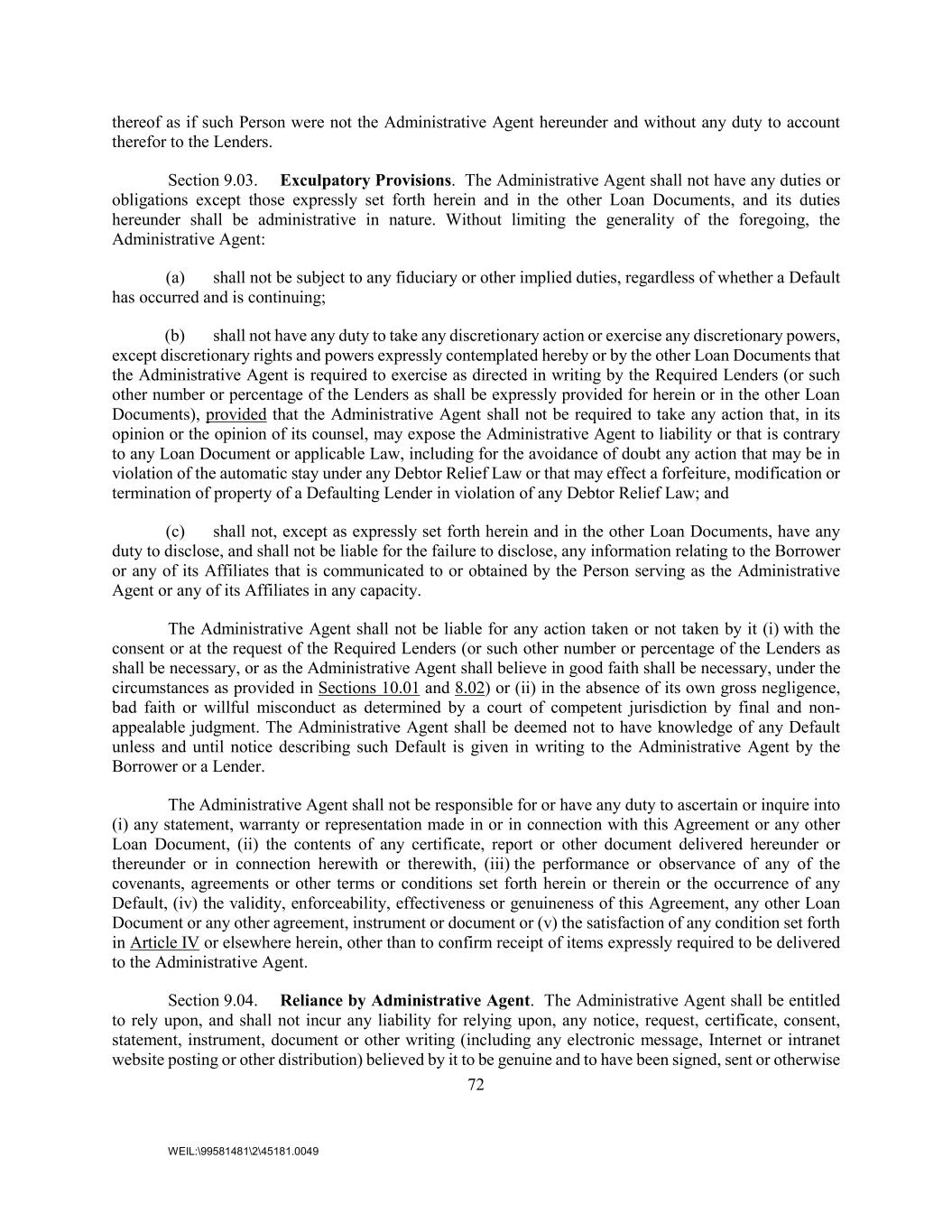 87 WEIL:\99581369\2\44393.0003 obligations arising under agency doctrine of any applicable Law. Instead such term is used as a matter of market custom, and is intended to create or reflect only an administrative relationship between contracting parties. Each L/C Issuer shall act on behalf of the Lenders with respect to any Letters of Credit issued by it and the documents associated therewith, and each L/C Issuer shall have all of the benefits and immunities (A) provided to the Administrative Agent in this Article IX with respect to any acts taken or omissions suffered by each L/C Issuer in connection with Letters of Credit issued by it or proposed to be issued by it and the applications and agreements for letters of credit pertaining to such Letters of Credit as fully as if the term “Administrative Agent” as used in this Article IX, and (B) as additionally provided herein with respect to such L/C Issuer. Section 9.02. Rights as a Lender. The Person serving as the Administrative Agent hereunder shall have the same rights and powers in its capacity as a Lender as any other Lender and may exercise the same as though it were not the Administrative Agent and the term “Lender” or “Lenders” shall, unless otherwise expressly indicated or unless the context otherwise requires, include the Person serving as the Administrative Agent hereunder in its individual capacity. Such Person and its Affiliates may accept deposits from, lend money to, own securities of, act as the financial advisor or in any other advisory capacity for and generally engage in any kind of business with the Borrower or any Subsidiary or other Affiliate thereof as if such Person were not the Administrative Agent hereunder and without any duty to account therefor to the Lenders. Section 9.03. Exculpatory Provisions. The Administrative Agent shall not have any duties or obligations except those expressly set forth herein and in the other Loan Documents, and its duties hereunder shall be administrative in nature. Without limiting the generality of the foregoing, the Administrative Agent: (a) shall not be subject to any fiduciary or other implied duties, regardless of whether a Default has occurred and is continuing; (b) shall not have any duty to take any discretionary action or exercise any discretionary powers, except discretionary rights and powers expressly contemplated hereby or by the other Loan Documents that the Administrative Agent is required to exercise as directed in writing by the Required Lenders (or such other number or percentage of the Lenders as shall be expressly provided for herein or in the other Loan Documents), provided that the Administrative Agent shall not be required to take any action that, in its opinion or the opinion of its counsel, may expose the Administrative Agent to liability or that is contrary to any Loan Document or applicable Law, including for the avoidance of doubt any action that may be in violation of the automatic stay under any Debtor Relief Law or that may effect a forfeiture, modification or termination of property of a Defaulting Lender in violation of any Debtor Relief Law; and (c) shall not, except as expressly set forth herein and in the other Loan Documents, have any duty to disclose, and shall not be liable for the failure to disclose, any information relating to the Borrower or any of its Affiliates that is communicated to or obtained by the Person serving as the Administrative Agent or any of its Affiliates in any capacity. The Administrative Agent shall not be liable for any action taken or not taken by it (i) with the consent or at the request of the Required Lenders (or such other number or percentage of the Lenders as shall be necessary, or as the Administrative Agent shall believe in good faith shall be necessary, under the circumstances as provided in Sections 10.01 and 8.02) or (ii) in the absence of its own gross negligence, bad faith or willful misconduct as determined by a court of competent jurisdiction by final and non- appealable judgment. The Administrative Agent shall be deemed not to have knowledge of any Default
