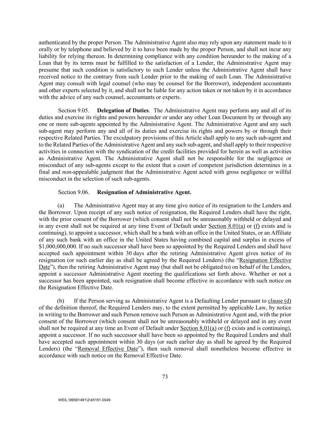 88 WEIL:\99581369\2\44393.0003 unless and until notice describing such Default is given in writing to the Administrative Agent by the Borrower or a Lender. The Administrative Agent shall not be responsible for or have any duty to ascertain or inquire into (i) any statement, warranty or representation made in or in connection with this Agreement or any other Loan Document, (ii) the contents of any certificate, report or other document delivered hereunder or thereunder or in connection herewith or therewith, (iii) the performance or observance of any of the covenants, agreements or other terms or conditions set forth herein or therein or the occurrence of any Default, (iv) the validity, enforceability, effectiveness or genuineness of this Agreement, any other Loan Document or any other agreement, instrument or document or (v) the satisfaction of any condition set forth in Article IV or elsewhere herein, other than to confirm receipt of items expressly required to be delivered to the Administrative Agent. Section 9.04. Reliance by Administrative Agent. The Administrative Agent shall be entitled to rely upon, and shall not incur any liability for relying upon, any notice, request, certificate, consent, statement, instrument, document or other writing (including any electronic message, Internet or intranet website posting or other distribution) believed by it to be genuine and to have been signed, sent or otherwise authenticated by the proper Person. The Administrative Agent also may rely upon any statement made to it orally or by telephone and believed by it to have been made by the proper Person, and shall not incur any liability for relying thereon. In determining compliance with any condition hereunder to the making of a Loan that by its terms must be fulfilled to the satisfaction of a Lender, the Administrative Agent may presume that such condition is satisfactory to such Lender unless the Administrative Agent shall have received notice to the contrary from such Lender prior to the making of such Loan. The Administrative Agent may consult with legal counsel (who may be counsel for the Borrower), independent accountants and other experts selected by it, and shall not be liable for any action taken or not taken by it in accordance with the advice of any such counsel, accountants or experts. Section 9.05. Delegation of Duties. The Administrative Agent may perform any and all of its duties and exercise its rights and powers hereunder or under any other Loan Document by or through any one or more sub-agents appointed by the Administrative Agent. The Administrative Agent and any such sub-agent may perform any and all of its duties and exercise its rights and powers by or through their respective Related Parties. The exculpatory provisions of this Article shall apply to any such sub-agent and to the Related Parties of the Administrative Agent and any such sub-agent, and shall apply to their respective activities in connection with the syndication of the credit facilities provided for herein as well as activities as Administrative Agent. The Administrative Agent shall not be responsible for the negligence or misconduct of any sub-agents except to the extent that a court of competent jurisdiction determines in a final and non-appealable judgment that the Administrative Agent acted with gross negligence or willful misconduct in the selection of such sub-agents. Section 9.06. Resignation of Administrative Agent. (a) The Administrative Agent may at any time give notice of its resignation to the Lenders and the Borrower. Upon receipt of any such notice of resignation, the Required Lenders shall have the right, with the prior consent of the Borrower (which consent shall not be unreasonably withheld or delayed and in any event shall not be required at any time Event of Default under Section 8.01(a) or (f) exists and is continuing), to appoint a successor, which shall be a bank with an office in the United States, or an Affiliate of any such bank with an office in the United States having combined capital and surplus in excess of $1,000,000,000. If no such successor shall have been so appointed by the Required Lenders and shall have accepted such appointment within 30 days after the retiring Administrative Agent gives notice of its