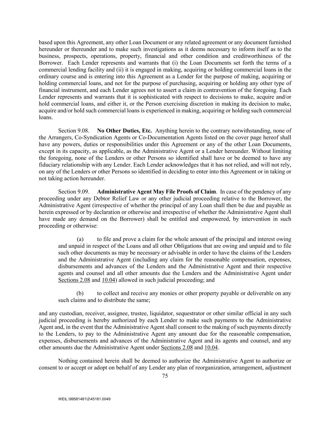 90 WEIL:\99581369\2\44393.0003 Section 9.07. Non-Reliance on Administrative Agent, the Arrangers and Other Lenders. Each Lender expressly acknowledges that none of the Administrative Agent nor any Arranger has made any representation or warranty to it, and that no act by the Administrative Agent or any Arranger hereafter taken, including any consent to, and acceptance of any assignment or review of the affairs of the Borrower or any Affiliate thereof, shall be deemed to constitute any representation or warranty by the Administrative Agent or any Arranger to any Lender as to any matter, including whether the Administrative Agent or Arranger have disclosed material information in their (or their Related Parties’) possession. Each Lender represents to the Administrative Agent and any Arranger that it has, independently and without reliance upon the Administrative Agent, any Arranger, any other Lender or any of their Related Parties and based on such documents and information as it has deemed appropriate, made its own credit analysis of, appraisal of, and investigation into, the business, prospects, operations, property, financial and other condition and creditworthiness of the Borrower and its Subsidiaries, and all applicable bank or other regulatory Laws relating to the transactions contemplated hereby, and made its own decision to enter into this Agreement and to extend credit to the Borrower hereunder. Each Lender also acknowledges that it will, independently and without reliance upon the Administrative Agent, any Arranger, any other Lender or any of their Related Parties and based on such documents and information as it shall from time to time deem appropriate, continue to make its own credit analysis, appraisals and decisions in taking or not taking action under or based upon this Agreement, any other Loan Document or any related agreement or any document furnished hereunder or thereunder and to make such investigations as it deems necessary to inform itself as to the business, prospects, operations, property, financial and other condition and creditworthiness of the Borrower. Each Lender represents and warrants that (i) the Loan Documents set forth the terms of a commercial lending facility and (ii) it is engaged in making, acquiring or holding commercial loans in the ordinary course and is entering into this Agreement as a Lender for the purpose of making, acquiring or holding commercial loans, and not for the purpose of purchasing, acquiring or holding any other type of financial instrument, and each Lender agrees not to assert a claim in contravention of the foregoing. Each Lender represents and warrants that it is sophisticated with respect to decisions to make, acquire and/or hold commercial loans, and either it, or the Person exercising discretion in making its decision to make, acquire and/or hold such commercial loans is experienced in making, acquiring or holding such commercial loans. Section 9.08. No Other Duties, Etc. Anything herein to the contrary notwithstanding, none of the Arrangers, Co-Syndication Agents or Co-Documentation Agents listed on the cover page hereof shall have any powers, duties or responsibilities under this Agreement or any of the other Loan Documents, except in its capacity, as applicable, as the Administrative Agent or a Lender hereunder. Without limiting the foregoing, none of the Lenders or other Persons so identified shall have or be deemed to have any fiduciary relationship with any Lender. Each Lender acknowledges that it has not relied, and will not rely, on any of the Lenders or other Persons so identified in deciding to enter into this Agreement or in taking or not taking action hereunder. Section 9.09. Administrative Agent May File Proofs of Claim. In case of the pendency of any proceeding under any Debtor Relief Law or any other judicial proceeding relative to the Borrower, the Administrative Agent (irrespective of whether the principal of any Loan shall then be due and payable as herein expressed or by declaration or otherwise and irrespective of whether the Administrative Agent shall have made any demand on the Borrower) shall be entitled and empowered, by intervention in such proceeding or otherwise (a) to file and prove a claim for the whole amount of the principal and interest owing and unpaid in respect of the Loans and all other Obligations that are owing and unpaid and to file such other documents as may be necessary or advisable in order to have the claims of the Lenders and the Administrative Agent