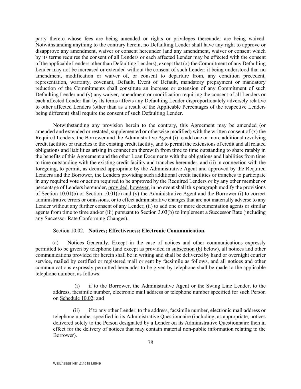 94 WEIL:\99581369\2\44393.0003 Notwithstanding any provision herein to the contrary, this Agreement may be amended (or amended and extended or restated, supplemented or otherwise modified) with the written consent of (x) the Required Lenders, the Borrower and the Administrative Agent (i) to add one or more additional revolving credit facilities or tranches to the existing credit facility, and to permit the extensions of credit and all related obligations and liabilities arising in connection therewith from time to time outstanding to share ratably in the benefits of this Agreement and the other Loan Documents with the obligations and liabilities from time to time outstanding with the existing credit facility and tranches hereunder, and (ii) in connection with the foregoing, to permit, as deemed appropriate by the Administrative Agent and approved by the Required Lenders and the Borrower, the Lenders providing such additional credit facilities or tranches to participate in any required vote or action required to be approved by the Required Lenders or by any other member or percentage of Lenders hereunder, provided, however, in no event shall this paragraph modify the provisions of Section 10.01(b) or Section 10.01(c) and (y) the Administrative Agent and the Borrower (i) to correct administrative errors or omissions, or to effect administrative changes that are not materially adverse to any Lender without any further consent of any Lender, (ii) to add one or more documentation agents or similar agents from time to time and/or (iii) pursuant to Section 3.03(b) to implement a Successor Rate (including any Successor Rate Conforming Changes). Section 10.02. Notices; Effectiveness; Electronic Communication. (a) Notices Generally. Except in the case of notices and other communications expressly permitted to be given by telephone (and except as provided in subsection (b) below), all notices and other communications provided for herein shall be in writing and shall be delivered by hand or overnight courier service, mailed by certified or registered mail or sent by facsimile as follows, and all notices and other communications expressly permitted hereunder to be given by telephone shall be made to the applicable telephone number, as follows: (i) if to the Borrower, the Administrative Agent or the Swing Line Lender, to the address, facsimile number, electronic mail address or telephone number specified for such Person on Schedule 10.02; and (ii) if to any other Lender, to the address, facsimile number, electronic mail address or telephone number specified in its Administrative Questionnaire (including, as appropriate, notices delivered solely to the Person designated by a Lender on its Administrative Questionnaire then in effect for the delivery of notices that may contain material non-public information relating to the Borrower). Notices and other communications sent by hand or overnight courier service, or mailed by certified or registered mail, shall be deemed to have been given when received; notices and other communications sent by facsimile shall be deemed to have been given when sent (except that, if not given during normal business hours for the recipient, shall be deemed to have been given at the opening of business on the next Business Day for the recipient). Notices and other communications delivered through electronic communications to the extent provided in subsection (b) below, shall be effective as provided in such subsection (b). (b) Electronic Communications. Notices and other communications to the Lenders hereunder may be delivered or furnished by electronic communication (including e-mail and Internet or intranet websites) pursuant to procedures approved by the Administrative Agent or as otherwise provided in this Agreement, provided that the foregoing shall not apply to notices to any Lender pursuant to Article II if such Lender has notified the Administrative Agent that it is incapable of receiving notices under such Article by electronic communication. The Administrative Agent, the Swing Line Lender or the Borrower