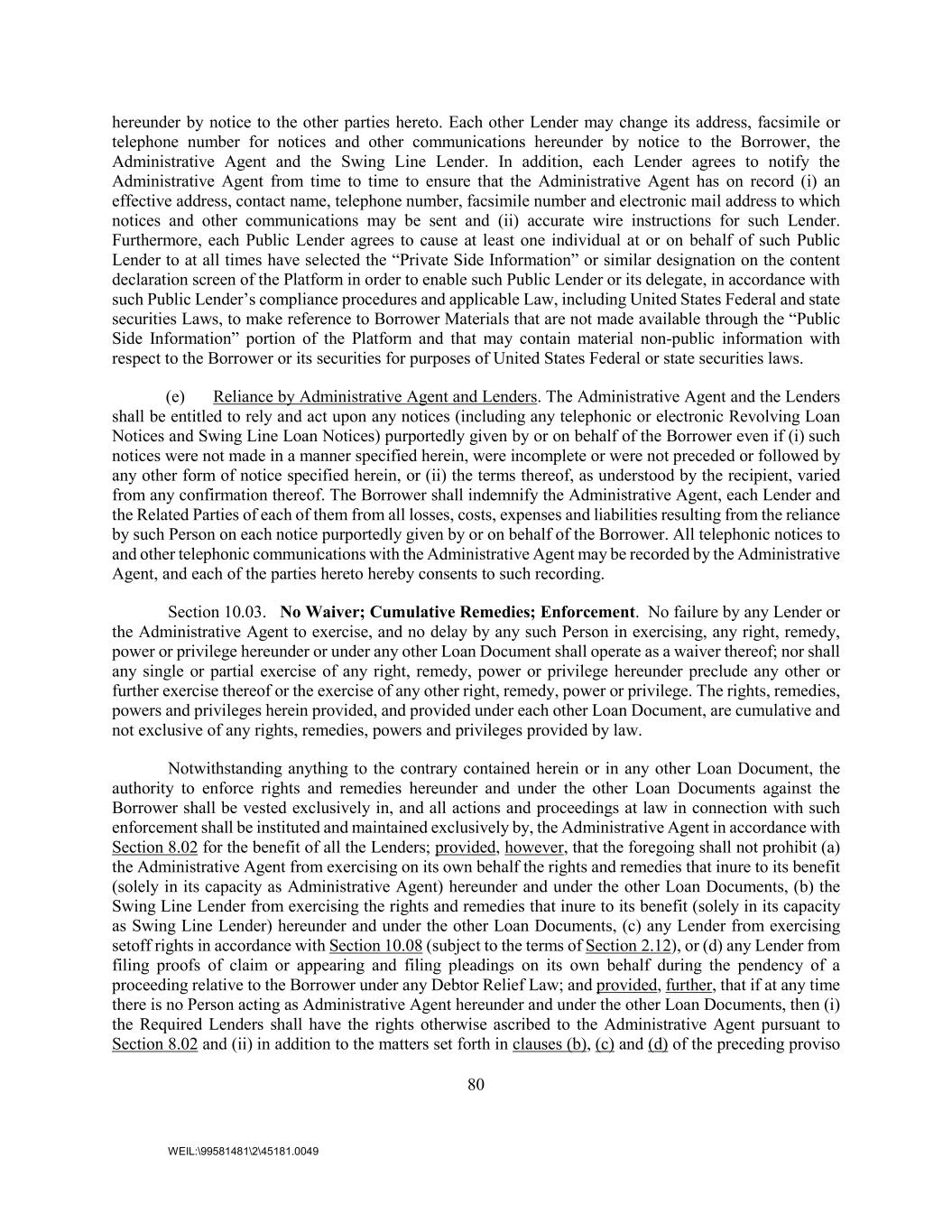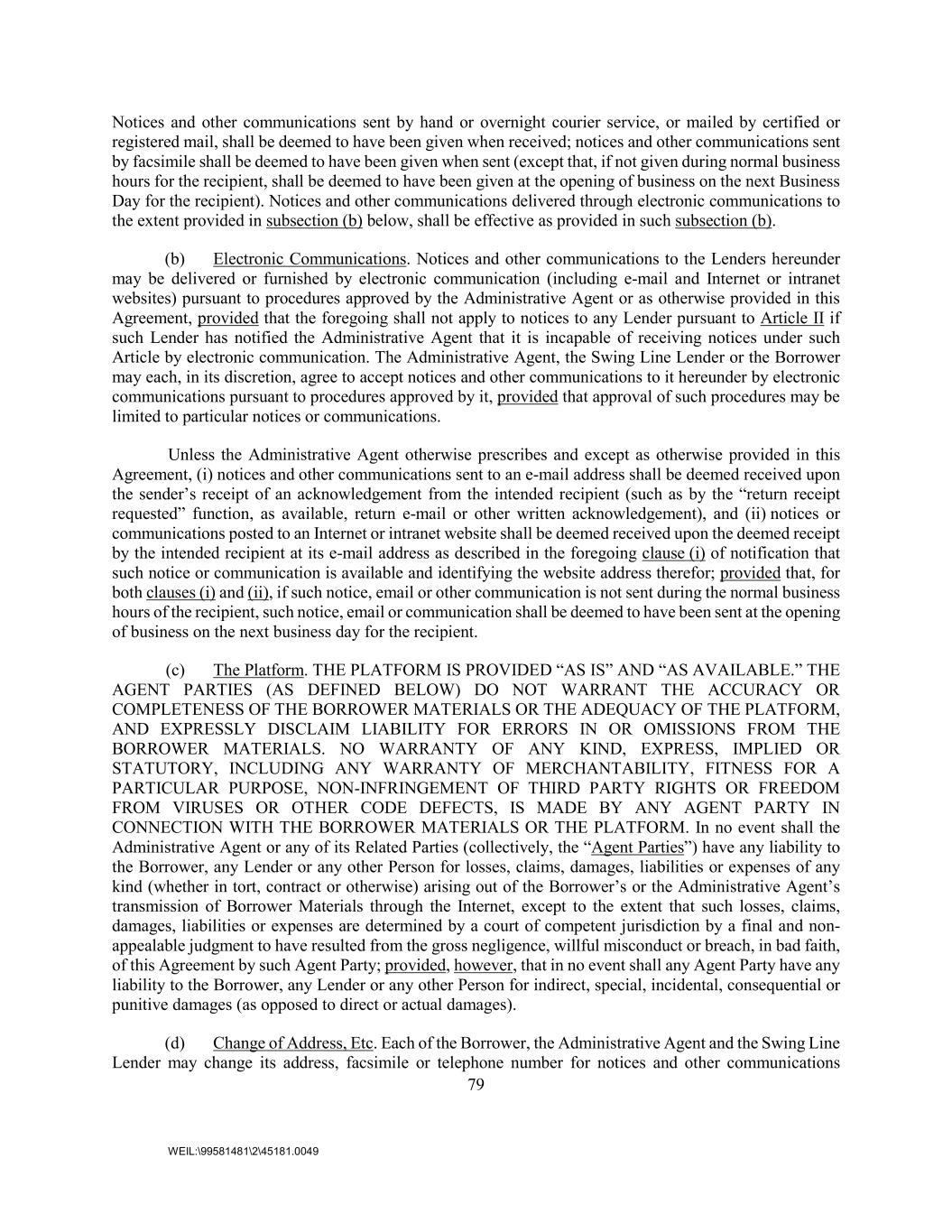 95 WEIL:\99581369\2\44393.0003 may each, in its discretion, agree to accept notices and other communications to it hereunder by electronic communications pursuant to procedures approved by it, provided that approval of such procedures may be limited to particular notices or communications. Unless the Administrative Agent otherwise prescribes and except as otherwise provided in this Agreement, (i) notices and other communications sent to an e-mail address shall be deemed received upon the sender’s receipt of an acknowledgement from the intended recipient (such as by the “return receipt requested” function, as available, return e-mail or other written acknowledgement), and (ii) notices or communications posted to an Internet or intranet website shall be deemed received upon the deemed receipt by the intended recipient at its e-mail address as described in the foregoing clause (i) of notification that such notice or communication is available and identifying the website address therefor; provided that, for both clauses (i) and (ii), if such notice, email or other communication is not sent during the normal business hours of the recipient, such notice, email or communication shall be deemed to have been sent at the opening of business on the next business day for the recipient. (c) The Platform. THE PLATFORM IS PROVIDED “AS IS” AND “AS AVAILABLE.” THE AGENT PARTIES (AS DEFINED BELOW) DO NOT WARRANT THE ACCURACY OR COMPLETENESS OF THE BORROWER MATERIALS OR THE ADEQUACY OF THE PLATFORM, AND EXPRESSLY DISCLAIM LIABILITY FOR ERRORS IN OR OMISSIONS FROM THE BORROWER MATERIALS. NO WARRANTY OF ANY KIND, EXPRESS, IMPLIED OR STATUTORY, INCLUDING ANY WARRANTY OF MERCHANTABILITY, FITNESS FOR A PARTICULAR PURPOSE, NON-INFRINGEMENT OF THIRD PARTY RIGHTS OR FREEDOM FROM VIRUSES OR OTHER CODE DEFECTS, IS MADE BY ANY AGENT PARTY IN CONNECTION WITH THE BORROWER MATERIALS OR THE PLATFORM. In no event shall the Administrative Agent or any of its Related Parties (collectively, the “Agent Parties”) have any liability to the Borrower, any Lender or any other Person for losses, claims, damages, liabilities or expenses of any kind (whether in tort, contract or otherwise) arising out of the Borrower’s or the Administrative Agent’s transmission of Borrower Materials through the Internet, except to the extent that such losses, claims, damages, liabilities or expenses are determined by a court of competent jurisdiction by a final and non- appealable judgment to have resulted from the gross negligence, willful misconduct or breach, in bad faith, of this Agreement by such Agent Party; provided, however, that in no event shall any Agent Party have any liability to the Borrower, any Lender or any other Person for indirect, special, incidental, consequential or punitive damages (as opposed to direct or actual damages). (d) Change of Address, Etc. Each of the Borrower, the Administrative Agent and the Swing Line Lender may change its address, facsimile or telephone number for notices and other communications hereunder by notice to the other parties hereto. Each other Lender may change its address, facsimile or telephone number for notices and other communications hereunder by notice to the Borrower, the Administrative Agent and the Swing Line Lender. In addition, each Lender agrees to notify the Administrative Agent from time to time to ensure that the Administrative Agent has on record (i) an effective address, contact name, telephone number, facsimile number and electronic mail address to which notices and other communications may be sent and (ii) accurate wire instructions for such Lender. Furthermore, each Public Lender agrees to cause at least one individual at or on behalf of such Public Lender to at all times have selected the “Private Side Information” or similar designation on the content declaration screen of the Platform in order to enable such Public Lender or its delegate, in accordance with such Public Lender’s compliance procedures and applicable Law, including United States Federal and state securities Laws, to make reference to Borrower Materials that are not made available through the “Public Side Information” portion of the Platform and that may contain material non-public information with respect to the Borrower or its securities for purposes of United States Federal or state securities laws.