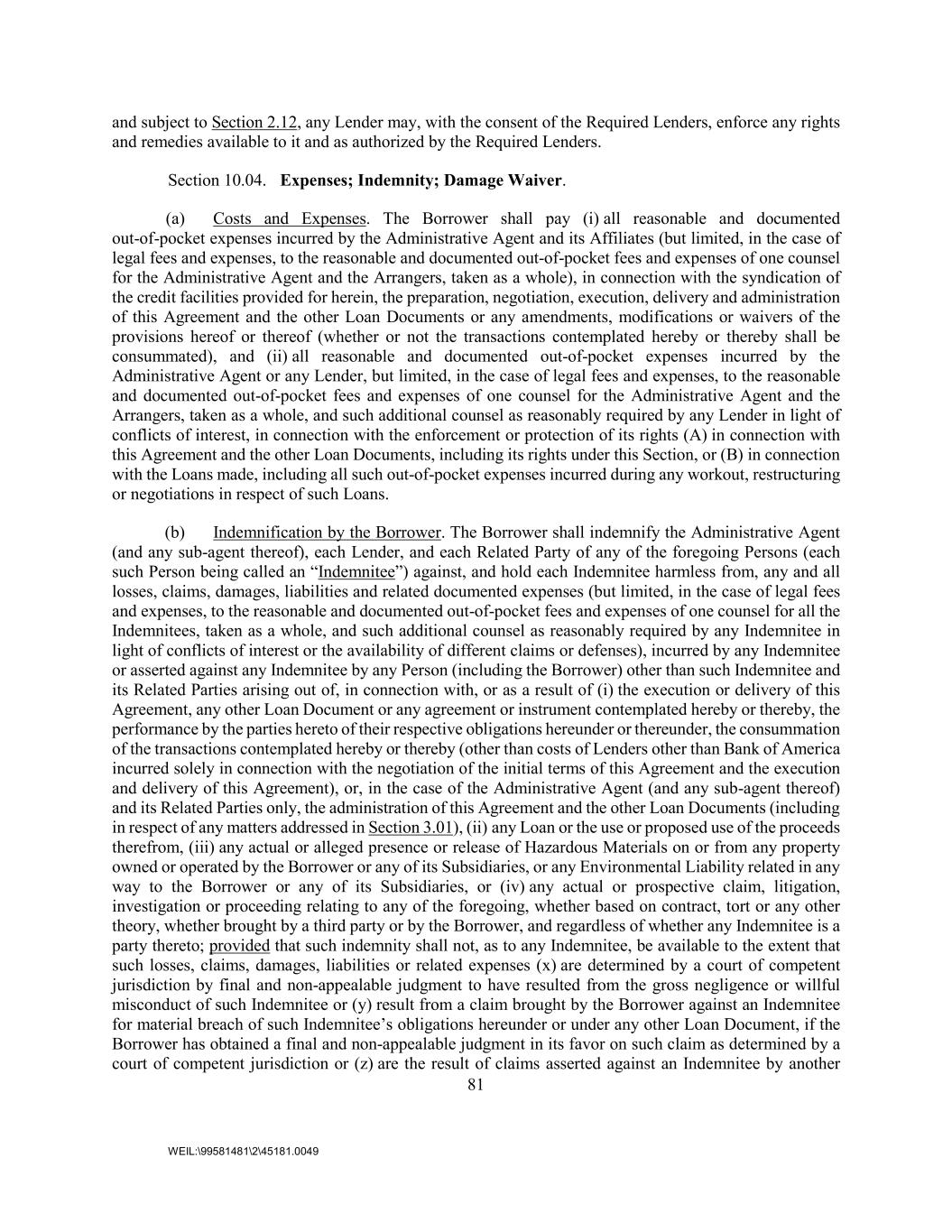 96 WEIL:\99581369\2\44393.0003 (e) Reliance by Administrative Agent and Lenders. The Administrative Agent and the Lenders shall be entitled to rely and act upon any notices (including any telephonic or electronic Revolving Loan Notices and Swing Line Loan Notices) purportedly given by or on behalf of the Borrower even if (i) such notices were not made in a manner specified herein, were incomplete or were not preceded or followed by any other form of notice specified herein, or (ii) the terms thereof, as understood by the recipient, varied from any confirmation thereof. The Borrower shall indemnify the Administrative Agent, each Lender and the Related Parties of each of them from all losses, costs, expenses and liabilities resulting from the reliance by such Person on each notice purportedly given by or on behalf of the Borrower. All telephonic notices to and other telephonic communications with the Administrative Agent may be recorded by the Administrative Agent, and each of the parties hereto hereby consents to such recording. Section 10.03. No Waiver; Cumulative Remedies; Enforcement. No failure by any Lender or the Administrative Agent to exercise, and no delay by any such Person in exercising, any right, remedy, power or privilege hereunder or under any other Loan Document shall operate as a waiver thereof; nor shall any single or partial exercise of any right, remedy, power or privilege hereunder preclude any other or further exercise thereof or the exercise of any other right, remedy, power or privilege. The rights, remedies, powers and privileges herein provided, and provided under each other Loan Document, are cumulative and not exclusive of any rights, remedies, powers and privileges provided by law. Notwithstanding anything to the contrary contained herein or in any other Loan Document, the authority to enforce rights and remedies hereunder and under the other Loan Documents against the Borrower shall be vested exclusively in, and all actions and proceedings at law in connection with such enforcement shall be instituted and maintained exclusively by, the Administrative Agent in accordance with Section 8.02 for the benefit of all the Lenders; provided, however, that the foregoing shall not prohibit (a) the Administrative Agent from exercising on its own behalf the rights and remedies that inure to its benefit (solely in its capacity as Administrative Agent) hereunder and under the other Loan Documents, (b) the Swing Line Lender from exercising the rights and remedies that inure to its benefit (solely in its capacity as Swing Line Lender) hereunder and under the other Loan Documents, (c) any Lender from exercising setoff rights in accordance with Section 10.08 (subject to the terms of Section 2.12), or (d) any Lender from filing proofs of claim or appearing and filing pleadings on its own behalf during the pendency of a proceeding relative to the Borrower under any Debtor Relief Law; and provided, further, that if at any time there is no Person acting as Administrative Agent hereunder and under the other Loan Documents, then (i) the Required Lenders shall have the rights otherwise ascribed to the Administrative Agent pursuant to Section 8.02 and (ii) in addition to the matters set forth in clauses (b), (c) and (d) of the preceding proviso and subject to Section 2.12, any Lender may, with the consent of the Required Lenders, enforce any rights and remedies available to it and as authorized by the Required Lenders. Section 10.04. Expenses; Indemnity; Damage Waiver. (a) Costs and Expenses. The Borrower shall pay (i) all reasonable and documented out-of-pocket expenses incurred by the Administrative Agent and its Affiliates (but limited, in the case of legal fees and expenses, to the reasonable and documented out-of-pocket fees and expenses of one primary counsel for the Administrative Agent and the Arrangers, taken as a whole, and a single local counsel in each relevant material jurisdiction), in connection with the syndication of the credit facilities provided for herein, the preparation, negotiation, execution, delivery and administration of this Agreement and the other Loan Documents or any amendments, modifications or waivers of the provisions hereof or thereof (whether or not the transactions contemplated hereby or thereby shall be consummated), and (ii) all reasonable and documented out-of-pocket expenses incurred by the Administrative Agent or any Lender, but limited, in the case of legal fees and expenses, to the reasonable and documented out-of-pocket fees and expenses of