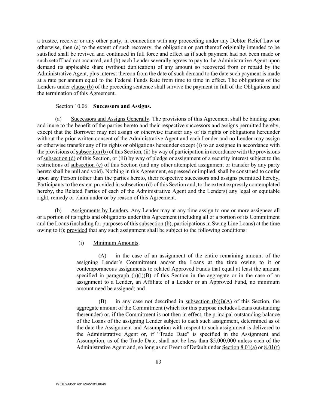 99 WEIL:\99581369\2\44393.0003 except that the Borrower may not assign or otherwise transfer any of its rights or obligations hereunder without the prior written consent of the Administrative Agent and each Lender and no Lender may assign or otherwise transfer any of its rights or obligations hereunder except (i) to an assignee in accordance with the provisions of subsection (b) of this Section, (ii) by way of participation in accordance with the provisions of subsection (d) of this Section, or (iii) by way of pledge or assignment of a security interest subject to the restrictions of subsection (e) of this Section (and any other attempted assignment or transfer by any party hereto shall be null and void). Nothing in this Agreement, expressed or implied, shall be construed to confer upon any Person (other than the parties hereto, their respective successors and assigns permitted hereby, Participants to the extent provided in subsection (d) of this Section and, to the extent expressly contemplated hereby, the Related Parties of each of the Administrative Agent and the Lenders) any legal or equitable right, remedy or claim under or by reason of this Agreement. (b) Assignments by Lenders. Any Lender may at any time assign to one or more assignees all or a portion of its rights and obligations under this Agreement (including all or a portion of its Commitment and the Loans (including for purposes of this subsection (b), participations in Swing Line Loans) at the time owing to it); provided that any such assignment shall be subject to the following conditions: (i) Minimum Amounts. (A) in the case of an assignment of the entire remaining amount of the assigning Lender’s Commitment and/or the Loans at the time owing to it or contemporaneous assignments to related Approved Funds that equal at least the amount specified in paragraph (b)(i)(B) of this Section in the aggregate or in the case of an assignment to a Lender, an Affiliate of a Lender or an Approved Fund, no minimum amount need be assigned; and (B) in any case not described in subsection (b)(i)(A) of this Section, the aggregate amount of the Commitment (which for this purpose includes Loans outstanding thereunder) or, if the Commitment is not then in effect, the principal outstanding balance of the Loans of the assigning Lender subject to each such assignment, determined as of the date the Assignment and Assumption with respect to such assignment is delivered to the Administrative Agent or, if “Trade Date” is specified in the Assignment and Assumption, as of the Trade Date, shall not be less than $5,000,000 unless each of the Administrative Agent and, so long as no Event of Default under Section 8.01(a) or 8.01(f) has occurred and is continuing, the Borrower otherwise consents (each such consent not to be unreasonably withheld or delayed). (ii) Proportionate Amounts. Each partial assignment shall be made as an assignment of a proportionate part of all the assigning Lender’s rights and obligations under this Agreement with respect to the Loans or the Commitment assigned, except that this clause (ii) shall not apply to the Swing Line Lender’s rights and obligations in respect of Swing Line Loans; (iii) Required Consents. No consent shall be required for any assignment of Commitments or Loans except to the extent required by subsection (b)(i)(B) of this Section and, in addition: (A) the consent of the Borrower (such consent not to be unreasonably withheld or delayed) shall be required unless (1) an Event of Default under Section 8.01(a) or 8.01(f) has occurred and is continuing at the time of such assignment or (2) such assignment is to a Lender, an Affiliate of a Lender or an Approved Fund; provided that the Borrower