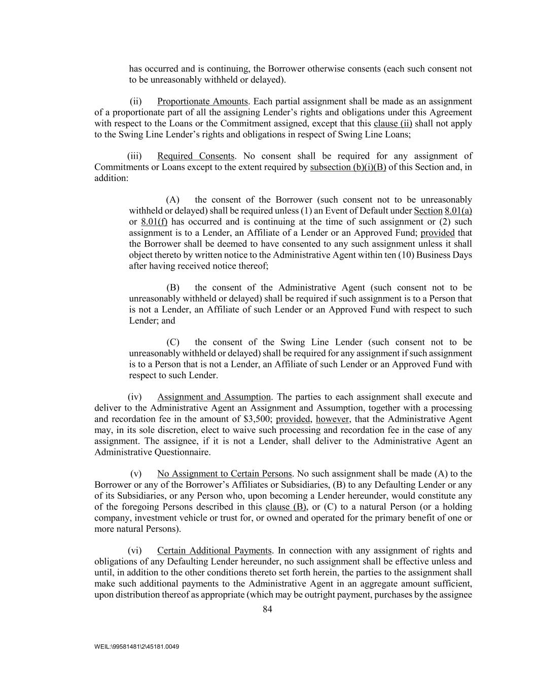 100 WEIL:\99581369\2\44393.0003 shall be deemed to have consented to any such assignment unless it shall object thereto by written notice to the Administrative Agent within ten (10) Business Days after having received notice thereof; (B) the consent of the Administrative Agent (such consent not to be unreasonably withheld or delayed) shall be required if such assignment is to a Person that is not a Lender, an Affiliate of such Lender or an Approved Fund with respect to such Lender; and (C) the consent of the Swing Line Lender (such consent not to be unreasonably withheld or delayed) shall be required for any assignment if such assignment is to a Person that is not a Lender, an Affiliate of such Lender or an Approved Fund with respect to such Lender. (iv) Assignment and Assumption. The parties to each assignment shall execute and deliver to the Administrative Agent an Assignment and Assumption, together with a processing and recordation fee in the amount of $3,500; provided, however, that the Administrative Agent may, in its sole discretion, elect to waive such processing and recordation fee in the case of any assignment. The assignee, if it is not a Lender, shall deliver to the Administrative Agent an Administrative Questionnaire. (v) No Assignment to Certain Persons. No such assignment shall be made (A) to the Borrower or any of the Borrower’s Affiliates or Subsidiaries, (B) to any Defaulting Lender or any of its Subsidiaries, or any Person who, upon becoming a Lender hereunder, would constitute any of the foregoing Persons described in this clause (B), or (C) to a natural Person (or a holding company, investment vehicle or trust for, or owned and operated for the primary benefit of one or more natural Persons). (vi) Certain Additional Payments. In connection with any assignment of rights and obligations of any Defaulting Lender hereunder, no such assignment shall be effective unless and until, in addition to the other conditions thereto set forth herein, the parties to the assignment shall make such additional payments to the Administrative Agent in an aggregate amount sufficient, upon distribution thereof as appropriate (which may be outright payment, purchases by the assignee of participations or subparticipations, or other compensating actions, including funding, with the consent of the Borrower and the Administrative Agent, the applicable pro rata share of Loans previously requested but not funded by the Defaulting Lender, to each of which the applicable assignee and assignor hereby irrevocably consent), to (x) pay and satisfy in full all payment liabilities then owed by such Defaulting Lender to the Administrative Agent or any Lender hereunder (and interest accrued thereon) and (y) acquire (and fund as appropriate) its full pro rata share of all Loans and participations in Swing Line Loans in accordance with its Applicable Percentage. Notwithstanding the foregoing, in the event that any assignment of rights and obligations of any Defaulting Lender hereunder shall become effective under applicable Law without compliance with the provisions of this paragraph, then the assignee of such interest shall be deemed to be a Defaulting Lender for all purposes of this Agreement until such compliance occurs. Subject to acceptance and recording thereof by the Administrative Agent pursuant to subsection (c) of this Section, from and after the effective date specified in each Assignment and Assumption, the assignee thereunder shall be a party to this Agreement and, to the extent of the interest assigned by such Assignment