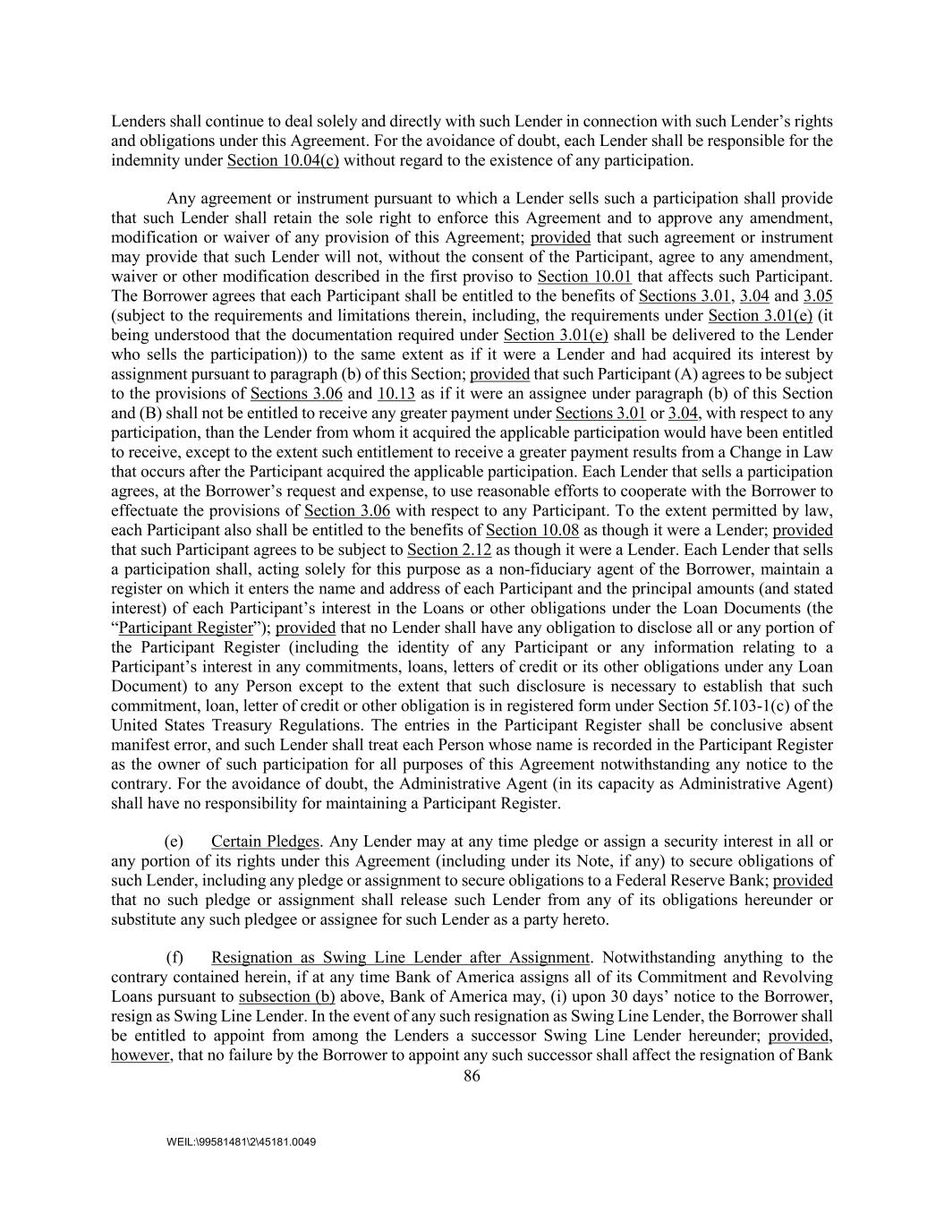 101 WEIL:\99581369\2\44393.0003 and Assumption, have the rights and obligations of a Lender under this Agreement, and the assigning Lender thereunder shall, to the extent of the interest assigned by such Assignment and Assumption, be released from its obligations under this Agreement (and, in the case of an Assignment and Assumption covering all of the assigning Lender’s rights and obligations under this Agreement, such Lender shall cease to be a party hereto) but shall continue to be entitled to the benefits of Sections 3.01, 3.04, 3.05, and 10.04 with respect to facts and circumstances occurring prior to the effective date of such assignment; provided, that except to the extent otherwise expressly agreed by the affected parties, no assignment by a Defaulting Lender will constitute a waiver or release of any claim of any party hereunder arising from that Lender’s having been a Defaulting Lender. Upon request, the Borrower shall execute and deliver a Note to the assignee Lender. Any assignment or transfer by a Lender of rights or obligations under this Agreement that does not comply with this subsection shall be treated for purposes of this Agreement as a sale by such Lender of a participation in such rights and obligations in accordance with subsection (d) of this Section. (c) Register. The Administrative Agent, acting solely for this purpose as an agent of the Borrower (and such agency being solely for tax purposes), shall maintain at the Administrative Agent’s Office a copy of each Assignment and Assumption delivered to it (or the equivalent thereof in electronic form) and a register for the recordation of the names and addresses of the Lenders, and the Commitments of, and principal amounts (and stated interest) of the Loans owing to, each Lender pursuant to the terms hereof from time to time (the “Register”). The entries in the Register shall be conclusive absent manifest error, and the Borrower, the Administrative Agent and the Lenders shall treat each Person whose name is recorded in the Register pursuant to the terms hereof as a Lender hereunder for all purposes of this Agreement. The Register shall be available for inspection by the Borrower and any Lender, at any reasonable time and from time to time upon reasonable prior notice. (d) Participations. Any Lender may at any time, without the consent of, or notice to, the Borrower, the Administrative Agent, any L/C Issuer or any Swing Line Lender, sell participations to any Person (other than a natural Person, or a holding company, investment vehicle or trust for, or owned and operated for the primary benefit of one or more natural Persons, a Defaulting Lender or the Borrower or any of the Borrower’s Affiliates or Subsidiaries) (each, a “Participant”) in all or a portion of such Lender’s rights and/or obligations under this Agreement (including all or a portion of its Commitment and/or the Loans (including such Lender’s participations in Swing Line Loans and Letters of Credit) owing to it); provided that (i) such Lender’s obligations under this Agreement shall remain unchanged, (ii) such Lender shall remain solely responsible to the other parties hereto for the performance of such obligations and (iii) the Borrower, the Administrative Agent and the Lenders shall continue to deal solely and directly with such Lender in connection with such Lender’s rights and obligations under this Agreement. For the avoidance of doubt, each Lender shall be responsible for the indemnity under Section 10.04(c) without regard to the existence of any participation. Any agreement or instrument pursuant to which a Lender sells such a participation shall provide that such Lender shall retain the sole right to enforce this Agreement and to approve any amendment, modification or waiver of any provision of this Agreement; provided that such agreement or instrument may provide that such Lender will not, without the consent of the Participant, agree to any amendment, waiver or other modification described in the first proviso to Section 10.01 that affects such Participant. The Borrower agrees that each Participant shall be entitled to the benefits of Sections 3.01, 3.04 and 3.05 (subject to the requirements and limitations therein, including, the requirements under Section 3.01(e) (it being understood that the documentation required under Section 3.01(e) shall be delivered to the Lender who sells the participation)) to the same extent as if it were a Lender and had acquired its interest by assignment pursuant to paragraph (b) of this Section; provided that such Participant (A) agrees to be subject to the provisions of Sections 3.06 and 10.13 as if it were an assignee under paragraph (b) of this Section