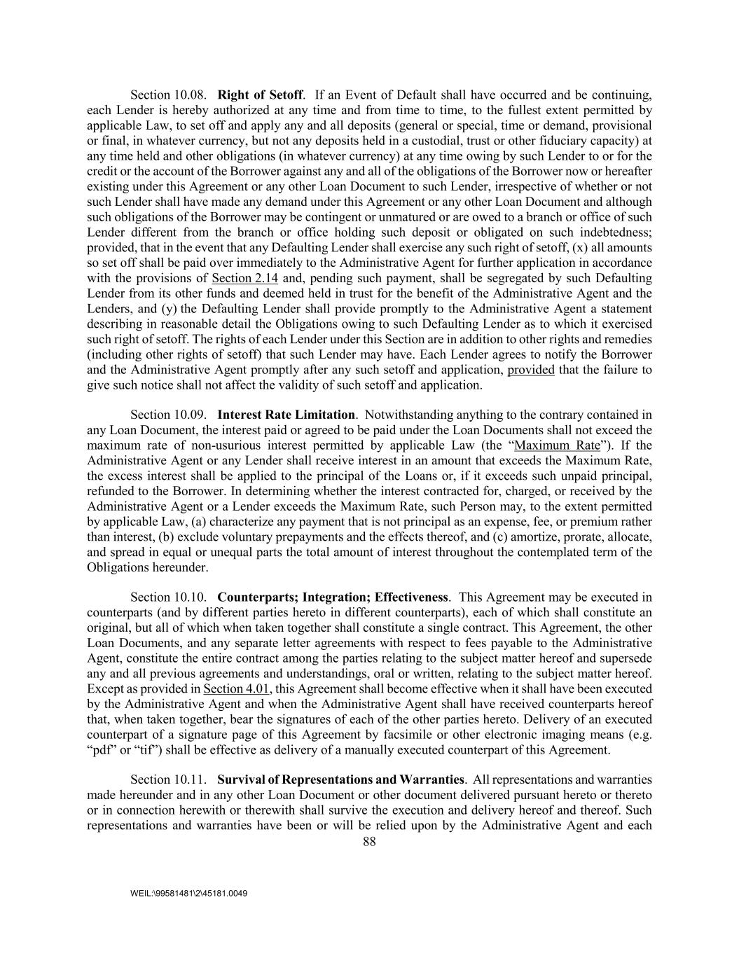 104 WEIL:\99581369\2\44393.0003 with the provisions of Section 2.14 and, pending such payment, shall be segregated by such Defaulting Lender from its other funds and deemed held in trust for the benefit of the Administrative Agent and the Lenders, and (y) the Defaulting Lender shall provide promptly to the Administrative Agent a statement describing in reasonable detail the Obligations owing to such Defaulting Lender as to which it exercised such right of setoff. The rights of each Lender under this Section are in addition to other rights and remedies (including other rights of setoff) that such Lender may have. Each Lender agrees to notify the Borrower and the Administrative Agent promptly after any such setoff and application, provided that the failure to give such notice shall not affect the validity of such setoff and application. Section 10.09. Interest Rate Limitation. Notwithstanding anything to the contrary contained in any Loan Document, the interest paid or agreed to be paid under the Loan Documents shall not exceed the maximum rate of non-usurious interest permitted by applicable Law (the “Maximum Rate”). If the Administrative Agent or any Lender shall receive interest in an amount that exceeds the Maximum Rate, the excess interest shall be applied to the principal of the Loans or, if it exceeds such unpaid principal, refunded to the Borrower. In determining whether the interest contracted for, charged, or received by the Administrative Agent or a Lender exceeds the Maximum Rate, such Person may, to the extent permitted by applicable Law, (a) characterize any payment that is not principal as an expense, fee, or premium rather than interest, (b) exclude voluntary prepayments and the effects thereof, and (c) amortize, prorate, allocate, and spread in equal or unequal parts the total amount of interest throughout the contemplated term of the Obligations hereunder. Section 10.10. Counterparts; Integration; Effectiveness. This Agreement may be executed in counterparts (and by different parties hereto in different counterparts), each of which shall constitute an original, but all of which when taken together shall constitute a single contract. This Agreement, the other Loan Documents, and any separate letter agreements with respect to fees payable to the Administrative Agent, constitute the entire contract among the parties relating to the subject matter hereof and supersede any and all previous agreements and understandings, oral or written, relating to the subject matter hereof. Except as provided in Section 4.01, this Agreement shall become effective when it shall have been executed by the Administrative Agent and when the Administrative Agent shall have received counterparts hereof that, when taken together, bear the signatures of each of the other parties hereto. Delivery of an executed counterpart of a signature page of this Agreement by facsimile or other electronic imaging means (e.g. “pdf” or “tif”) shall be effective as delivery of a manually executed counterpart of this Agreement. Section 10.11. Survival of Representations and Warranties. All representations and warranties made hereunder and in any other Loan Document or other document delivered pursuant hereto or thereto or in connection herewith or therewith shall survive the execution and delivery hereof and thereof. Such representations and warranties have been or will be relied upon by the Administrative Agent and each Lender, regardless of any investigation made by the Administrative Agent or any Lender or on their behalf and notwithstanding that the Administrative Agent or any Lender may have had notice or knowledge of any Default at the time of any Credit Extension, and shall continue in full force and effect until the Termination Date. Section 10.12. Severability. If any provision of this Agreement or the other Loan Documents is held to be illegal, invalid or unenforceable, (a) the legality, validity and enforceability of the remaining provisions of this Agreement and the other Loan Documents shall not be affected or impaired thereby and (b) the parties shall endeavor in good faith negotiations to replace the illegal, invalid or unenforceable provisions with valid provisions the economic effect of which comes as close as possible to that of the illegal, invalid or unenforceable provisions. The invalidity of a provision in a particular jurisdiction shall not invalidate or render unenforceable such provision in any other jurisdiction. Without limiting the