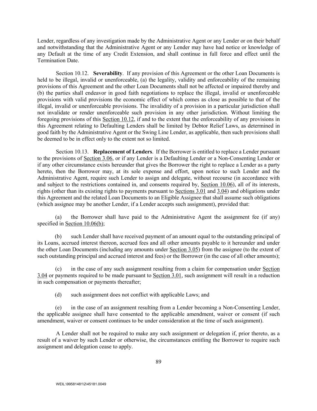 105 WEIL:\99581369\2\44393.0003 foregoing provisions of this Section 10.12, if and to the extent that the enforceability of any provisions in this Agreement relating to Defaulting Lenders shall be limited by Debtor Relief Laws, as determined in good faith by the Administrative Agent or the Swing Line Lender, as applicable, then such provisions shall be deemed to be in effect only to the extent not so limited. Section 10.13. Replacement of Lenders. If the Borrower is entitled to replace a Lender pursuant to the provisions of Section 3.06, or if any Lender is a Defaulting Lender or a Non-Consenting Lender or if any other circumstance exists hereunder that gives the Borrower the right to replace a Lender as a party hereto, then the Borrower may, at its sole expense and effort, upon notice to such Lender and the Administrative Agent, require such Lender to assign and delegate, without recourse (in accordance with and subject to the restrictions contained in, and consents required by, Section 10.06), all of its interests, rights (other than its existing rights to payments pursuant to Sections 3.01 and 3.04) and obligations under this Agreement and the related Loan Documents to an Eligible Assignee that shall assume such obligations (which assignee may be another Lender, if a Lender accepts such assignment), provided that: (a) the Borrower shall have paid to the Administrative Agent the assignment fee (if any) specified in Section 10.06(b); (b) such Lender shall have received payment of an amount equal to the outstanding principal of its Loans, accrued interest thereon, accrued fees and all other amounts payable to it hereunder and under the other Loan Documents (including any amounts under Section 3.05) from the assignee (to the extent of such outstanding principal and accrued interest and fees) or the Borrower (in the case of all other amounts); (c) in the case of any such assignment resulting from a claim for compensation under Section 3.04 or payments required to be made pursuant to Section 3.01, such assignment will result in a reduction in such compensation or payments thereafter; (d) such assignment does not conflict with applicable Laws; and (e) in the case of an assignment resulting from a Lender becoming a Non-Consenting Lender, the applicable assignee shall have consented to the applicable amendment, waiver or consent (if such amendment, waiver or consent continues to be under consideration at the time of such assignment). A Lender shall not be required to make any such assignment or delegation if, prior thereto, as a result of a waiver by such Lender or otherwise, the circumstances entitling the Borrower to require such assignment and delegation cease to apply. Each party hereto agrees that (a) an assignment required pursuant to this Section 10.13 may be effected pursuant to an Assignment and Assumption executed by the Borrower, the Administrative Agent and the assignee and (b) the Lender required to make such assignment need not be a party thereto in order for such assignment to be effective and shall be deemed to have consented to and be bound by the terms thereof; provided that, following the effectiveness of any such assignment, the other parties to such assignment agree to execute and deliver such documents necessary to evidence such assignment as reasonably requested by the applicable Lender, provided, further that any such documents shall be without recourse to or warranty by the parties thereto.