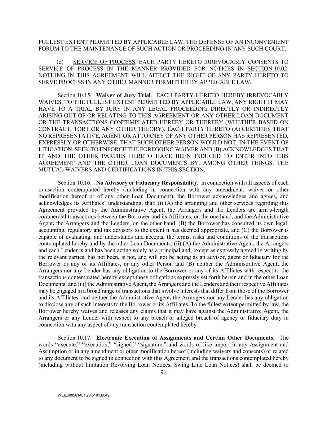 107 WEIL:\99581369\2\44393.0003 Section 10.15. Waiver of Jury Trial. EACH PARTY HERETO HEREBY IRREVOCABLY WAIVES, TO THE FULLEST EXTENT PERMITTED BY APPLICABLE LAW, ANY RIGHT IT MAY HAVE TO A TRIAL BY JURY IN ANY LEGAL PROCEEDING DIRECTLY OR INDIRECTLY ARISING OUT OF OR RELATING TO THIS AGREEMENT OR ANY OTHER LOAN DOCUMENT OR THE TRANSACTIONS CONTEMPLATED HEREBY OR THEREBY (WHETHER BASED ON CONTRACT, TORT OR ANY OTHER THEORY). EACH PARTY HERETO (A) CERTIFIES THAT NO REPRESENTATIVE, AGENT OR ATTORNEY OF ANY OTHER PERSON HAS REPRESENTED, EXPRESSLY OR OTHERWISE, THAT SUCH OTHER PERSON WOULD NOT, IN THE EVENT OF LITIGATION, SEEK TO ENFORCE THE FOREGOING WAIVER AND (B) ACKNOWLEDGES THAT IT AND THE OTHER PARTIES HERETO HAVE BEEN INDUCED TO ENTER INTO THIS AGREEMENT AND THE OTHER LOAN DOCUMENTS BY, AMONG OTHER THINGS, THE MUTUAL WAIVERS AND CERTIFICATIONS IN THIS SECTION. Section 10.16. No Advisory or Fiduciary Responsibility. In connection with all aspects of each transaction contemplated hereby (including in connection with any amendment, waiver or other modification hereof or of any other Loan Document), the Borrower acknowledges and agrees, and acknowledges its Affiliates’ understanding, that: (i) (A) the arranging and other services regarding this Agreement provided by the Administrative Agent, the Arrangers and the Lenders are arm’s-length commercial transactions between the Borrower and its Affiliates, on the one hand, and the Administrative Agent, the Arrangers and the Lenders, on the other hand, (B) the Borrower has consulted its own legal, accounting, regulatory and tax advisors to the extent it has deemed appropriate, and (C) the Borrower is capable of evaluating, and understands and accepts, the terms, risks and conditions of the transactions contemplated hereby and by the other Loan Documents; (ii) (A) the Administrative Agent, the Arrangers, each L/C Issuer and each Lender is and has been acting solely as a principal and, except as expressly agreed in writing by the relevant parties, has not been, is not, and will not be acting as an advisor, agent or fiduciary for the Borrower or any of its Affiliates, or any other Person and (B) neither the Administrative Agent, the Arrangers, any L/C Issuer nor any Lender has any obligation to the Borrower or any of its Affiliates with respect to the transactions contemplated hereby except those obligations expressly set forth herein and in the other Loan Documents; and (iii) the Administrative Agent, the Arrangers, the L/C Issuers and the Lenders and their respective Affiliates may be engaged in a broad range of transactions that involve interests that differ from those of the Borrower and its Affiliates, and neither the Administrative Agent, the Arrangers nor any Lender has any obligation to disclose any of such interests to the Borrower or its Affiliates. To the fullest extent permitted by law, the Borrower hereby waives and releases any claims that it may have against the Administrative Agent, the Arrangers, the L/C Issuers or any Lender with respect to any breach or alleged breach of agency or fiduciary duty in connection with any aspect of any transaction contemplated hereby. Section 10.17. Electronic Execution of Assignments and Certain Other Documents. The words “execute,” “execution,” “signed,” “signature,” and words of like import in any Assignment and Assumption or in any amendment or other modification hereof (including waivers and consents) or related to any document to be signed in connection with this Agreement and the transactions contemplated hereby (including without limitation Revolving Loan Notices, Swing Line Loan Notices) shall be deemed to include electronic signatures, the electronic matching of assignment terms and contract formations on electronic platforms approved by the Administrative Agent, or the keeping of records in electronic form, each of which shall be of the same legal effect, validity or enforceability as a manually executed signature or the use of a paper-based recordkeeping system, as the case may be, to the extent and as provided for in any applicable law, including the Federal Electronic Signatures in Global and National Commerce Act, the New York State Electronic Signatures and Records Act, or any other similar state laws based on the Uniform Electronic Transactions Act.