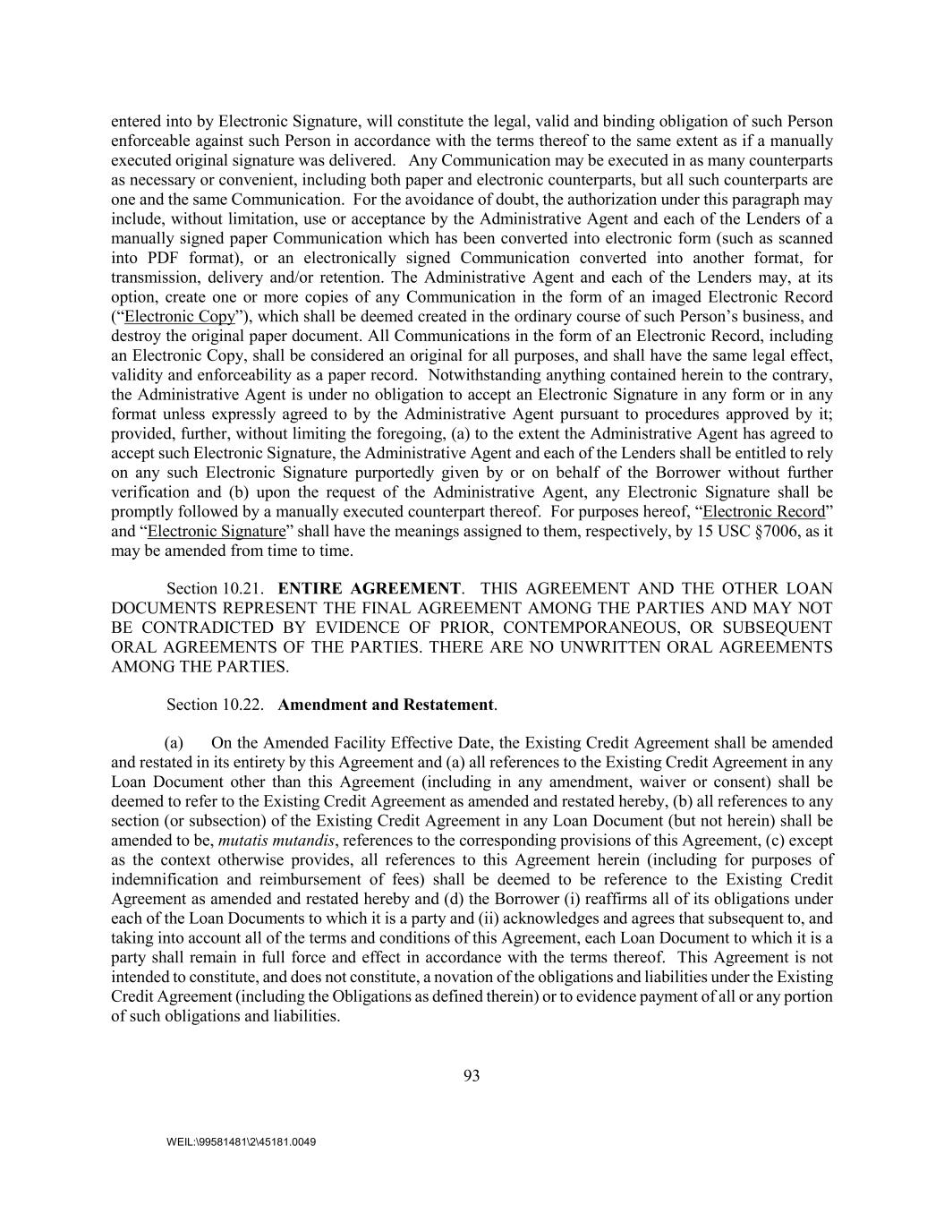 109 WEIL:\99581369\2\44393.0003 into PDF format), or an electronically signed Communication converted into another format, for transmission, delivery and/or retention. The Administrative Agent and each of the Lenders may, at its option, create one or more copies of any Communication in the form of an imaged Electronic Record (“Electronic Copy”), which shall be deemed created in the ordinary course of such Person’s business, and destroy the original paper document. All Communications in the form of an Electronic Record, including an Electronic Copy, shall be considered an original for all purposes, and shall have the same legal effect, validity and enforceability as a paper record. Notwithstanding anything contained herein to the contrary, the Administrative Agent is under no obligation to accept an Electronic Signature in any form or in any format unless expressly agreed to by the Administrative Agent pursuant to procedures approved by it; provided, further, without limiting the foregoing, (a) to the extent the Administrative Agent has agreed to accept such Electronic Signature, the Administrative Agent and each of the Lenders shall be entitled to rely on any such Electronic Signature purportedly given by or on behalf of the Borrower without further verification and (b) upon the request of the Administrative Agent, any Electronic Signature shall be promptly followed by a manually executed counterpart thereof. For purposes hereof, “Electronic Record” and “Electronic Signature” shall have the meanings assigned to them, respectively, by 15 USC §7006, as it may be amended from time to time. Section 10.21. ENTIRE AGREEMENT. THIS AGREEMENT AND THE OTHER LOAN DOCUMENTS REPRESENT THE FINAL AGREEMENT AMONG THE PARTIES AND MAY NOT BE CONTRADICTED BY EVIDENCE OF PRIOR, CONTEMPORANEOUS, OR SUBSEQUENT ORAL AGREEMENTS OF THE PARTIES. THERE ARE NO UNWRITTEN ORAL AGREEMENTS AMONG THE PARTIES. Section 10.22. Recovery of Erroneous Payments. (a) Without limitation of any other provision in this Agreement, if at any time the Administrative Agent makes a payment hereunder in error to any Lender Recipient Party, whether or not in respect of an Obligation due and owing by the Borrower at such time, where such payment is a Rescindable Amount, then in any such event, each Lender Recipient Party receiving a Rescindable Amount severally agrees to repay to the Administrative Agent forthwith on demand the Rescindable Amount received by such Lender Recipient Party in immediately available funds in the currency so received, with interest thereon, for each day from and including the date such Rescindable Amount is received by it to but excluding the date of payment to the Administrative Agent, at the greater of the Federal Funds Rate and a rate determined by the Administrative Agent in accordance with banking industry rules on interbank compensation. Each Lender Recipient Party irrevocably waives any and all defenses, including any “discharge for value” (under which a creditor might otherwise claim a right to retain funds mistakenly paid by a third party in respect of a debt owed by another) or similar defense to its obligation to return any Rescindable Amount. The Administrative Agent shall inform each Lender Recipient Party promptly upon determining that any payment made to such Lender Recipient Party comprised, in whole or in part, a Rescindable Amount. (b) The provisions of this Section 10.22 are solely agreements among the Lender Recipient Parties and the Administrative Agent and shall not impose or increase any obligations on the Borrower and the Loan Parties. Section 10.23. Amendment and Restatement. (a) On the Effective Date, the Existing Credit Agreement shall be amended and restated in its entirety by this Agreement and (a) all references to the Existing Credit Agreement in any Loan Document other than this Agreement (including in any amendment, waiver or consent) shall be deemed to refer to the