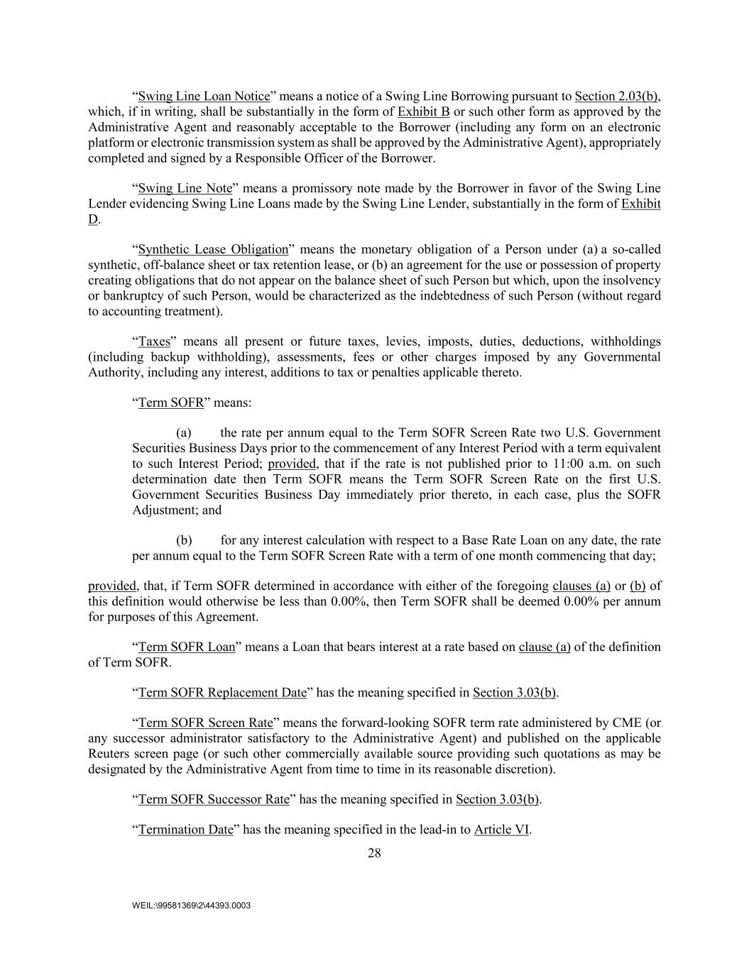 28 WEIL:\99581369\2\44393.0003 “Swing Line Loan Notice” means a notice of a Swing Line Borrowing pursuant to Section 2.03(b), which, if in writing, shall be substantially in the form of Exhibit B or such other form as approved by the Administrative Agent and reasonably acceptable to the Borrower (including any form on an electronic platform or electronic transmission system as shall be approved by the Administrative Agent), appropriately completed and signed by a Responsible Officer of the Borrower. “Swing Line Note” means a promissory note made by the Borrower in favor of the Swing Line Lender evidencing Swing Line Loans made by the Swing Line Lender, substantially in the form of Exhibit D. “Synthetic Lease Obligation” means the monetary obligation of a Person under (a) a so-called synthetic, off-balance sheet or tax retention lease, or (b) an agreement for the use or possession of property creating obligations that do not appear on the balance sheet of such Person but which, upon the insolvency or bankruptcy of such Person, would be characterized as the indebtedness of such Person (without regard to accounting treatment). “Taxes” means all present or future taxes, levies, imposts, duties, deductions, withholdings (including backup withholding), assessments, fees or other charges imposed by any Governmental Authority, including any interest, additions to tax or penalties applicable thereto. “Term SOFR” means: (a) the rate per annum equal to the Term SOFR Screen Rate two U.S. Government Securities Business Days prior to the commencement of any Interest Period with a term equivalent to such Interest Period; provided, that if the rate is not published prior to 11:00 a.m. on such determination date then Term SOFR means the Term SOFR Screen Rate on the first U.S. Government Securities Business Day immediately prior thereto, in each case, plus the SOFR Adjustment; and (b) for any interest calculation with respect to a Base Rate Loan on any date, the rate per annum equal to the Term SOFR Screen Rate with a term of one month commencing that day; provided, that, if Term SOFR determined in accordance with either of the foregoing clauses (a) or (b) of this definition would otherwise be less than 0.00%, then Term SOFR shall be deemed 0.00% per annum for purposes of this Agreement. “Term SOFR Loan” means a Loan that bears interest at a rate based on clause (a) of the definition of Term SOFR. “Term SOFR Replacement Date” has the meaning specified in Section 3.03(b). “Term SOFR Screen Rate” means the forward-looking SOFR term rate administered by CME (or any successor administrator satisfactory to the Administrative Agent) and published on the applicable Reuters screen page (or such other commercially available source providing such quotations as may be designated by the Administrative Agent from time to time in its reasonable discretion). “Term SOFR Successor Rate” has the meaning specified in Section 3.03(b). “Termination Date” has the meaning specified in the lead-in to Article VI.