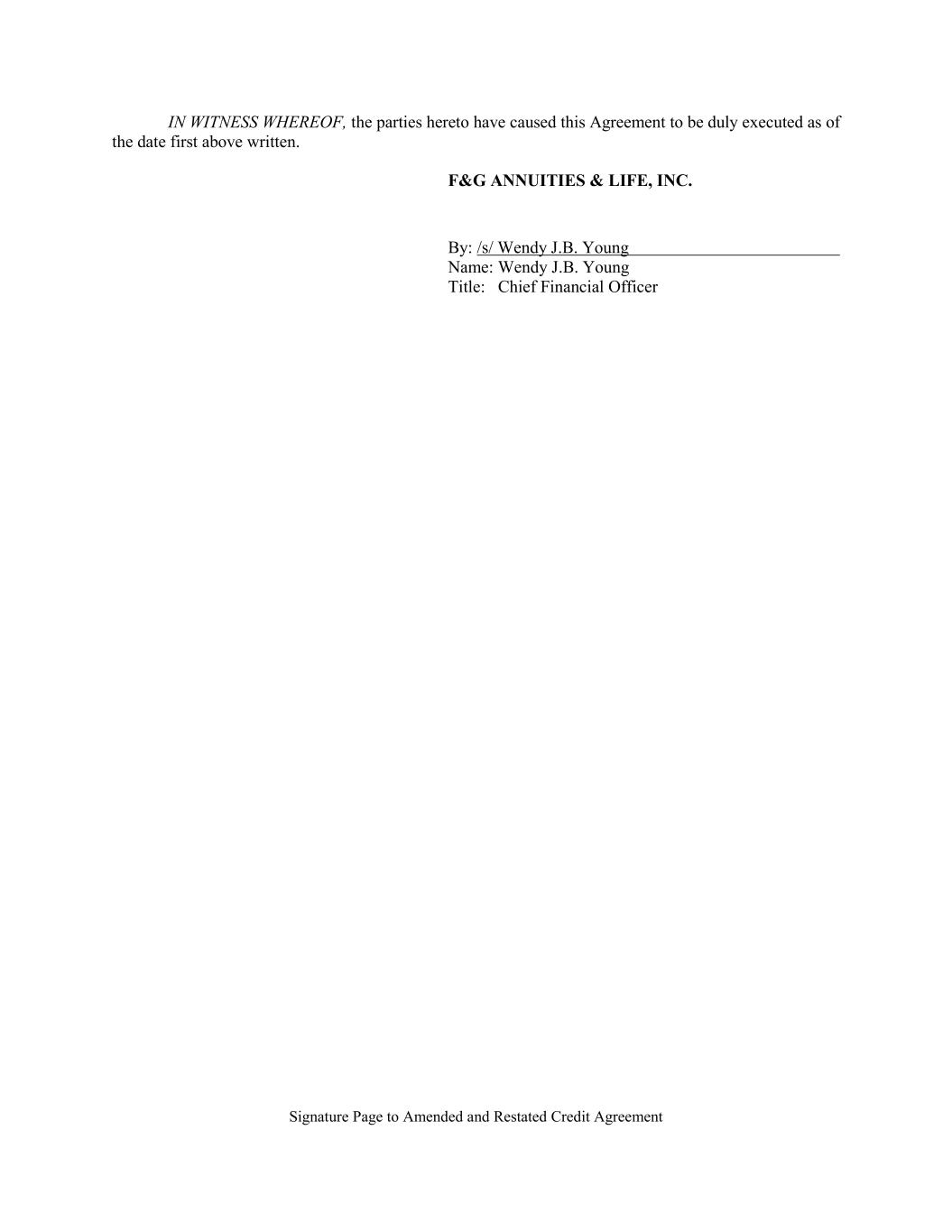 Signature Page to Amended and Restated Credit Agreement IN WITNESS WHEREOF, the parties hereto have caused this Agreement to be duly executed as of the date first above written. F&G ANNUITIES & LIFE, INC. By: /s/ Wendy J.B. Young Name: Wendy J.B. Young Title: Chief Financial Officer
