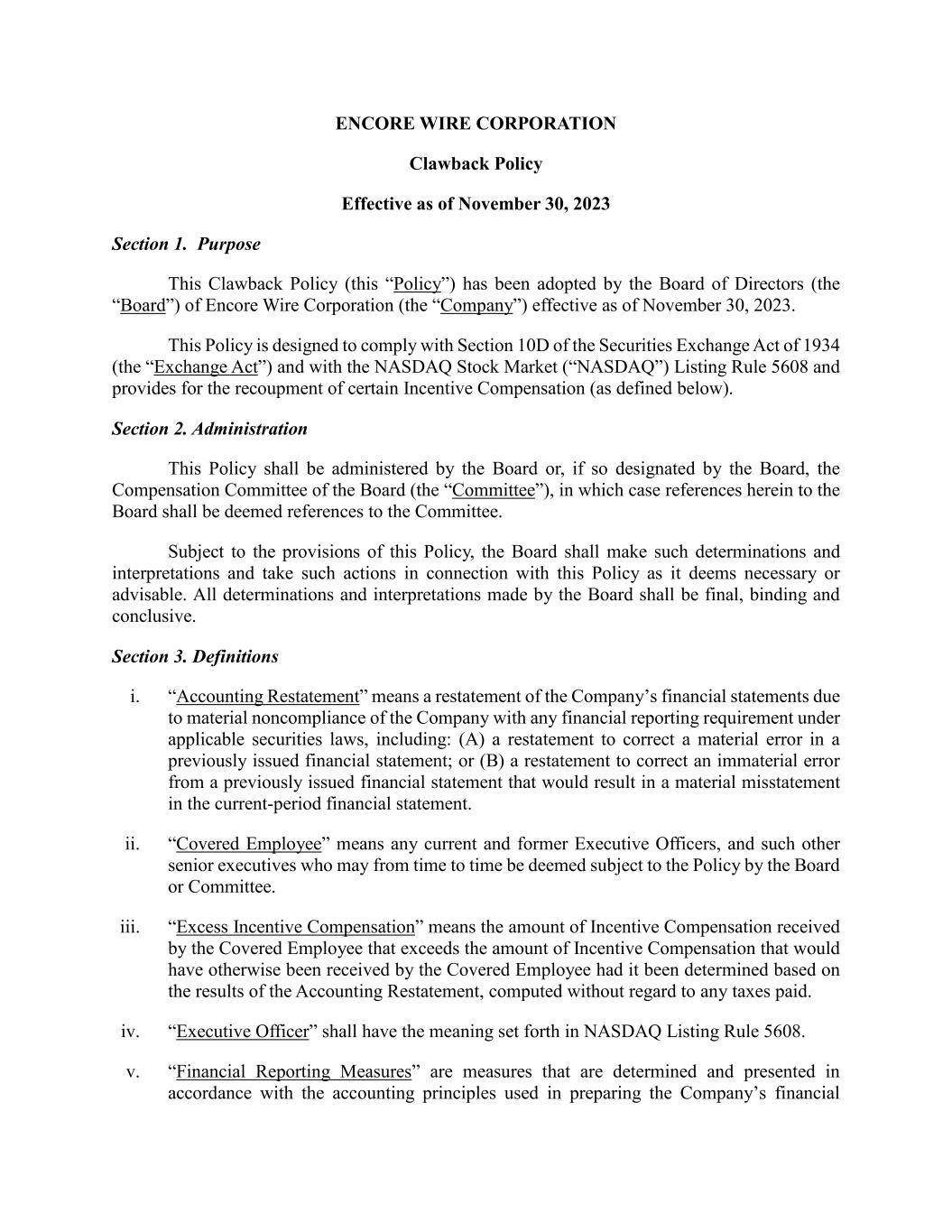 ENCORE WIRE CORPORATION Clawback Policy Effective as of November 30, 2023 Section 1. Purpose This Clawback Policy (this “Policy”) has been adopted by the Board of Directors (the “Board”) of Encore Wire Corporation (the “Company”) effective as of November 30, 2023. This Policy is designed to comply with Section 10D of the Securities Exchange Act of 1934 (the “Exchange Act”) and with the NASDAQ Stock Market (“NASDAQ”) Listing Rule 5608 and provides for the recoupment of certain Incentive Compensation (as defined below). Section 2. Administration This Policy shall be administered by the Board or, if so designated by the Board, the Compensation Committee of the Board (the “Committee”), in which case references herein to the Board shall be deemed references to the Committee. Subject to the provisions of this Policy, the Board shall make such determinations and interpretations and take such actions in connection with this Policy as it deems necessary or advisable. All determinations and interpretations made by the Board shall be final, binding and conclusive. Section 3. Definitions i. “Accounting Restatement” means a restatement of the Company’s financial statements due to material noncompliance of the Company with any financial reporting requirement under applicable securities laws, including: (A) a restatement to correct a material error in a previously issued financial statement; or (B) a restatement to correct an immaterial error from a previously issued financial statement that would result in a material misstatement in the current-period financial statement. ii. “Covered Employee” means any current and former Executive Officers, and such other senior executives who may from time to time be deemed subject to the Policy by the Board or Committee. iii. “Excess Incentive Compensation” means the amount of Incentive Compensation received by the Covered Employee that exceeds the amount of Incentive Compensation that would have otherwise been received by the Covered Employee had it been determined based on the results of the Accounting Restatement, computed without regard to any taxes paid. iv. “Executive Officer” shall have the meaning set forth in NASDAQ Listing Rule 5608. v. “Financial Reporting Measures” are measures that are determined and presented in accordance with the accounting principles used in preparing the Company’s financial