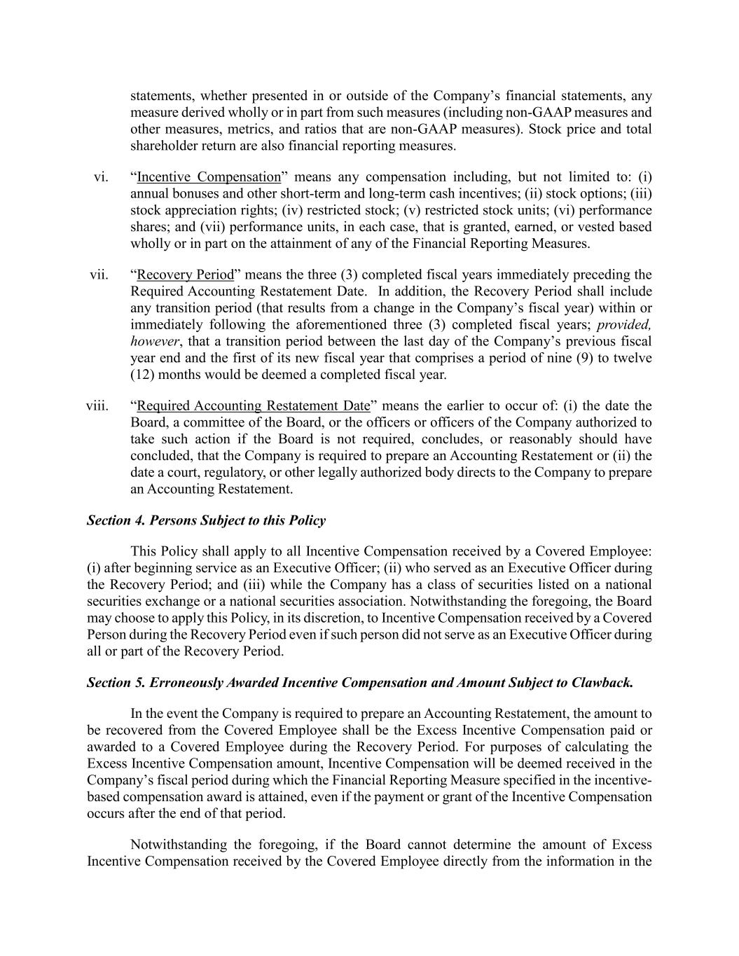 statements, whether presented in or outside of the Company’s financial statements, any measure derived wholly or in part from such measures (including non-GAAP measures and other measures, metrics, and ratios that are non-GAAP measures). Stock price and total shareholder return are also financial reporting measures. vi. “Incentive Compensation” means any compensation including, but not limited to: (i) annual bonuses and other short-term and long-term cash incentives; (ii) stock options; (iii) stock appreciation rights; (iv) restricted stock; (v) restricted stock units; (vi) performance shares; and (vii) performance units, in each case, that is granted, earned, or vested based wholly or in part on the attainment of any of the Financial Reporting Measures. vii. “Recovery Period” means the three (3) completed fiscal years immediately preceding the Required Accounting Restatement Date. In addition, the Recovery Period shall include any transition period (that results from a change in the Company’s fiscal year) within or immediately following the aforementioned three (3) completed fiscal years; provided, however, that a transition period between the last day of the Company’s previous fiscal year end and the first of its new fiscal year that comprises a period of nine (9) to twelve (12) months would be deemed a completed fiscal year. viii. “Required Accounting Restatement Date” means the earlier to occur of: (i) the date the Board, a committee of the Board, or the officers or officers of the Company authorized to take such action if the Board is not required, concludes, or reasonably should have concluded, that the Company is required to prepare an Accounting Restatement or (ii) the date a court, regulatory, or other legally authorized body directs to the Company to prepare an Accounting Restatement. Section 4. Persons Subject to this Policy This Policy shall apply to all Incentive Compensation received by a Covered Employee: (i) after beginning service as an Executive Officer; (ii) who served as an Executive Officer during the Recovery Period; and (iii) while the Company has a class of securities listed on a national securities exchange or a national securities association. Notwithstanding the foregoing, the Board may choose to apply this Policy, in its discretion, to Incentive Compensation received by a Covered Person during the Recovery Period even if such person did not serve as an Executive Officer during all or part of the Recovery Period. Section 5. Erroneously Awarded Incentive Compensation and Amount Subject to Clawback. In the event the Company is required to prepare an Accounting Restatement, the amount to be recovered from the Covered Employee shall be the Excess Incentive Compensation paid or awarded to a Covered Employee during the Recovery Period. For purposes of calculating the Excess Incentive Compensation amount, Incentive Compensation will be deemed received in the Company’s fiscal period during which the Financial Reporting Measure specified in the incentive- based compensation award is attained, even if the payment or grant of the Incentive Compensation occurs after the end of that period. Notwithstanding the foregoing, if the Board cannot determine the amount of Excess Incentive Compensation received by the Covered Employee directly from the information in the