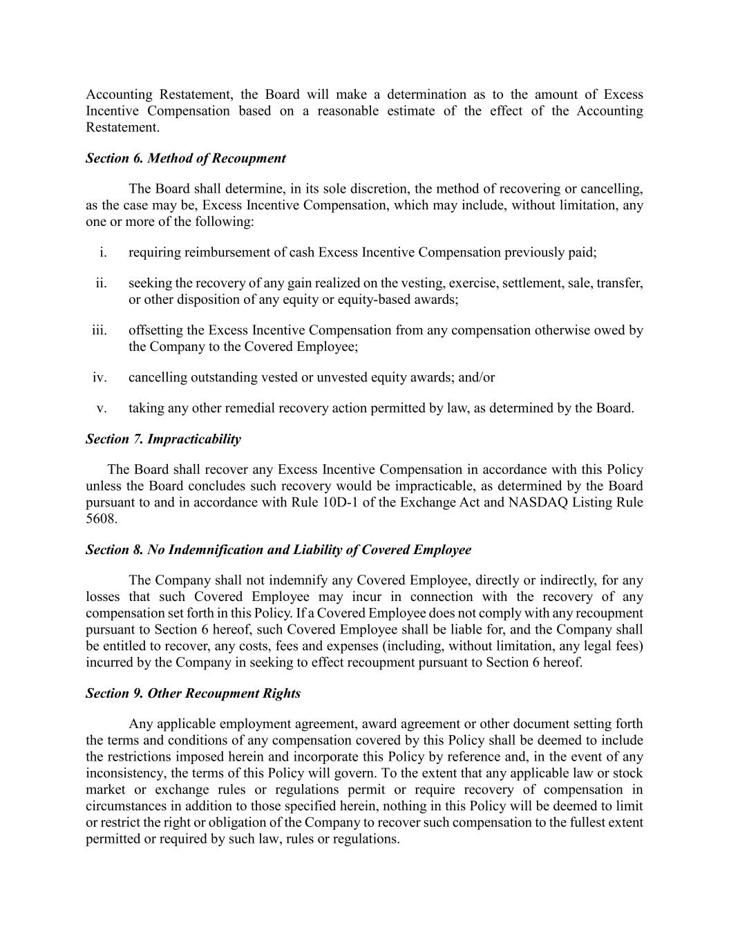 Accounting Restatement, the Board will make a determination as to the amount of Excess Incentive Compensation based on a reasonable estimate of the effect of the Accounting Restatement. Section 6. Method of Recoupment The Board shall determine, in its sole discretion, the method of recovering or cancelling, as the case may be, Excess Incentive Compensation, which may include, without limitation, any one or more of the following: i. requiring reimbursement of cash Excess Incentive Compensation previously paid; ii. seeking the recovery of any gain realized on the vesting, exercise, settlement, sale, transfer, or other disposition of any equity or equity-based awards; iii. offsetting the Excess Incentive Compensation from any compensation otherwise owed by the Company to the Covered Employee; iv. cancelling outstanding vested or unvested equity awards; and/or v. taking any other remedial recovery action permitted by law, as determined by the Board. Section 7. Impracticability The Board shall recover any Excess Incentive Compensation in accordance with this Policy unless the Board concludes such recovery would be impracticable, as determined by the Board pursuant to and in accordance with Rule 10D-1 of the Exchange Act and NASDAQ Listing Rule 5608. Section 8. No Indemnification and Liability of Covered Employee The Company shall not indemnify any Covered Employee, directly or indirectly, for any losses that such Covered Employee may incur in connection with the recovery of any compensation set forth in this Policy. If a Covered Employee does not comply with any recoupment pursuant to Section 6 hereof, such Covered Employee shall be liable for, and the Company shall be entitled to recover, any costs, fees and expenses (including, without limitation, any legal fees) incurred by the Company in seeking to effect recoupment pursuant to Section 6 hereof. Section 9. Other Recoupment Rights Any applicable employment agreement, award agreement or other document setting forth the terms and conditions of any compensation covered by this Policy shall be deemed to include the restrictions imposed herein and incorporate this Policy by reference and, in the event of any inconsistency, the terms of this Policy will govern. To the extent that any applicable law or stock market or exchange rules or regulations permit or require recovery of compensation in circumstances in addition to those specified herein, nothing in this Policy will be deemed to limit or restrict the right or obligation of the Company to recover such compensation to the fullest extent permitted or required by such law, rules or regulations.