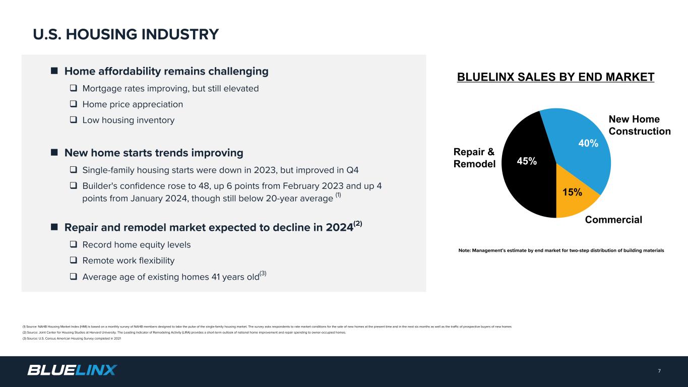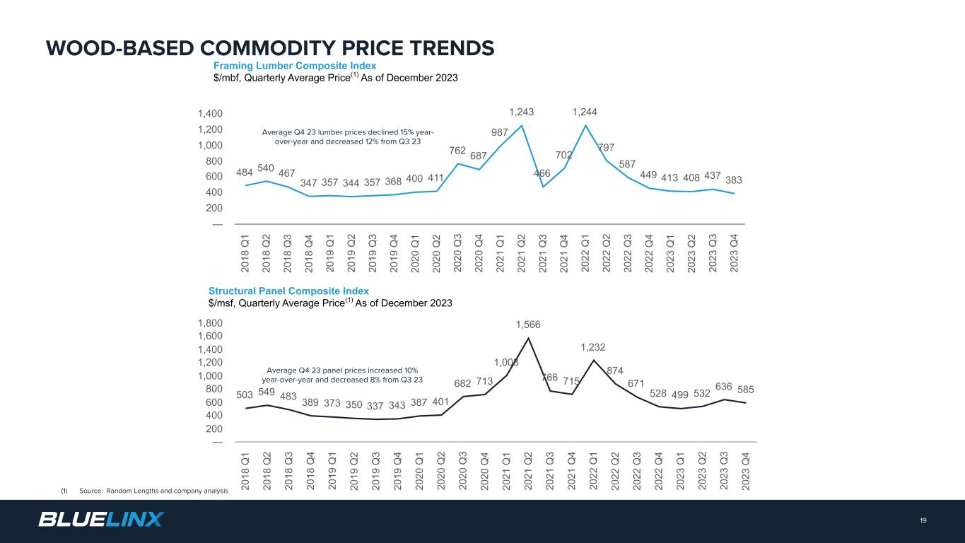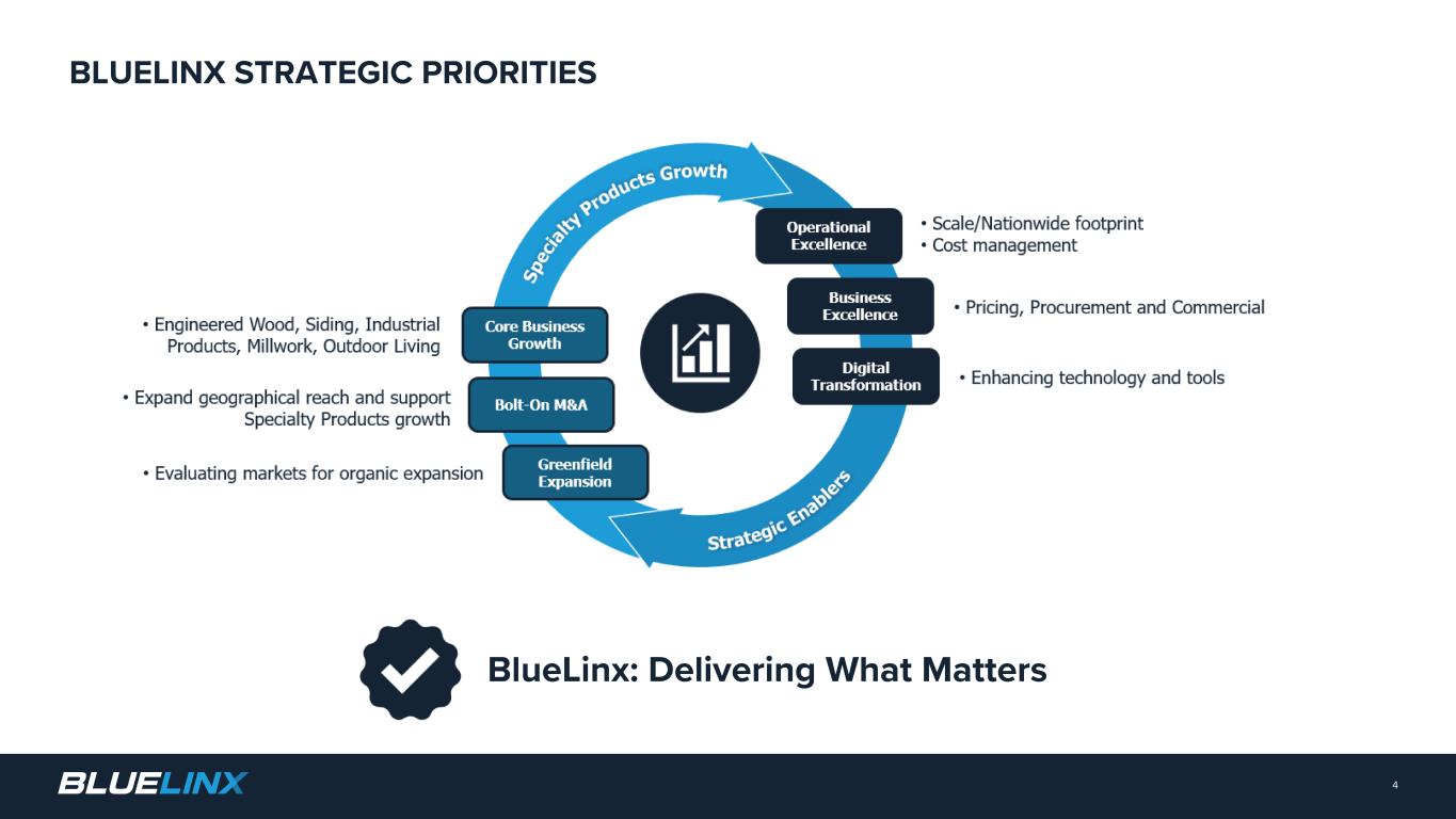 This presentation contains forward-looking statements. Forward-looking statements include, without limitation, any statement that predicts, forecasts, indicates or implies future results, performance, liquidity levels or achievements, and may contain the words “believe,” “anticipate,” “could”, “expect,” “estimate,” “intend,” “may”, “project,” “plan,” “should”, “will”, “will be,” “will likely continue,” “will likely result”, “would” or words or phrases of similar meaning. The forward-looking statements in this presentation include statements about our confidence in the Company’s long-term growth strategy; our ability to capitalize on supplier-led price increases and our value-added services; our areas of focus and management initiatives; the demand outlook for construction materials and expectations regarding new home construction, repair and remodel activity and continued investment in existing and new homes; our positioning for long-term value creation; our efforts and ability to generate profitable growth; our ability to increase net sales in specialty product categories; our ability to generate profits and cash from sales of specialty products; our multi-year capital allocation plans; our ability to manage volatility in wood-based commodities; our improvement in execution and productivity; our efforts and ability to maintain a disciplined capital structure and capital allocation strategy; our ability to maintain a strong balance sheet; our ability to focus on operating improvement initiatives and commercial excellence; and whether or not the Company will continue any share repurchases. Forward-looking statements in this presentation are based on estimates and assumptions made by our management that, although believed by us to be reasonable, are inherently uncertain. Forward-looking statements involve risks and uncertainties that may cause our business, strategy, or actual results to differ materially from the forward-looking statements. These risks and uncertainties include those discussed in greater detail in our filings with the Securities and Exchange Commission. We operate in a changing environment in which new risks can emerge from time to time. It is not possible for management to predict all of these risks, nor can it assess the extent to which any factor, or a combination of factors, may cause our business, strategy, or actual results to differ materially from those contained in forward-looking statements. Factors that may cause these differences include, among other things: pricing and product cost variability; volumes of product sold; competition; changes in the supply and/or demand for products that we distribute; the cyclical nature of the industry in which we operate; housing market conditions; consolidation among competitors, suppliers, and customers; disintermediation risk; loss of products or key suppliers and manufacturers; our dependence on international suppliers and manufacturers for certain products; potential acquisitions and the integration and completion of such acquisitions; business disruptions; effective inventory management relative to our sales volume or the prices of the products we distribute; information technology security risks and business interruption risks; the ability to attract, train, and retain highly qualified associates and other key personnel while controlling related labor costs; exposure to product liability and other claims and legal proceedings related to our business and the products we distribute; natural disasters, catastrophes, fire, wars, or other unexpected events; the impacts of climate change; successful implementation of our strategy; wage increases or work stoppages by our union employees; costs imposed by federal, state, local, and other regulations; compliance costs associated with federal, state, and local environmental protection laws; the effects of epidemics, global pandemics or other widespread public health crises and governmental rules and regulations; fluctuations in our operating results; our level of indebtedness and our ability to incur additional debt to fund future needs; the covenants of the instruments governing our indebtedness limiting the discretion of our management in operating the business; the potential we may incur more debt; the fact that we have consummated certain sale leaseback transactions with resulting long-term non-cancelable leases, many of which are or will be finance leases; the fact that we lease many of our distribution centers, and we would still be obligated under these leases even if we close a leased distribution center; inability to raise funds necessary to finance a required repurchase of our senior secured notes; a lowering or withdrawal of debt ratings; changes in our product mix; increases in fuel and other energy prices or availability of third-part freight providers; changes in insurance-related deductible/retention reserves based on actual loss development experience; the possibility that the value of our deferred tax assets could become impaired; changes in our expected annual effective tax rate could be volatile; the costs and liabilities related to our participation in multi- employer pension plans could increase; the risk that our cash flows and capital resources may be insufficient to service our existing or future indebtedness; interest rate risk, which could cause our debt service obligations to increase; and changes in, or interpretation of, accounting principles. Given these risks and uncertainties, we caution you not to place undue reliance on forward-looking statements. We expressly disclaim any obligation to update or revise any forward-looking statement as a result of new information, future events or otherwise, except as required by law. Immaterial Rounding Differences. Immaterial rounding adjustments and differences may exist between slides, press releases, and previously issued presentations. This pres
