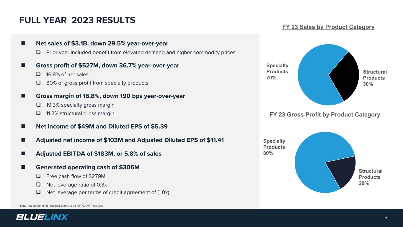 5 ▪ Net sales of $3.1B / down 29.5% year-over-year ▪ Adjusted EBITDA of $183M ▪ Operating Cash Flow of $306M, Free Cash Flow of $279M ▪ Q4 2023 Adjusted EBITDA of $36M ▪ Generated operating cash of $76M ▪ Specialty product sales comprised 70% of sales and 80% of gross profit in Q4 2023 ▪ Invested $28M in capital expenditures during the year ▪ Repurchased 6% of outstanding shares for $42M in 2023 ▪ Announced new $100M share repurchase program after prior authorization was completed ▪ 0.3x net leverage at the end of Q4 2023 ▪ Per terms of credit agreement(1) net leverage of (1.0x) ▪ $868M of liquidity – including $522M of cash/cash equivalents q Delivered strong full year 2022 results q Solid Q4 results highlighted by record cash generation q Remain focused on specialty product growth q Executed strategic capital allocation actions q Further strengthened our financial position DELIVERING WHAT MATTERS ü Delivered solid full year 2023 results given the challenging environment ü Solid Q4 results highlighted by strong cash generation ü Remain focused on specialty product sales growth ü Executed strategic capital allocation actions ü Further strengthened our financial position ü Note: see appendix for reconciliations to all non-GAAP measures (1) Does not include real property financing leases