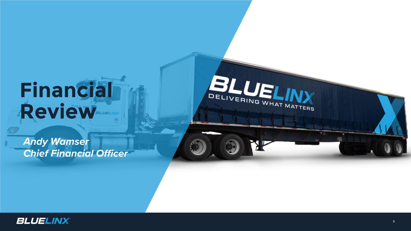 n Home affordability remains challenging q Mortgage rates improving, but still elevated q Home price appreciation q Low housing inventory n New home starts trends improving q Single-family housing starts were down in 2023, but improved in Q4 q Builder's confidence rose to 48, up 6 points from February 2023 and up 4 points from January 2024, though still below 20-year average (1) n Repair and remodel market expected to decline in 2024(2) q Record home equity levels q Remote work flexibility q Average age of existing homes 41 years old(3) Note: Management’s estimate by end market for two-step distribution of building materials (1) Source: NAHB Housing Market Index (HMI) is based on a monthly survey of NAHB members designed to take the pulse of the single-family housing market. The survey asks respondents to rate market conditions for the sale of new homes at the present time and in the next six months as well as the traffic of prospective buyers of new homes (2) Source: Joint Center for Housing Studies at Harvard University. The Leading Indicator of Remodeling Activity (LIRA) provides a short-term outlook of national home improvement and repair spending to owner-occupied homes. (3) Source: U.S. Census American Housing Survey completed in 2021 7 U.S. HOUSING INDUSTRY BLUELINX SALES BY END MARKET Repair & Remodel 45% New Home Construction 40% Commercial 15%