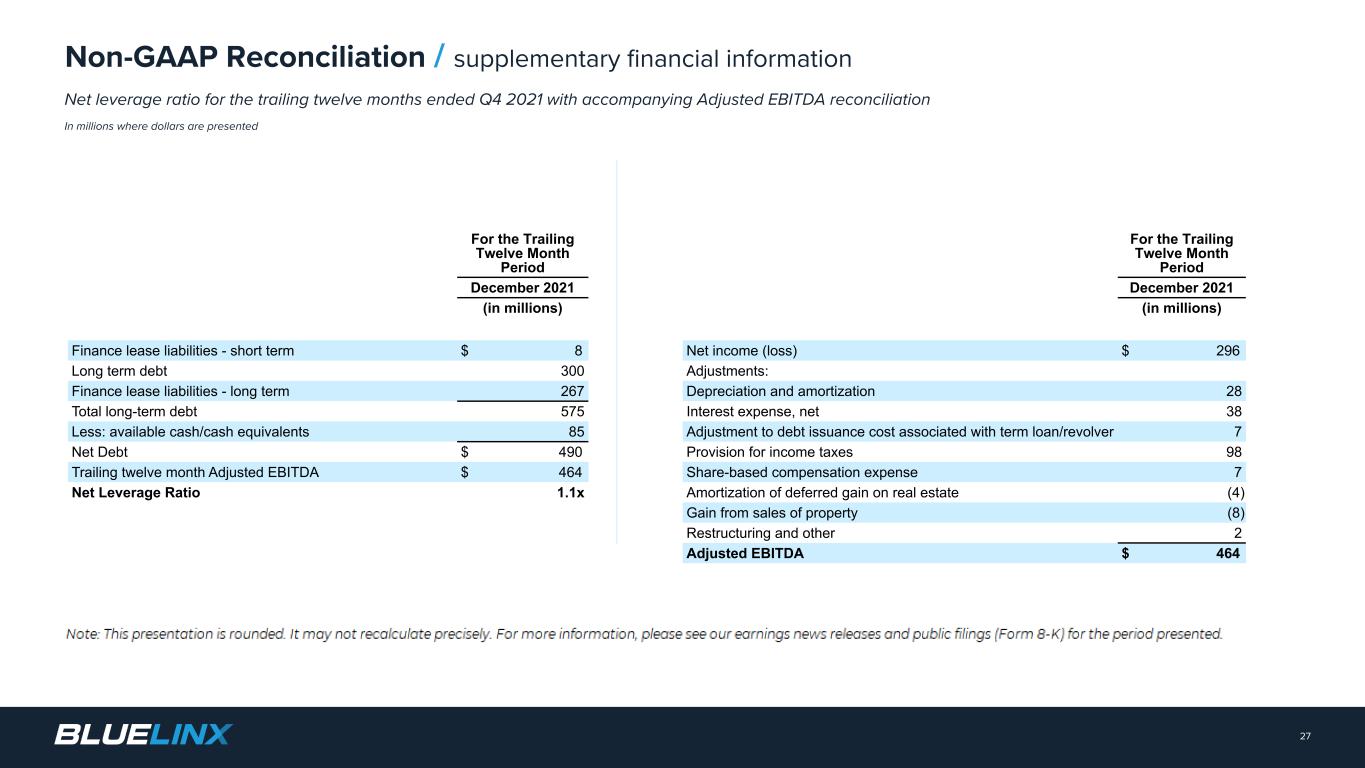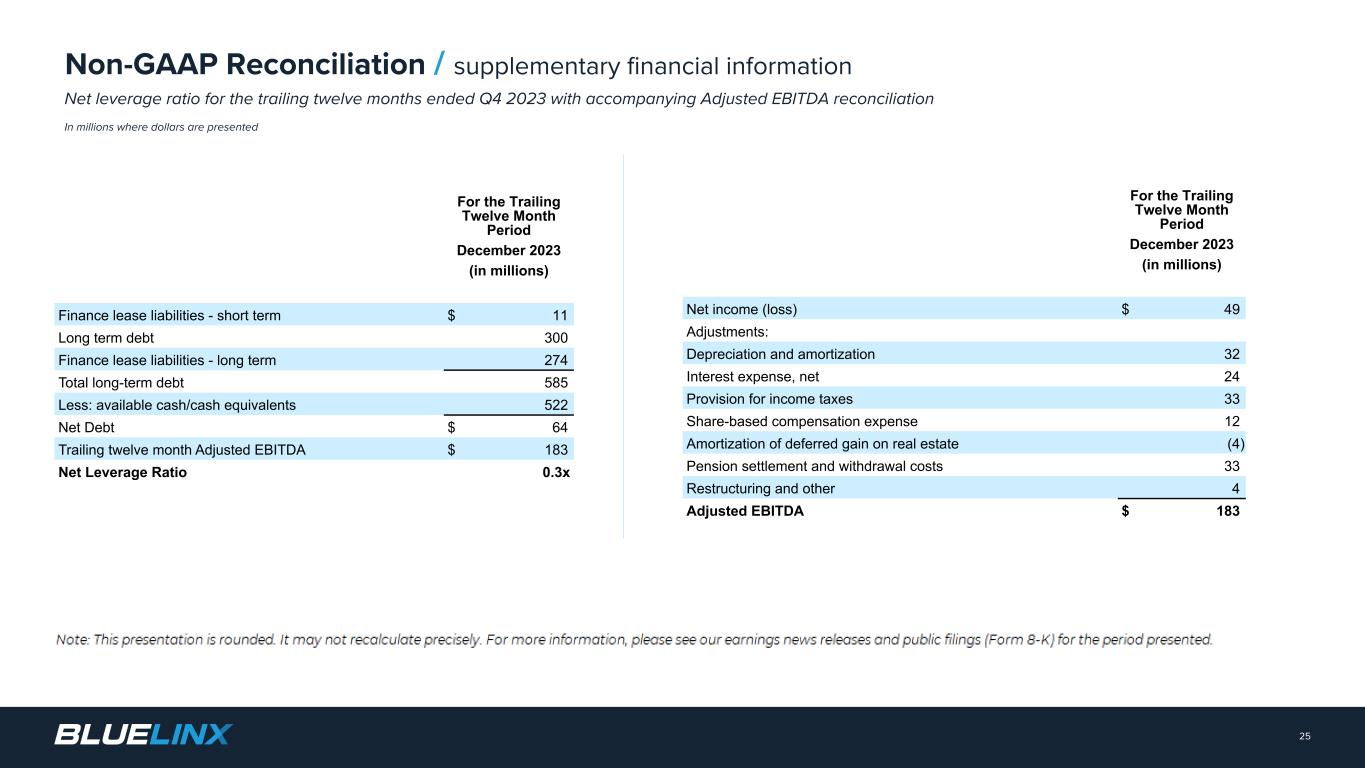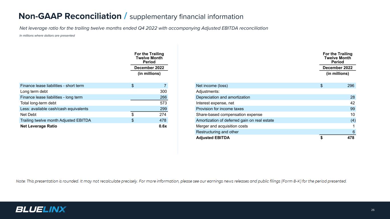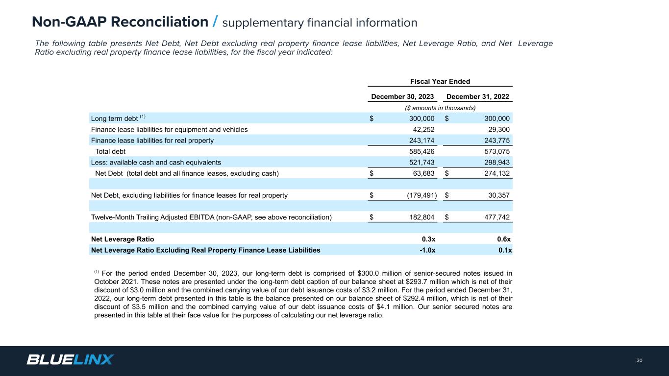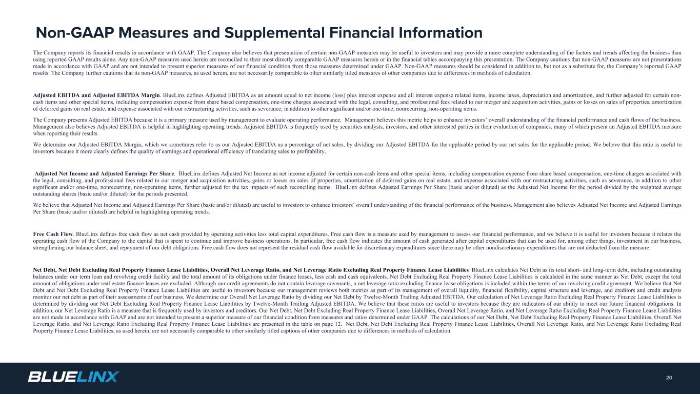 The Company reports its financial results in accordance with GAAP. The Company also believes that presentation of certain non-GAAP measures may be useful to investors and may provide a more complete understanding of the factors and trends affecting the business than using reported GAAP results alone. Any non-GAAP measures used herein are reconciled to their most directly comparable GAAP measures herein or in the financial tables accompanying this presentation. The Company cautions that non-GAAP measures are not presentations made in accordance with GAAP and are not intended to present superior measures of our financial condition from those measures determined under GAAP. Non-GAAP measures should be considered in addition to, but not as a substitute for, the Company’s reported GAAP results. The Company further cautions that its non-GAAP measures, as used herein, are not necessarily comparable to other similarly titled measures of other companies due to differences in methods of calculation. Adjusted EBITDA and Adjusted EBITDA Margin. BlueLinx defines Adjusted EBITDA as an amount equal to net income (loss) plus interest expense and all interest expense related items, income taxes, depreciation and amortization, and further adjusted for certain non- cash items and other special items, including compensation expense from share based compensation, one-time charges associated with the legal, consulting, and professional fees related to our merger and acquisition activities, gains or losses on sales of properties, amortization of deferred gains on real estate, and expense associated with our restructuring activities, such as severance, in addition to other significant and/or one-time, nonrecurring, non-operating items. The Company presents Adjusted EBITDA because it is a primary measure used by management to evaluate operating performance. Management believes this metric helps to enhance investors’ overall understanding of the financial performance and cash flows of the business. Management also believes Adjusted EBITDA is helpful in highlighting operating trends. Adjusted EBITDA is frequently used by securities analysts, investors, and other interested parties in their evaluation of companies, many of which present an Adjusted EBITDA measure when reporting their results. We determine our Adjusted EBITDA Margin, which we sometimes refer to as our Adjusted EBITDA as a percentage of net sales, by dividing our Adjusted EBITDA for the applicable period by our net sales for the applicable period. We believe that this ratio is useful to investors because it more clearly defines the quality of earnings and operational efficiency of translating sales to profitability. Adjusted Net Income and Adjusted Earnings Per Share. BlueLinx defines Adjusted Net Income as net income adjusted for certain non-cash items and other special items, including compensation expense from share based compensation, one-time charges associated with the legal, consulting, and professional fees related to our merger and acquisition activities, gains or losses on sales of properties, amortization of deferred gains on real estate, and expense associated with our restructuring activities, such as severance, in addition to other significant and/or one-time, nonrecurring, non-operating items, further adjusted for the tax impacts of such reconciling items. BlueLinx defines Adjusted Earnings Per Share (basic and/or diluted) as the Adjusted Net Income for the period divided by the weighted average outstanding shares (basic and/or diluted) for the periods presented. We believe that Adjusted Net Income and Adjusted Earnings Per Share (basic and/or diluted) are useful to investors to enhance investors’ overall understanding of the financial performance of the business. Management also believes Adjusted Net Income and Adjusted Earnings Per Share (basic and/or diluted) are helpful in highlighting operating trends. Free Cash Flow. BlueLinx defines free cash flow as net cash provided by operating activities less total capital expenditures. Free cash flow is a measure used by management to assess our financial performance, and we believe it is useful for investors because it relates the operating cash flow of the Company to the capital that is spent to continue and improve business operations. In particular, free cash flow indicates the amount of cash generated after capital expenditures that can be used for, among other things, investment in our business, strengthening our balance sheet, and repayment of our debt obligations. Free cash flow does not represent the residual cash flow available for discretionary expenditures since there may be other nondiscretionary expenditures that are not deducted from the measure. Net Debt, Net Debt Excluding Real Property Finance Lease Liabilities, Overall Net Leverage Ratio, and Net Leverage Ratio Excluding Real Property Finance Lease Liabilities. BlueLinx calculates Net Debt as its total short- and long-term debt, including outstanding balances under our term loan and revolving credit facility and the total amount of its obligations under finance leases, less cash and cash equivalents. Net Debt Excluding Real Property Finance Lease Liabilities is calculated in the same manner as Net Debt, except the total amount of obligations under real estate finance leases are excluded. Although our credit agreements do not contain leverage covenants, a net leverage ratio excluding finance lease obligations is included within the terms of our revolving credit agreement. We believe that Net Debt and Net Debt Excluding Real Property Finance Lease Liabilities are useful to investors because our management reviews both metrics as part of its management of overall liquidity, financial flexibility, capital structure and leverage, and creditors and credit analysts monitor our net debt as part of their assessments of our business. We determine our Overall Net Leverage Ratio by dividing our Net Debt by Twelve-Month Trailing