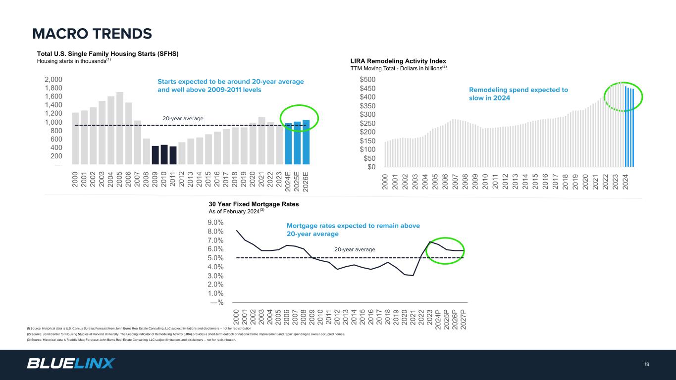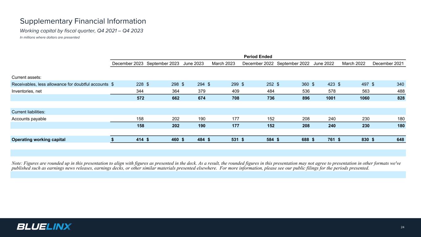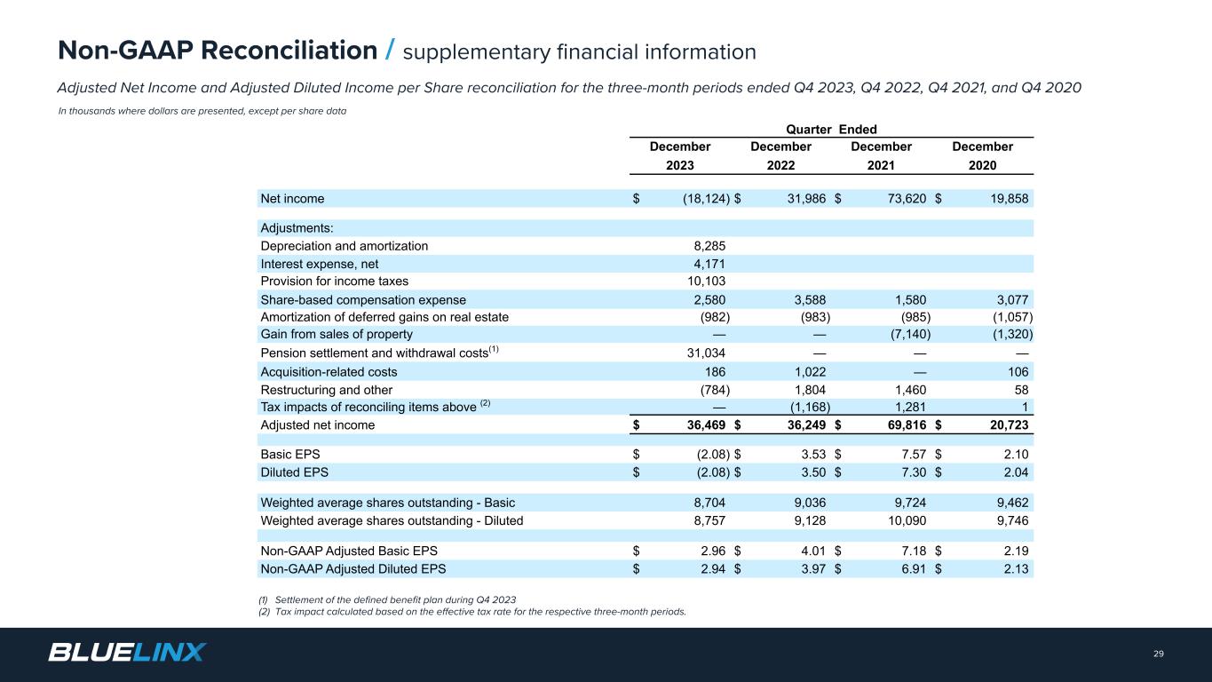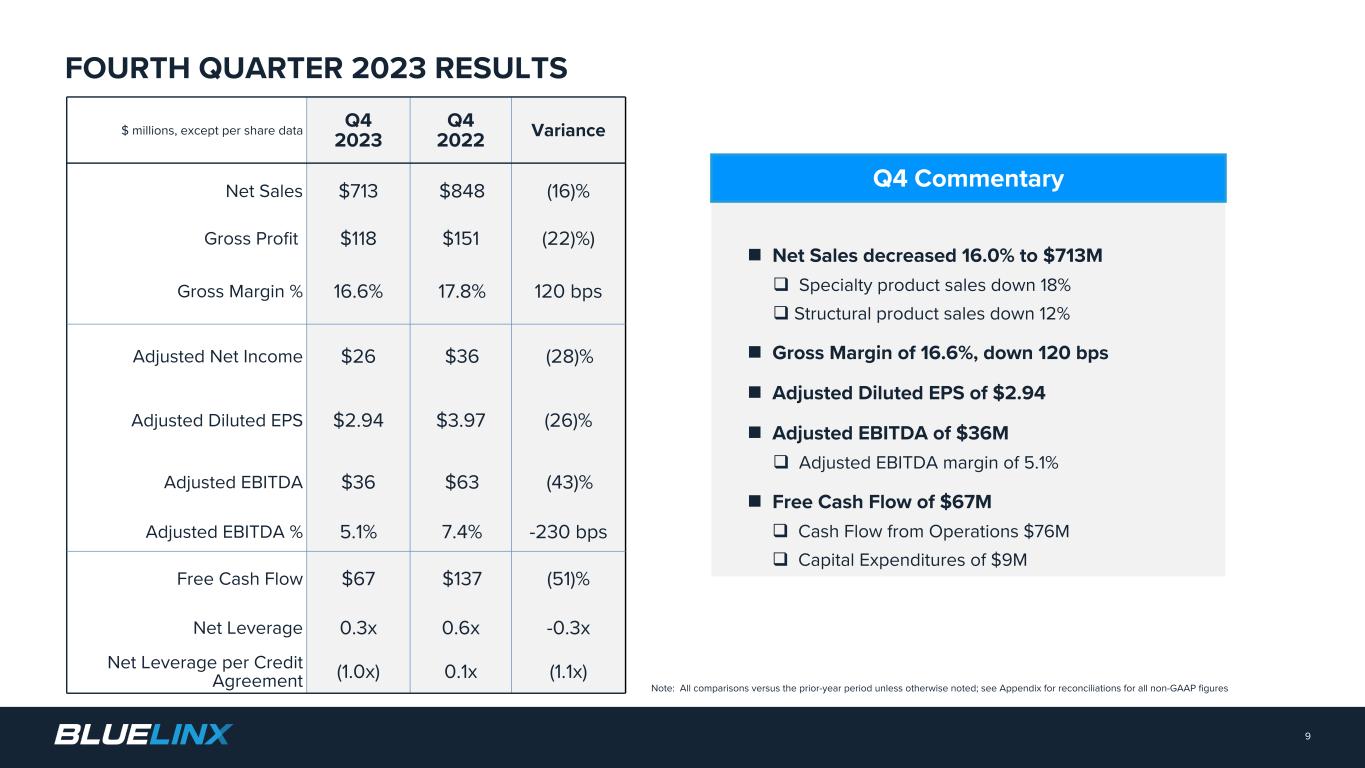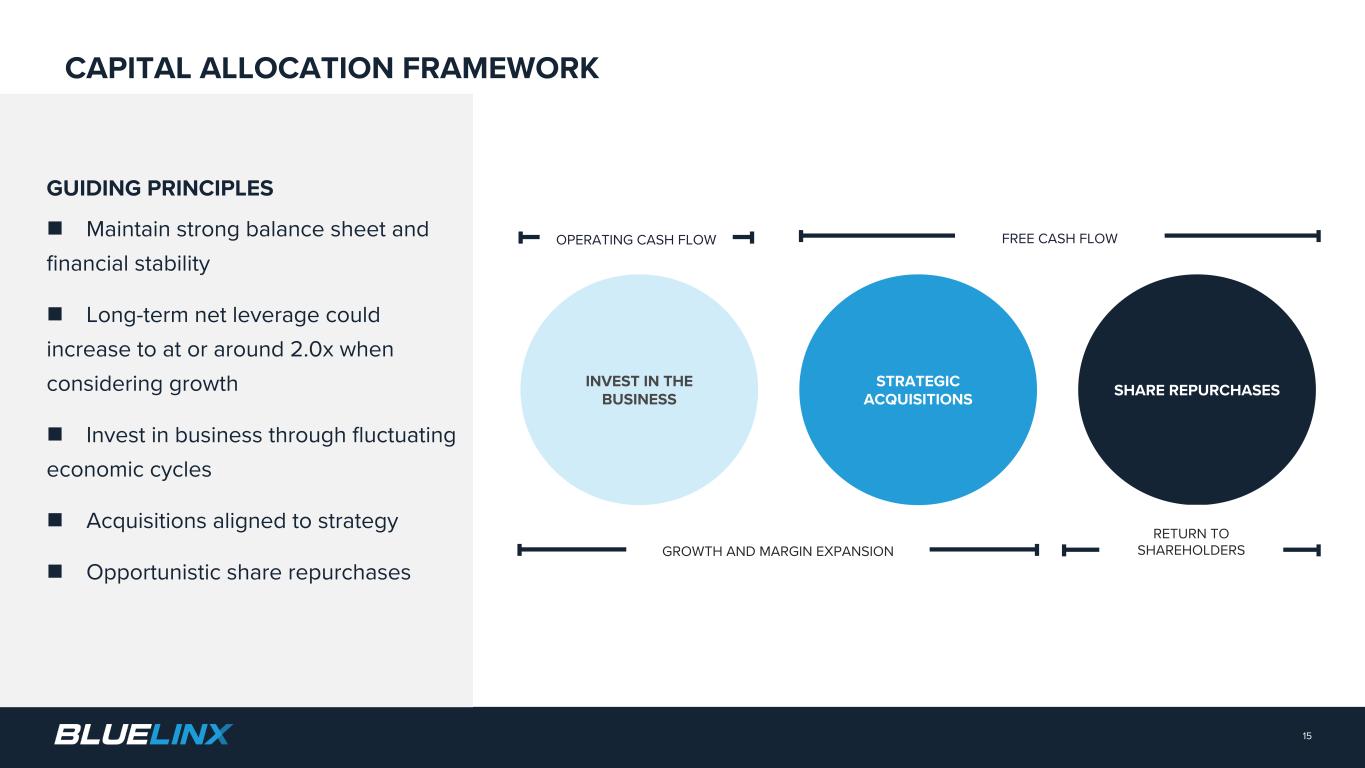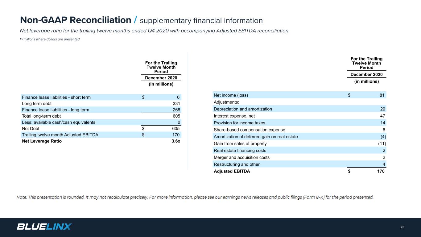 The Company reports its financial results in accordance with GAAP. The Company also believes that presentation of certain non-GAAP measures may be useful to investors and may provide a more complete understanding of the factors and trends affecting the business than using reported GAAP results alone. Any non-GAAP measures used herein are reconciled to their most directly comparable GAAP measures herein or in the financial tables accompanying this presentation. The Company cautions that non-GAAP measures are not presentations made in accordance with GAAP and are not intended to present superior measures of our financial condition from those measures determined under GAAP. Non-GAAP measures should be considered in addition to, but not as a substitute for, the Company’s reported GAAP results. The Company further cautions that its non-GAAP measures, as used herein, are not necessarily comparable to other similarly titled measures of other companies due to differences in methods of calculation. Adjusted EBITDA and Adjusted EBITDA Margin. BlueLinx defines Adjusted EBITDA as an amount equal to net income (loss) plus interest expense and all interest expense related items, income taxes, depreciation and amortization, and further adjusted for certain non- cash items and other special items, including compensation expense from share based compensation, one-time charges associated with the legal, consulting, and professional fees related to our merger and acquisition activities, gains or losses on sales of properties, amortization of deferred gains on real estate, and expense associated with our restructuring activities, such as severance, in addition to other significant and/or one-time, nonrecurring, non-operating items. The Company presents Adjusted EBITDA because it is a primary measure used by management to evaluate operating performance. Management believes this metric helps to enhance investors’ overall understanding of the financial performance and cash flows of the business. Management also believes Adjusted EBITDA is helpful in highlighting operating trends. Adjusted EBITDA is frequently used by securities analysts, investors, and other interested parties in their evaluation of companies, many of which present an Adjusted EBITDA measure when reporting their results. We determine our Adjusted EBITDA Margin, which we sometimes refer to as our Adjusted EBITDA as a percentage of net sales, by dividing our Adjusted EBITDA for the applicable period by our net sales for the applicable period. We believe that this ratio is useful to investors because it more clearly defines the quality of earnings and operational efficiency of translating sales to profitability. Adjusted Net Income and Adjusted Earnings Per Share. BlueLinx defines Adjusted Net Income as net income adjusted for certain non-cash items and other special items, including compensation expense from share based compensation, one-time charges associated with the legal, consulting, and professional fees related to our merger and acquisition activities, gains or losses on sales of properties, amortization of deferred gains on real estate, and expense associated with our restructuring activities, such as severance, in addition to other significant and/or one-time, nonrecurring, non-operating items, further adjusted for the tax impacts of such reconciling items. BlueLinx defines Adjusted Earnings Per Share (basic and/or diluted) as the Adjusted Net Income for the period divided by the weighted average outstanding shares (basic and/or diluted) for the periods presented. We believe that Adjusted Net Income and Adjusted Earnings Per Share (basic and/or diluted) are useful to investors to enhance investors’ overall understanding of the financial performance of the business. Management also believes Adjusted Net Income and Adjusted Earnings Per Share (basic and/or diluted) are helpful in highlighting operating trends. Free Cash Flow. BlueLinx defines free cash flow as net cash provided by operating activities less total capital expenditures. Free cash flow is a measure used by management to assess our financial performance, and we believe it is useful for investors because it relates the operating cash flow of the Company to the capital that is spent to continue and improve business operations. In particular, free cash flow indicates the amount of cash generated after capital expenditures that can be used for, among other things, investment in our business, strengthening our balance sheet, and repayment of our debt obligations. Free cash flow does not represent the residual cash flow available for discretionary expenditures since there may be other nondiscretionary expenditures that are not deducted from the measure. Net Debt, Net Debt Excluding Real Property Finance Lease Liabilities, Overall Net Leverage Ratio, and Net Leverage Ratio Excluding Real Property Finance Lease Liabilities. BlueLinx calculates Net Debt as its total short- and long-term debt, including outstanding balances under our term loan and revolving credit facility and the total amount of its obligations under finance leases, less cash and cash equivalents. Net Debt Excluding Real Property Finance Lease Liabilities is calculated in the same manner as Net Debt, except the total amount of obligations under real estate finance leases are excluded. Although our credit agreements do not contain leverage covenants, a net leverage ratio excluding finance lease obligations is included within the terms of our revolving credit agreement. We believe that Net Debt and Net Debt Excluding Real Property Finance Lease Liabilities are useful to investors because our management reviews both metrics as part of its management of overall liquidity, financial flexibility, capital structure and leverage, and creditors and credit analysts monitor our net debt as part of their assessments of our business. We determine our Overall Net Leverage Ratio by dividing our Net Debt by Twelve-Month Trailing