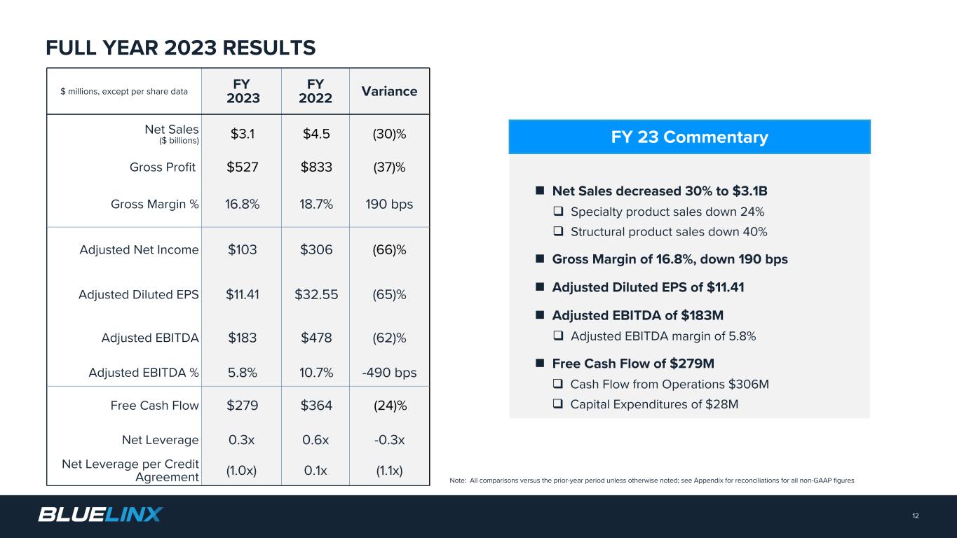 ($ millions) n Net sales of $226M, down 12% q Driven mainly by deflation q Year-over-year average pricing for commodities was mixed: 15% decrease in average price of lumber 11% increase in average price of panels n Gross profit of $24M, down 10% q Structural gross profit 20% of total gross profit n Gross margin of 10.6%, up 20 bps q Above expectation of 9% to 10% Q4 Commentary 11 STRUCTURAL PRODUCTS Q4 2023 RESULTS $331 $534 $452 $336 $256 $230 $245 $251 $22616.1% 20.0% 4.7% 11.3% 10.4% 11.7% 11.0% 11.3% 10.6% Net Sales GM Rate 4Q21 1Q22 2Q22 3Q22 4Q22 1Q23 2Q23 3Q23 4Q23