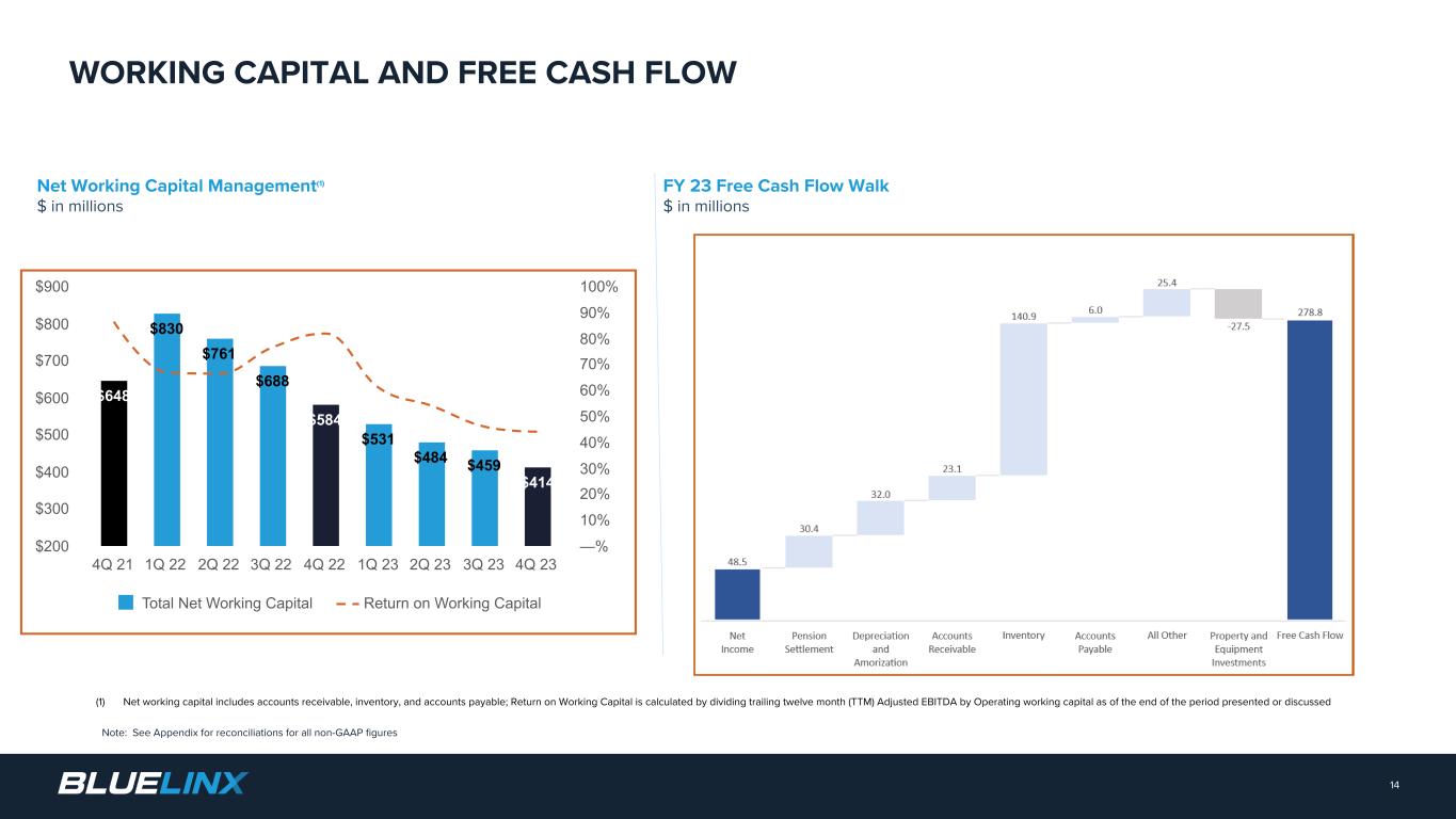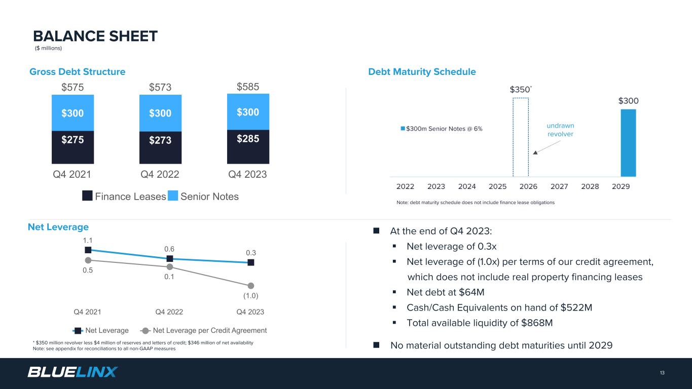 n Net Sales decreased 30% to $3.1B q Specialty product sales down 24% q Structural product sales down 40% n Gross Margin of 16.8%, down 190 bps n Adjusted Diluted EPS of $11.41 n Adjusted EBITDA of $183M q Adjusted EBITDA margin of 5.8% n Free Cash Flow of $279M q Cash Flow from Operations $306M q Capital Expenditures of $28M 12 FULL YEAR 2023 RESULTS Note: All comparisons versus the prior-year period unless otherwise noted; see Appendix for reconciliations for all non-GAAP figures FY 23 Commentary $ millions, except per share data FY 2023 FY 2022 Variance Net Sales ($ billions) $3.1 $4.5 (30)% Gross Profit $527 $833 (37)% Gross Margin % 16.8% 18.7% 190 bps Adjusted Net Income $103 $306 (66)% Adjusted Diluted EPS $11.41 $32.55 (65)% Adjusted EBITDA $183 $478 (62)% Adjusted EBITDA % 5.8% 10.7% -490 bps Free Cash Flow $279 $364 (24)% Net Leverage 0.3x 0.6x -0.3x Net Leverage per Credit Agreement (1.0x) 0.1x (1.1x)